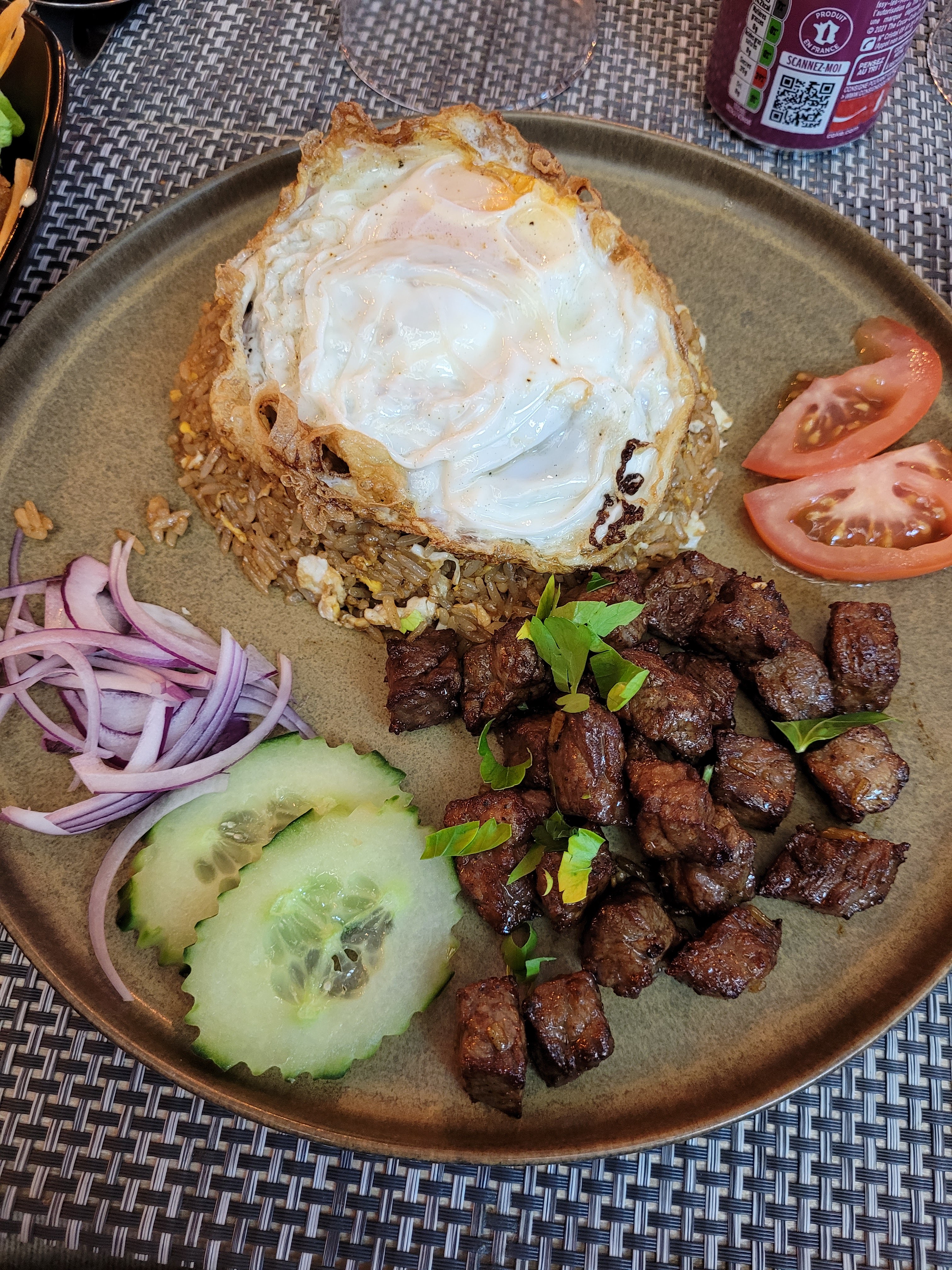 Dans l’ensemble c’était bon, +1 pour les dynamites poulet, mais concernant le loc lac la recette du riz a été revisité 😖 alors que la vrai recette se fait avec du concentré de tomates.
