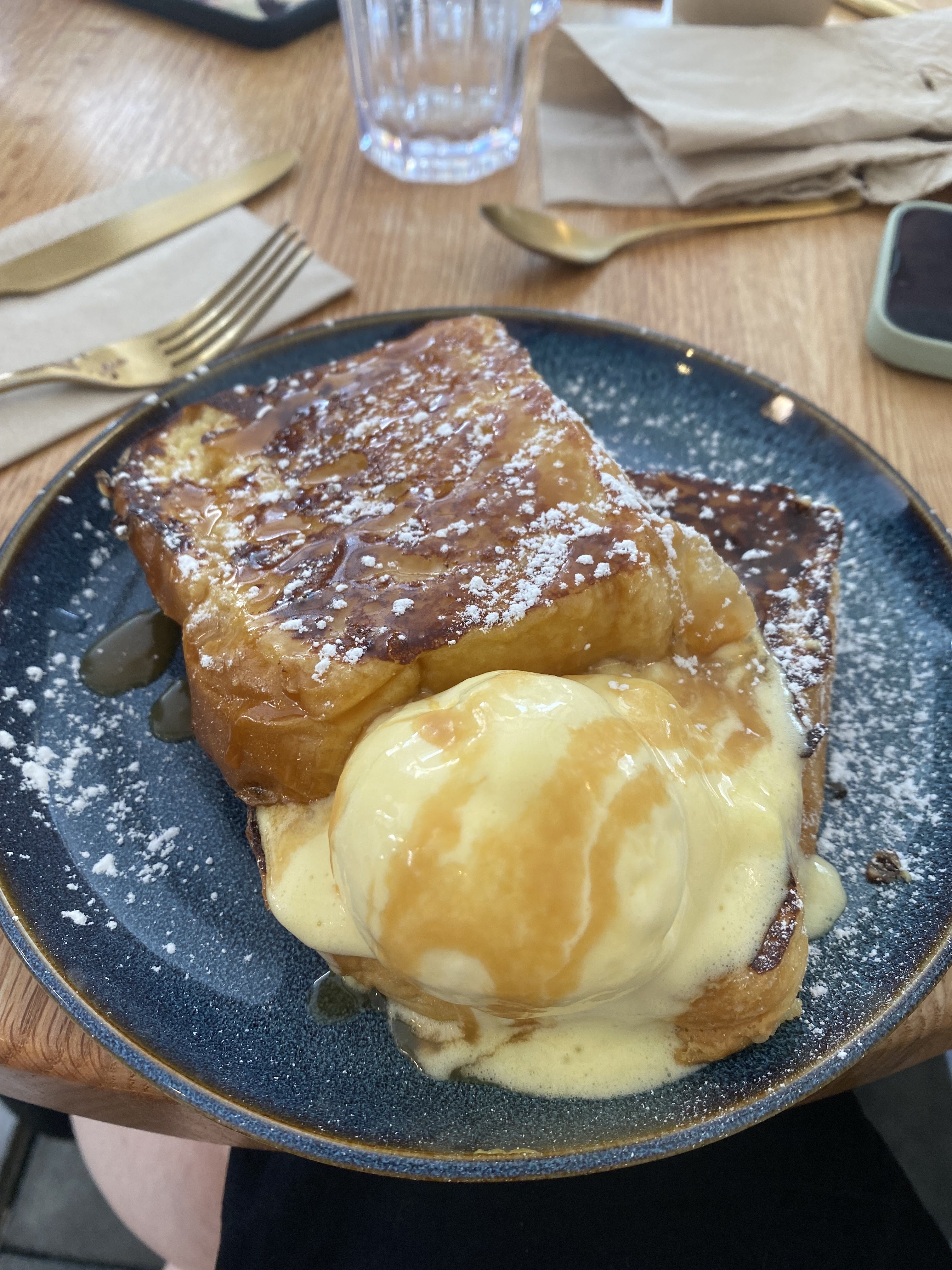 La carte est variée et offre des plats pour tous les goûts. Pancakes, des gaufres, avocado toast accompagnés de jus pressés. C’est à la fois coloré et gourmand, la cuisine allie une approche saine, avec des légumes et des fruits frais. Tout est préparé maison, avec des ingrédients frais et biologiques, et même leur jus sont faits maison. L’expérience atteint le summum lorsqu’on passe au sucré avec le pain perdu caramel beurre salé et la glace vanille, moelleux à souhait. On se régale des délices tous aussi gourmands les uns que les autres !