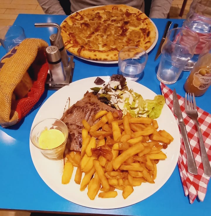 Bonne nourriture pour un prix raisonnable. Nous avons eu une salade de chèvre et de pommes et une soupe de légumes en entrée et une pizza kebab et un steak en plat principal. Le personnel est très sympathique et nous a aidé à traduire le menu. Nous reviendrons bientôt!
