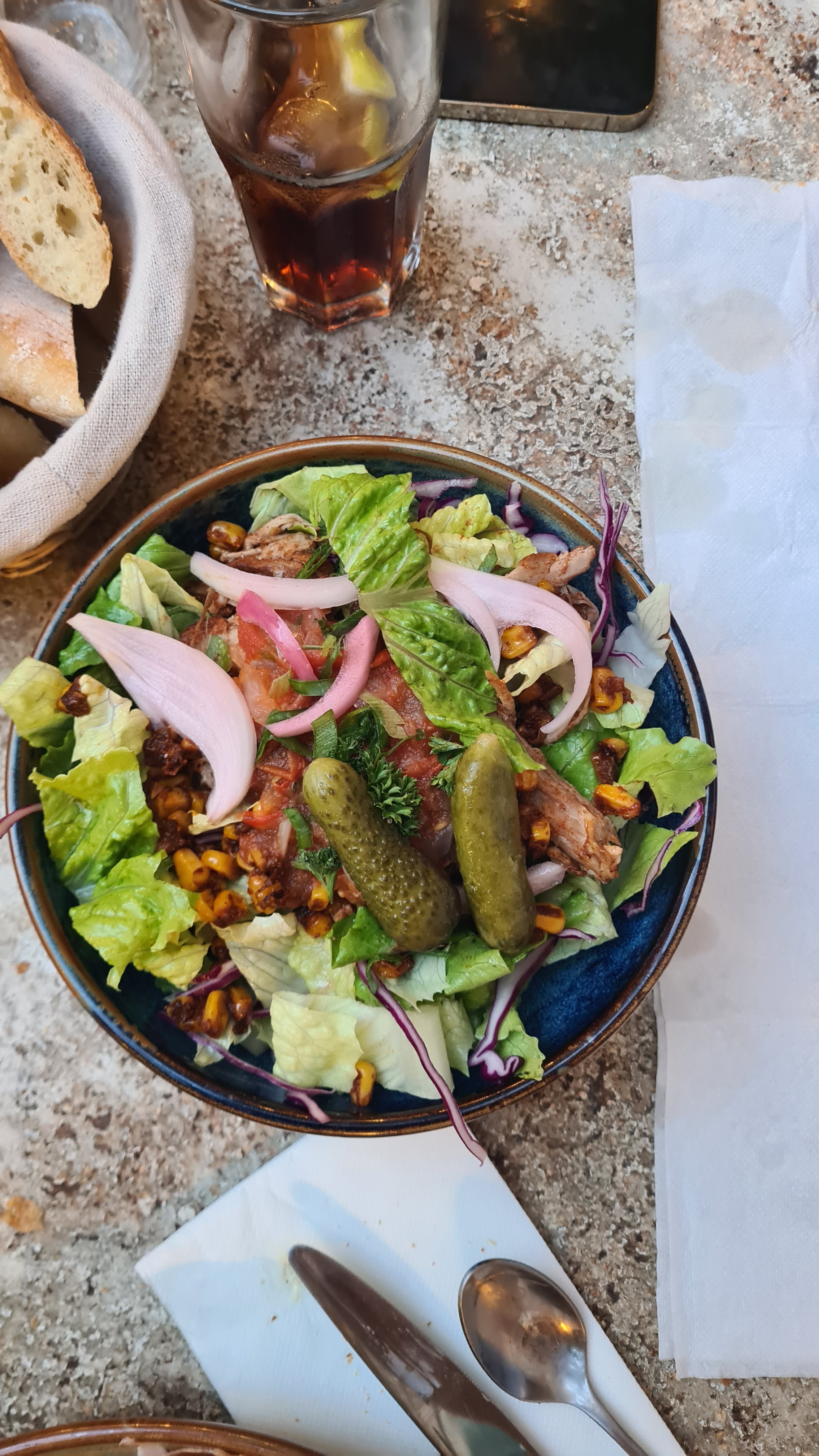 Cadre et serveurs agréables. Salades rafraichissantes. En revanche, boissons sans goût et desserts très décevants (la base du cheesecake était tellement dur que les morceaux étaient projetés hors de l'assiette, mon vêtement blanc s'en souvient encore et gardera des traces...).