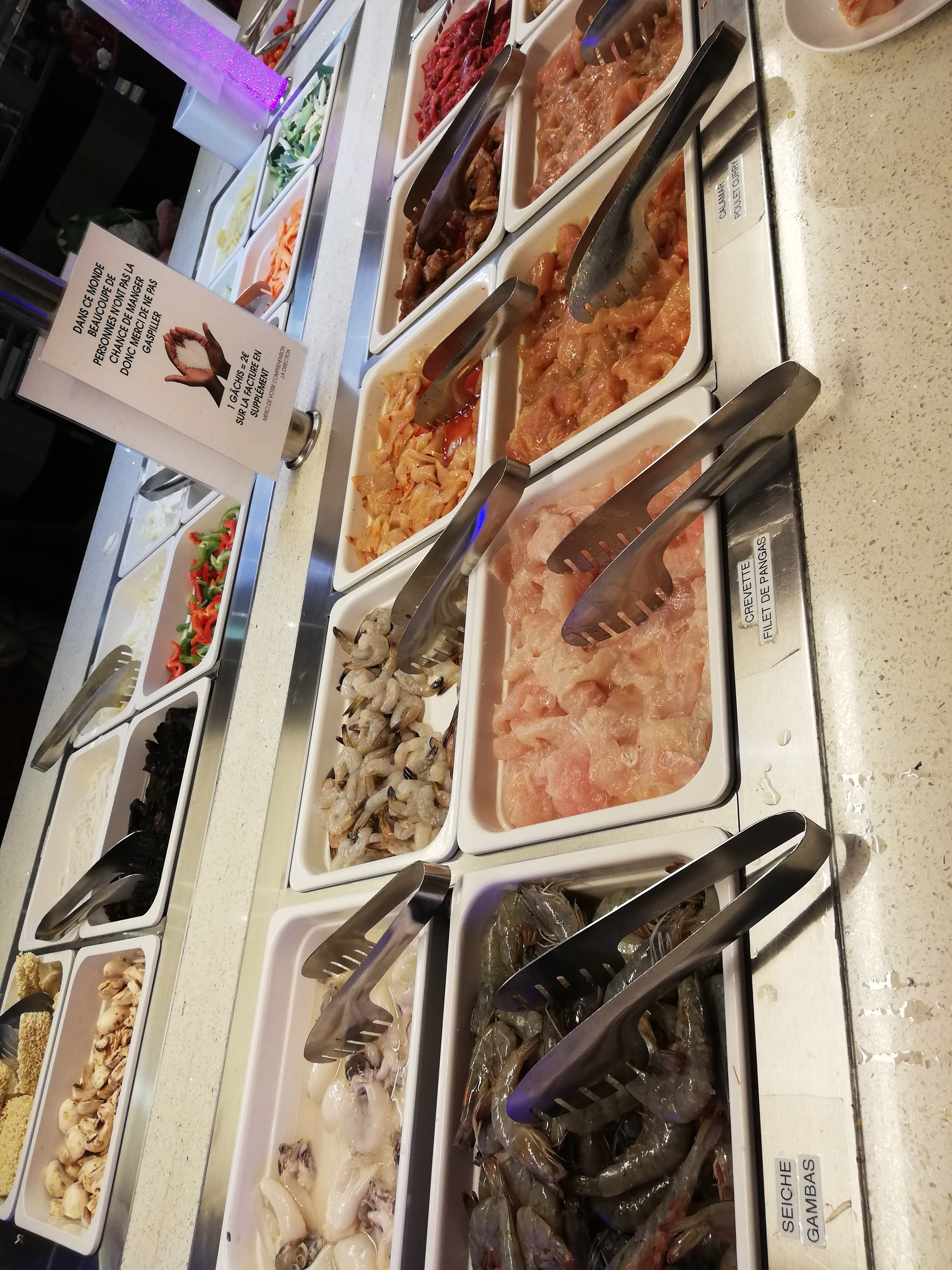 Menu soir adulte a 19.90, buffet a volonté, plancha sur les tables pour faire revenir les crustacés/légumes crus. Franchement le resto est très bon et personnellement je trouve qu'il y a du choix. Plats chinois/japonais.