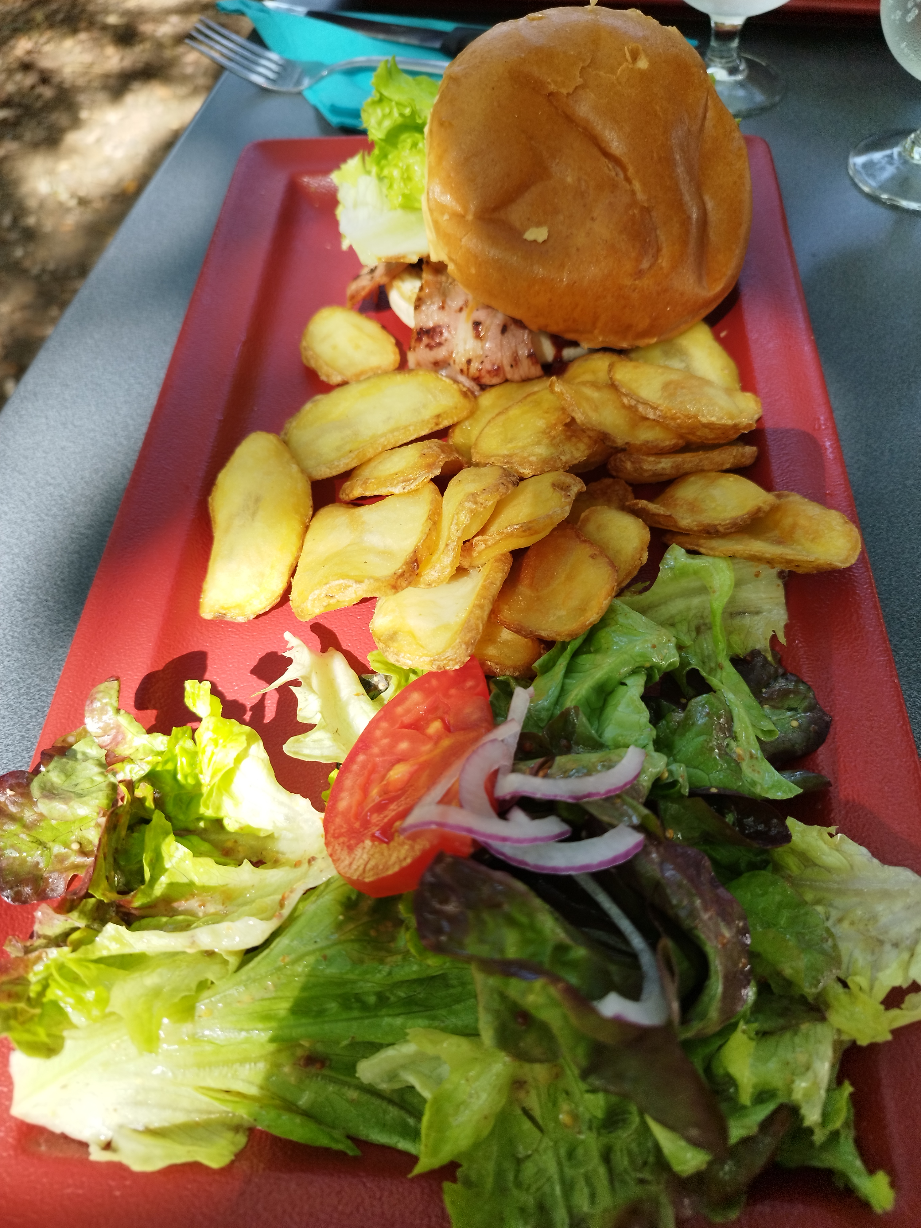 Bel endroit avec une nourriture savoureuse. Sauce BBQ maison très savoureuse sur le hamburger. Terrasse à l'ombre sous les arbres.