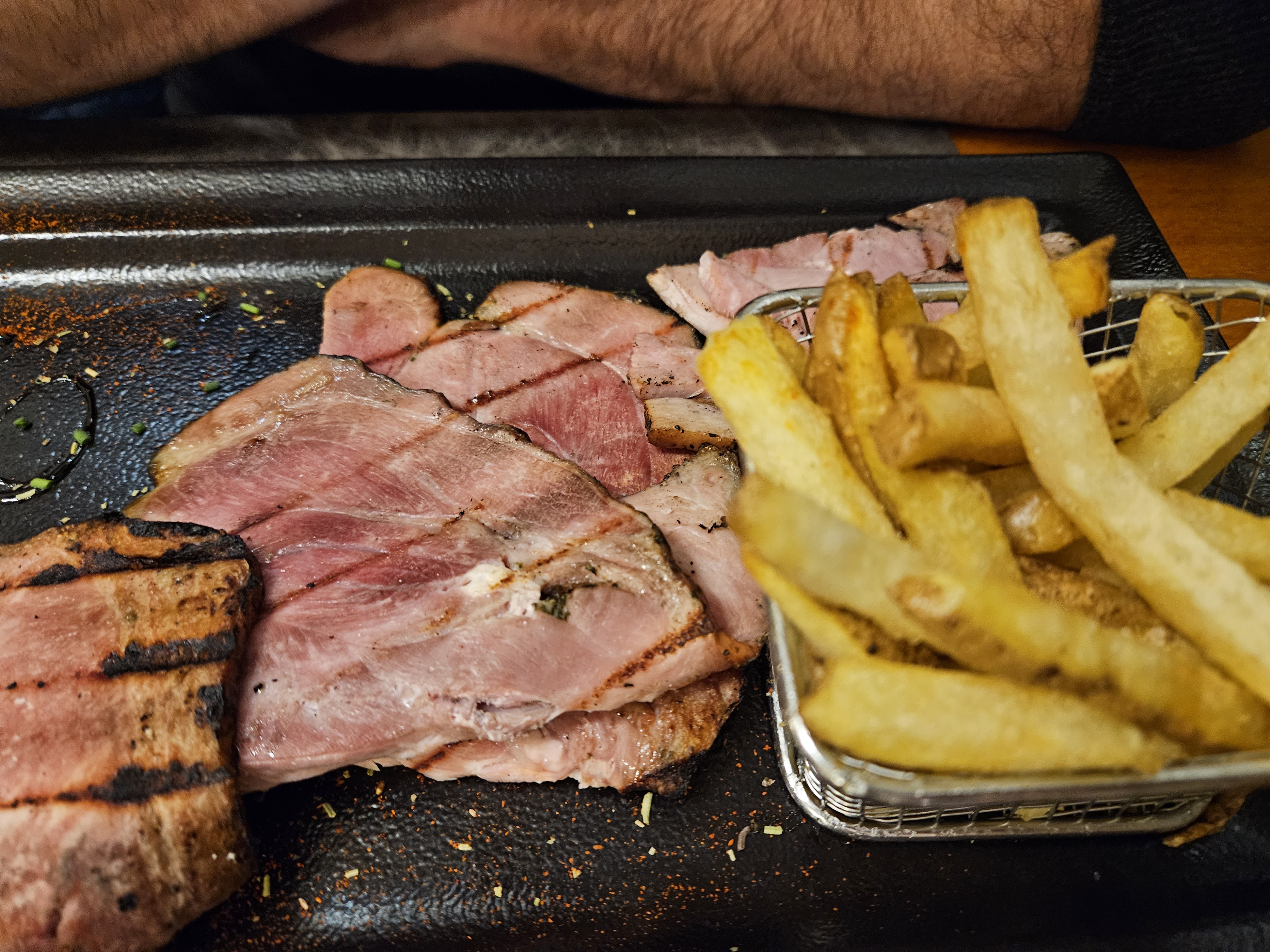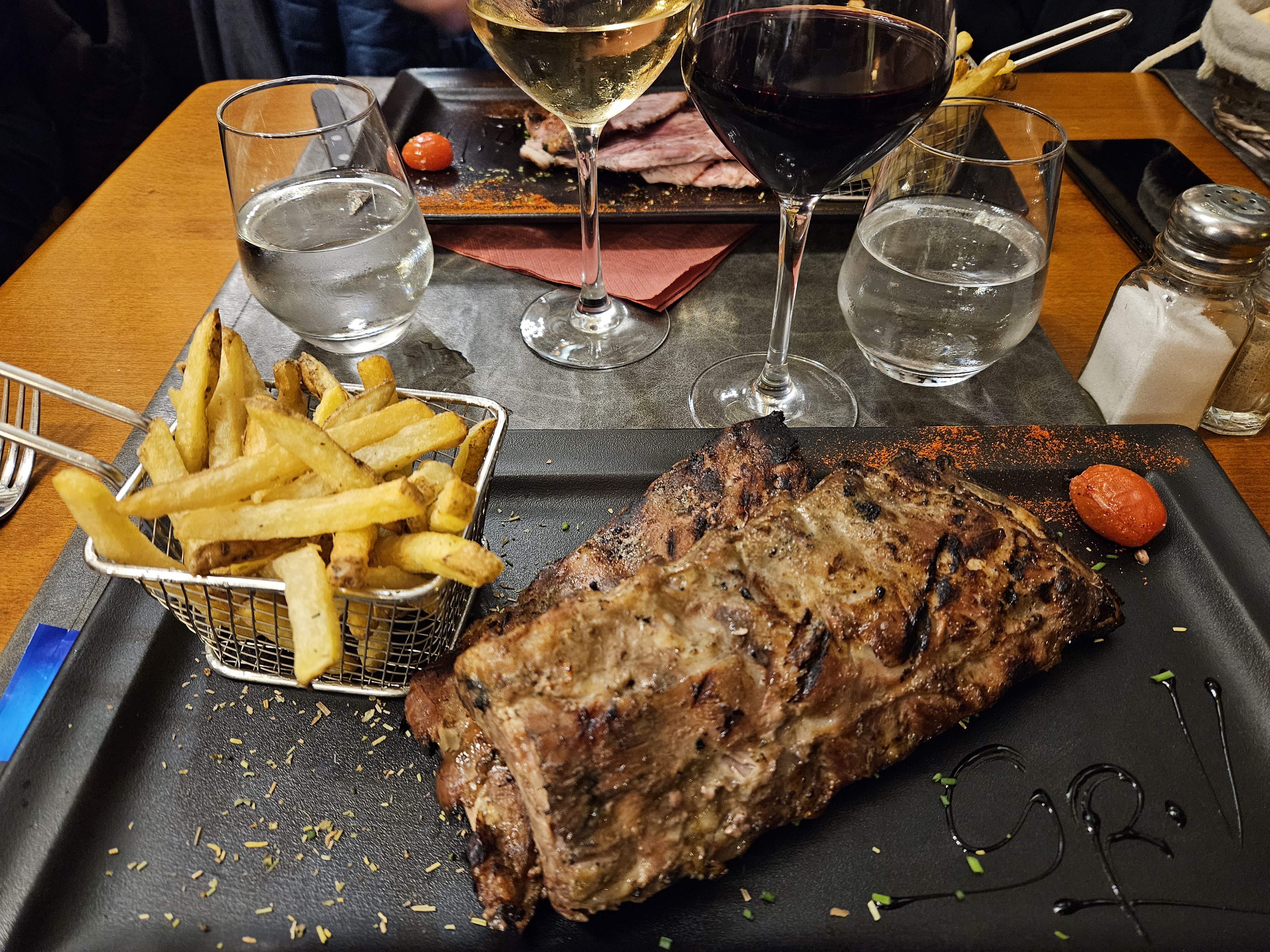 Nous étions deux et malheureusement deux malades. Moi j'ai vomi les ribbs 30min après le départ du restaurant et ma copine a été malade 2 jours. Le restaurant manque de lumière on ne voit pas ce que l'on mange dommage. Les luminaires en dessus des tables mériteraient un bon coup de plumeau et à d'autres endroits en hauteur aussi. Sinon la serveuse était très souriante et c'est sympa de voir la viande cuire.