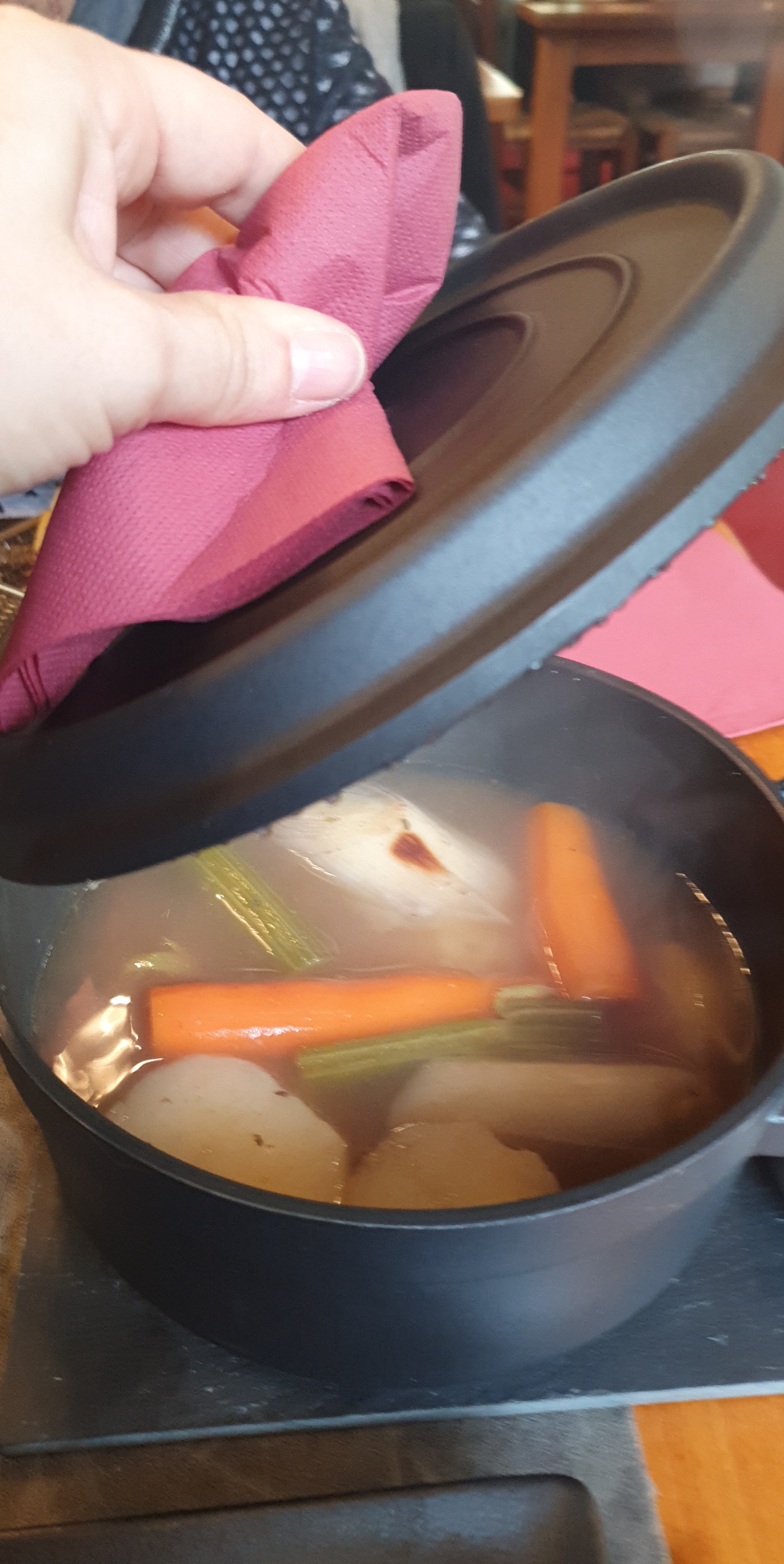 Repas simple et copieux. Serveurs agréables même si ils portent le masque sous le nez. En même temps il faut dire que le patron ne montre pas l'exemple. Ce Monsieur ne se gène pas de porter le siens sous le menton (lorsqu'il l'a) durant le service alors qu'il sert des plats aux clients et fait des allers et venues entre les tables. Quelle fut pas notre stupéfaction lorsque nous avons vu que les tables étaient simplement nettoyées avec un chiffon humide sans produit. Dommage que les règles d'hygiène ne soient pas respectées, nous n'avons pas pu profiter de notre repas sereinement.