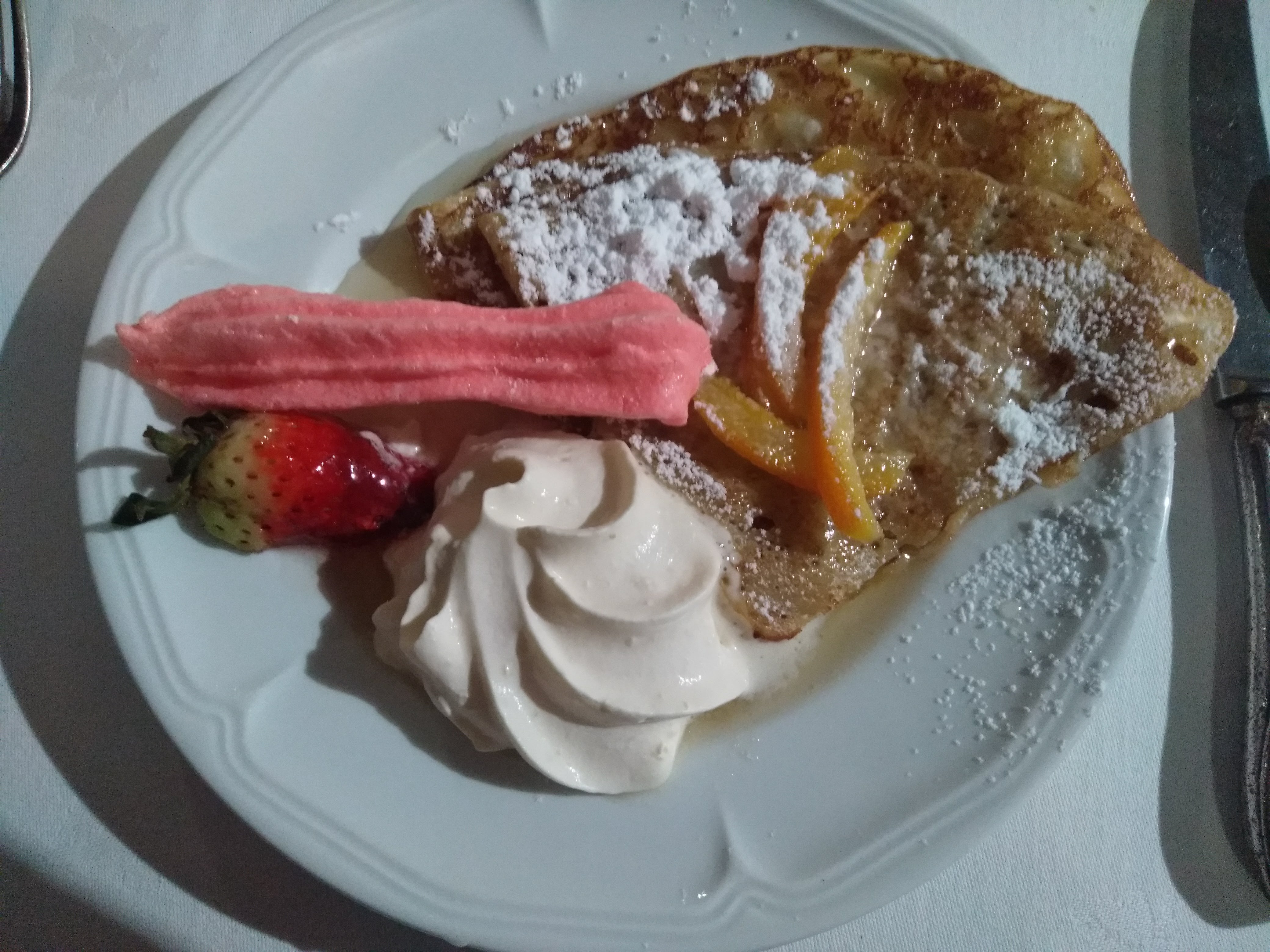 Accueil sympa, mais, des grosses arêtes dans le carpaccio de saumon, observations faites à la serveuse qui en rit, 1ère bouteille de vin, bouchonnée mais changée sans problème, des frites immangeables, une crème brûlée, certainement ancienne.