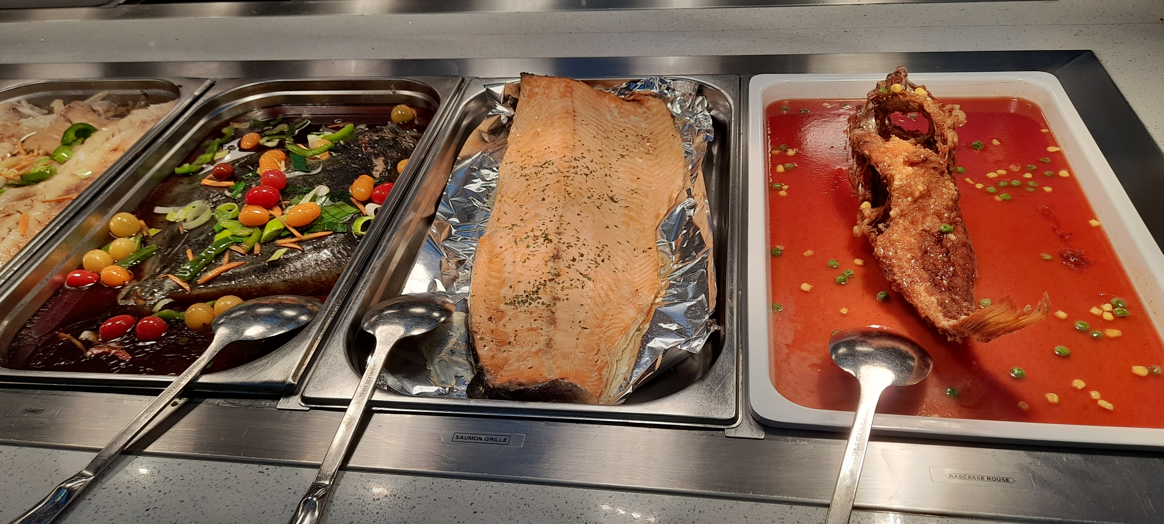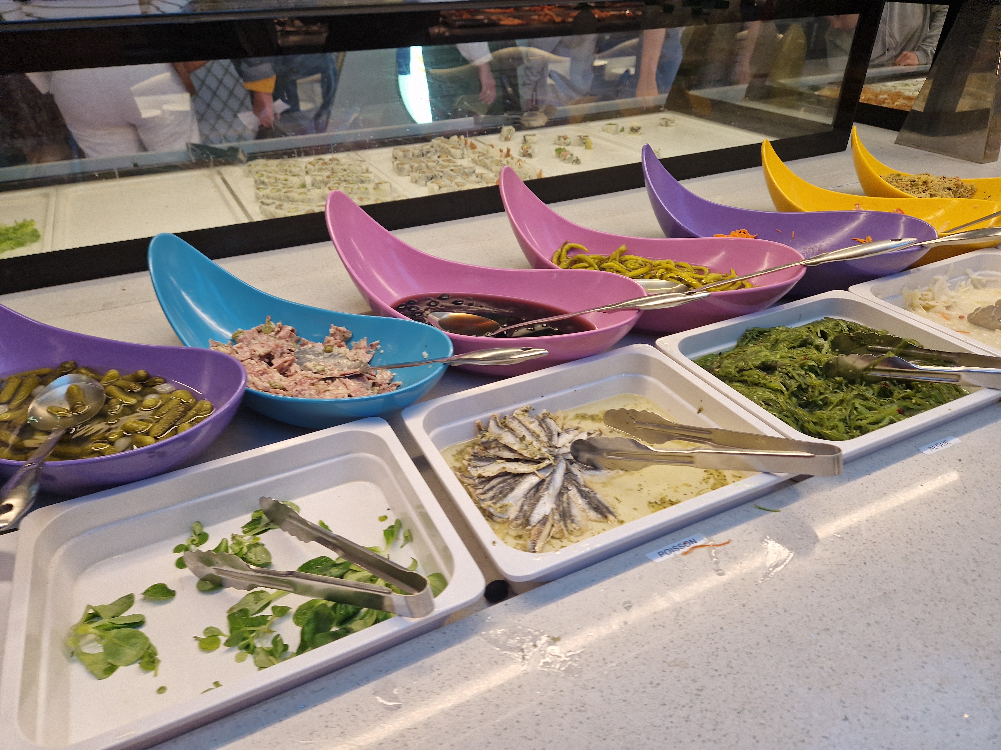 Un vaste choix de produits asiatiques, restauration pratique pour que chacun y trouve son compte, et des fruits de mer frais également. Grande proposition de fruits frais en dessert. On déplorera l’occidentalisation des présentoirs : frites, pain, fourchette, sans parler du ketchup, des bonbons, canelés et autres macarons…