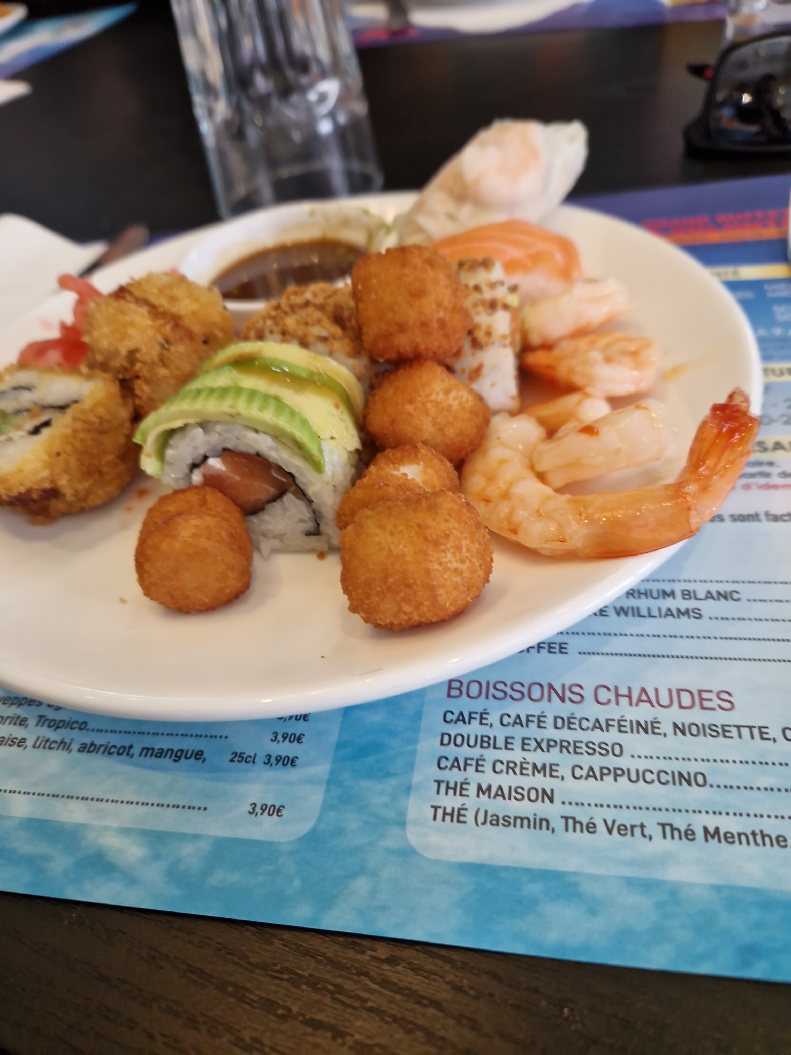 Différentes variétés de sushis pour un buffet à volonté, les cocktails maison sont délicieux, et vaste choix de plats chauds et desserts. Paiement ANCV acceptés