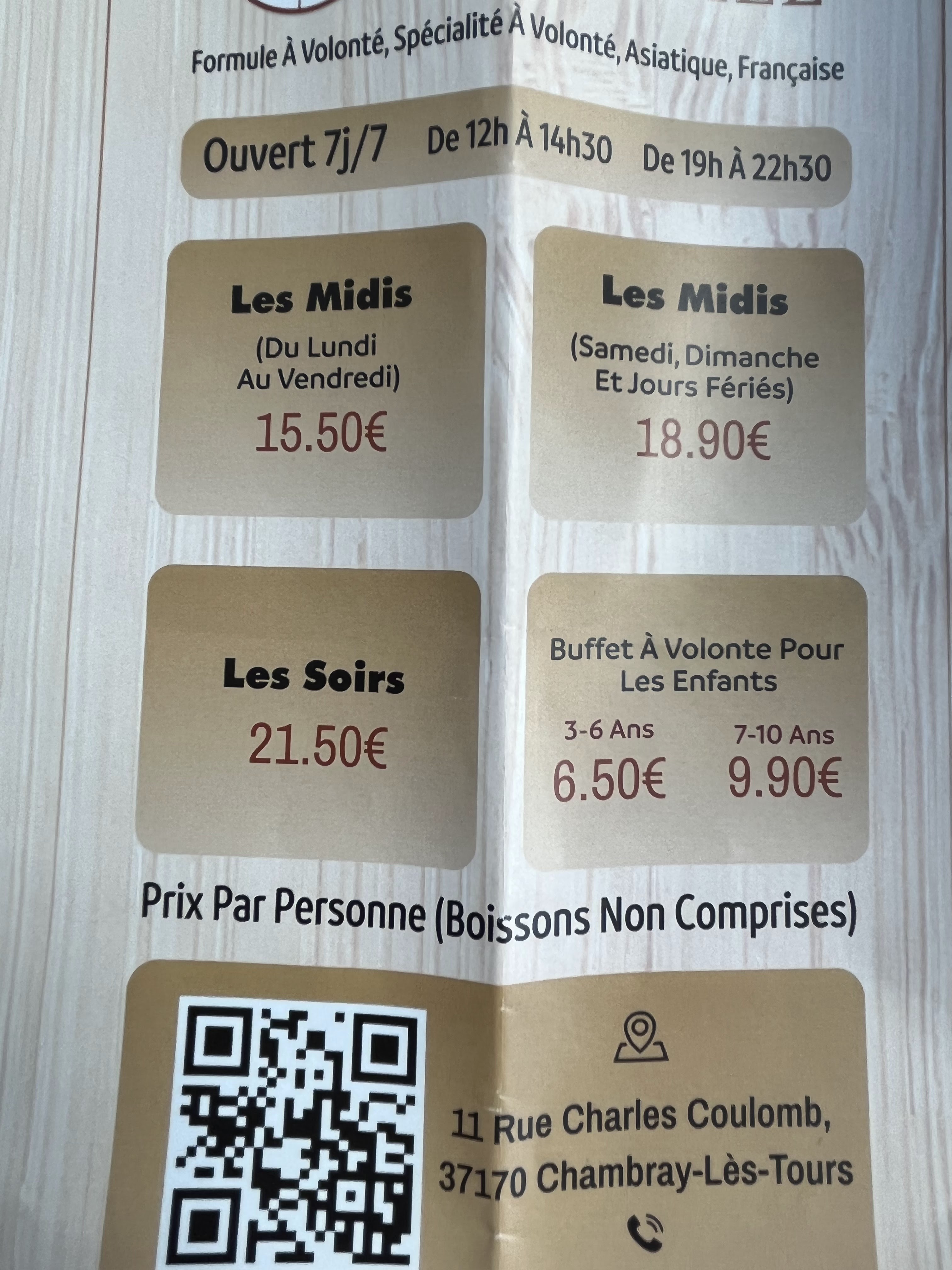 🗓MAI 2022📆 💢Du jour au lendemain💢 (au 1er degré) ⚠️📈Augmentation des prix de 2~3€ 📊⚠️ ⚠️Arrêt de plat à emporter⚠️ 🙅♂️ Malgré tout aucun change qualitatif, gustatif, et sur la variété des produits. 💁♂️Je me faisais un plaisir de recommander cette adresse ce n’est plus le cas aujourd’hui. 🤦♂️Ce buffet avait un meilleur rapport qualité prix ! dans la zone tourangelle mais Désormais c’est tout l’inverse. Du jour au lendemain, le midi à 15,5€ et 18,9€ en WE, les soirs à 21,5€. ✅A ce prix là je recommande : LES BONNE GRILLADES de Tours NORD ✅ l’Indochine à Tours centre ✅ Très grande variété de choix pour les mêmes prix !!!