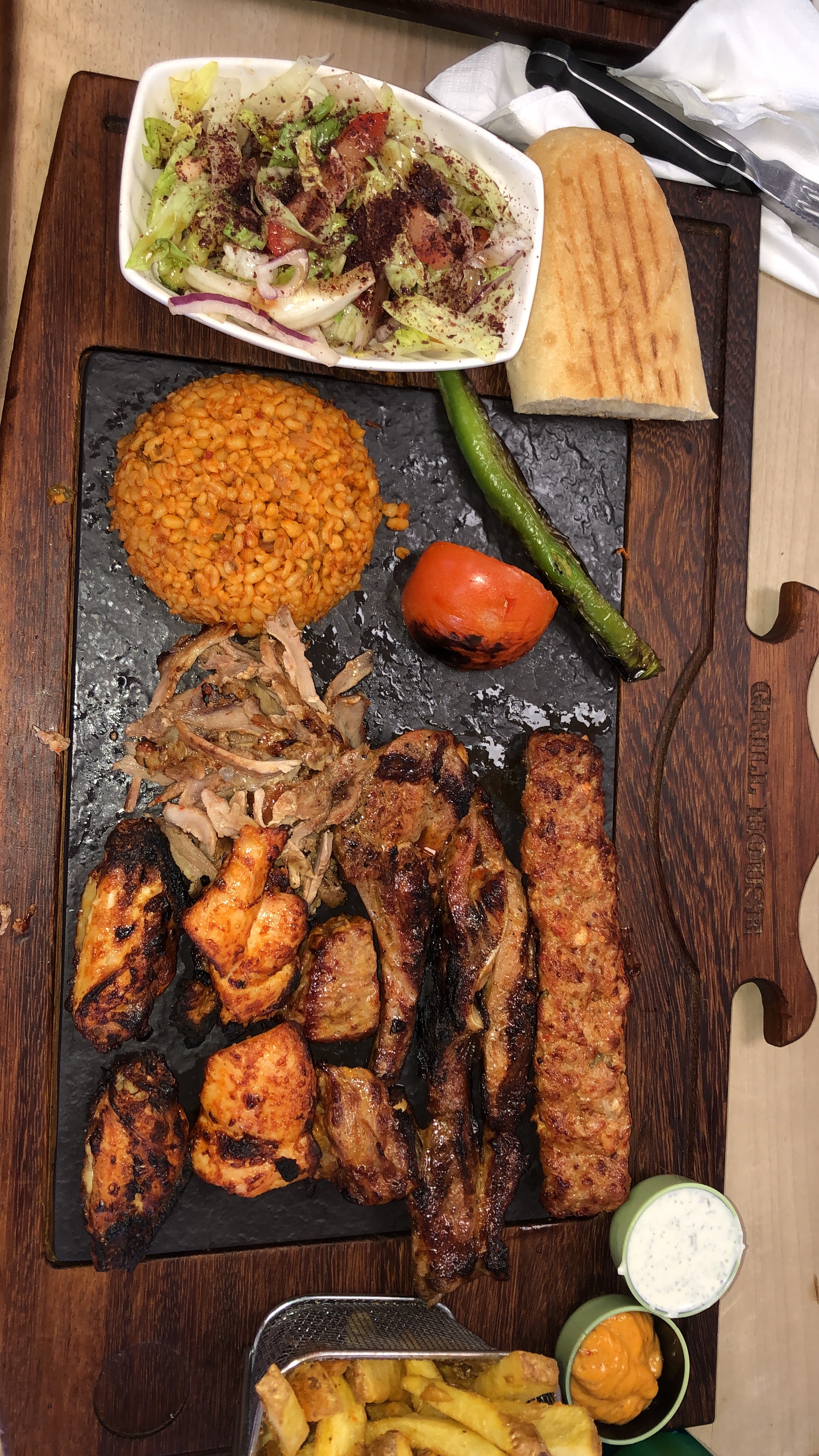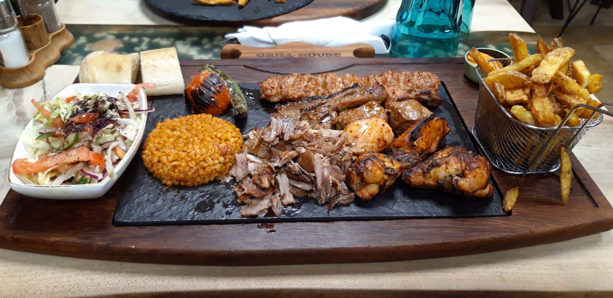 J’ai été pour iftar avec ma femme , le service était impeccable, l’accueil était hyper chaleureux . Maintenant parlons de l’assiette mixte, l’assiette one man show. La viande très bien grillée et la saveur du frite .. Franchement je recommande grille house