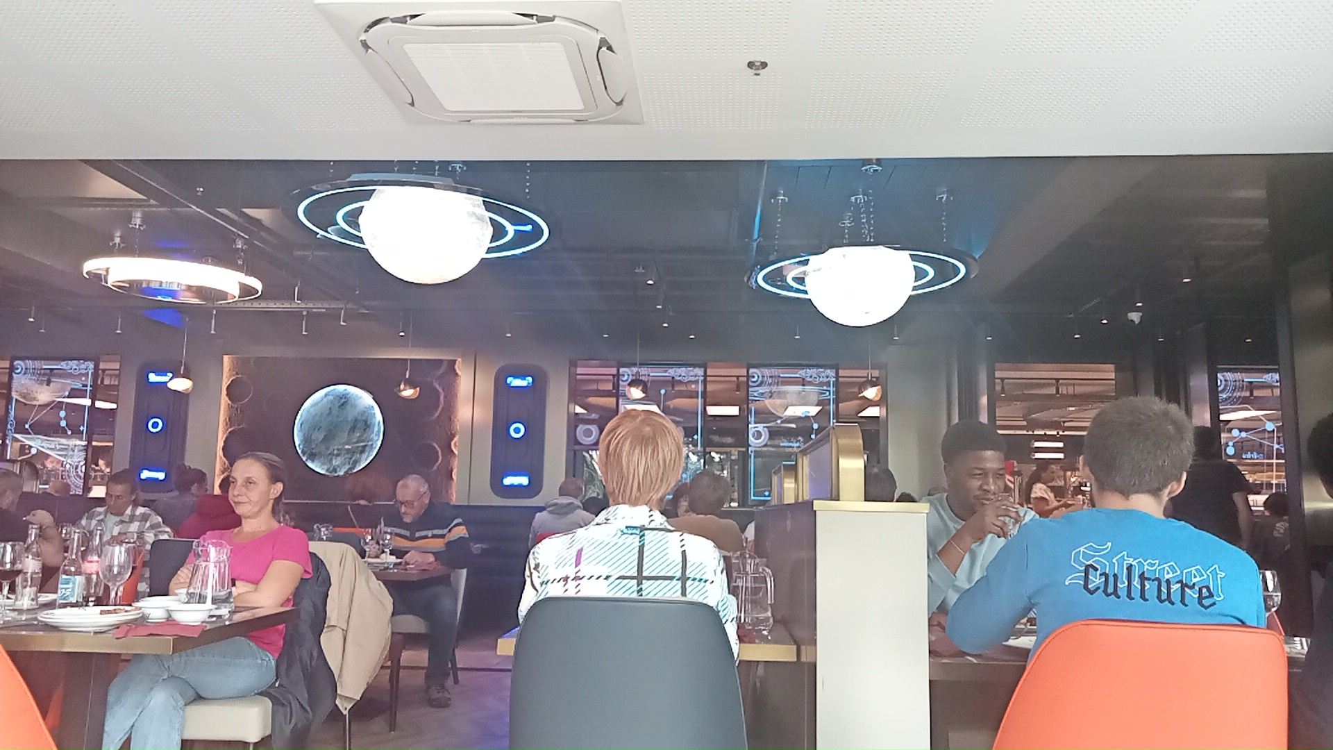 Jolie déco sur les planètes et les constellations. Un choix varié de plats, qui ne sont pas mauvais. Restaurant spacieux et les serveurs sont gentils.