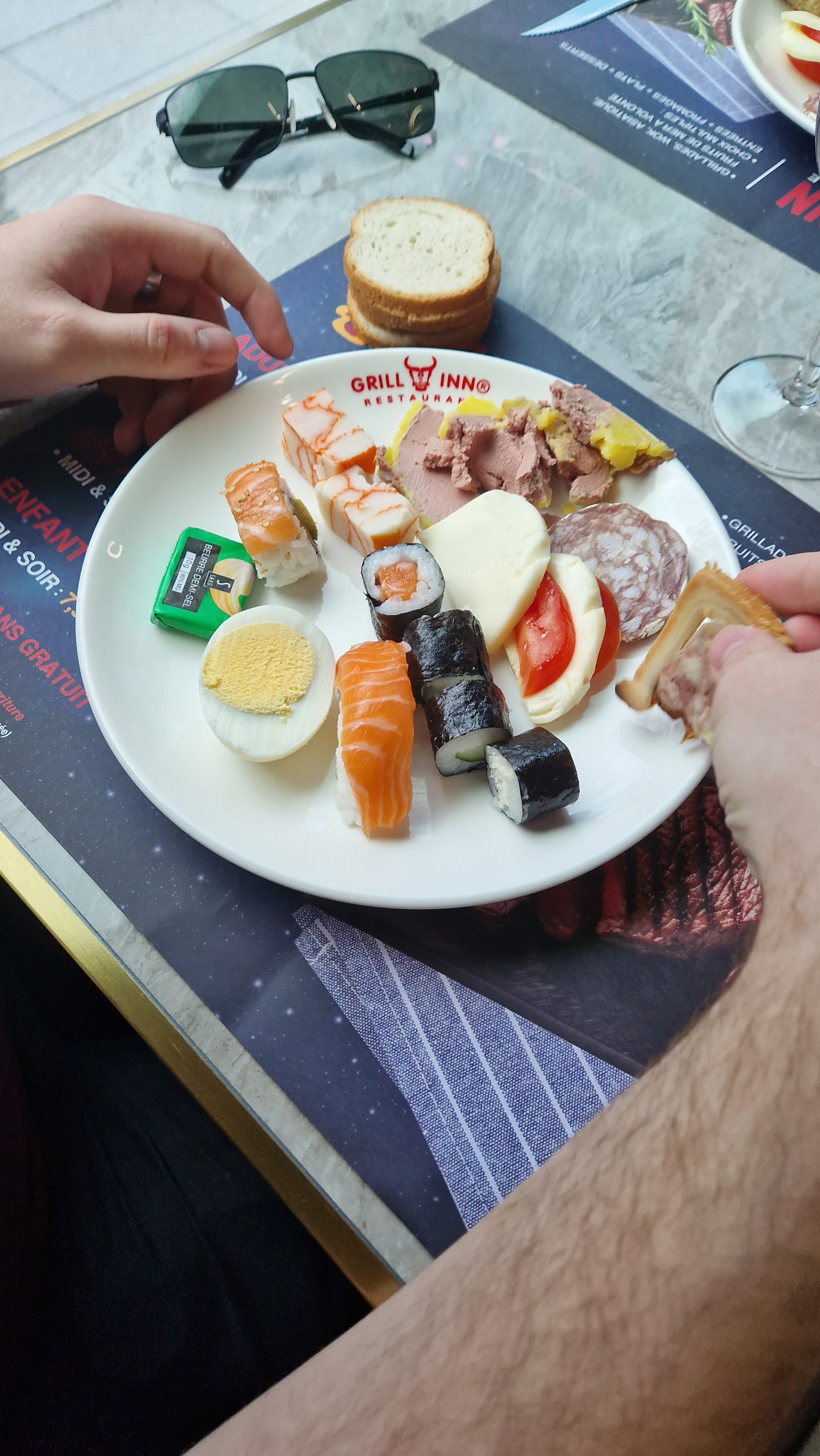 Nous étions 2, en couple un midi en semaine. Le cadre La décoration est très jolie, les sièges confortables et la vue jolie. Nous ne sommes pas empilés avec les autres clients et nous pouvons alors discuter tranquillement sans entendre les discussions des autres et inversement. L'accueil Très souriants, agréables ! Rien a dire 🙏 Le buffet / la cuisine Il y a en effet énormément de choix dans ce buffet, grill'in a fait le choix de proposer de la diversité a défaut de la qualité. Certains plats sont des excellentes surprises avec un goût unique. D'autres, sont forcément plus décevants. Également, le fait de proposer beaucoup de choix fait que, fatalement, moins de rotation sont faites ce qui peut altérer la qualité produit. Les vapeurs par exemple se retrouvent trop cuites rapidement ; le riz peut sécher, les fruits en sirop rider un peu. Concernant les tarifs, le midi est raisonnable le soir est assez cher. Dans l'ensemble je recommande d'essayer pour trouver les plats qui vous plaisent ou pour emmener des personnes dont vous ne connaissez pas trop les goûts, pour trouver votre assortiment de plat a prendre a chaque fois !👍👍👍