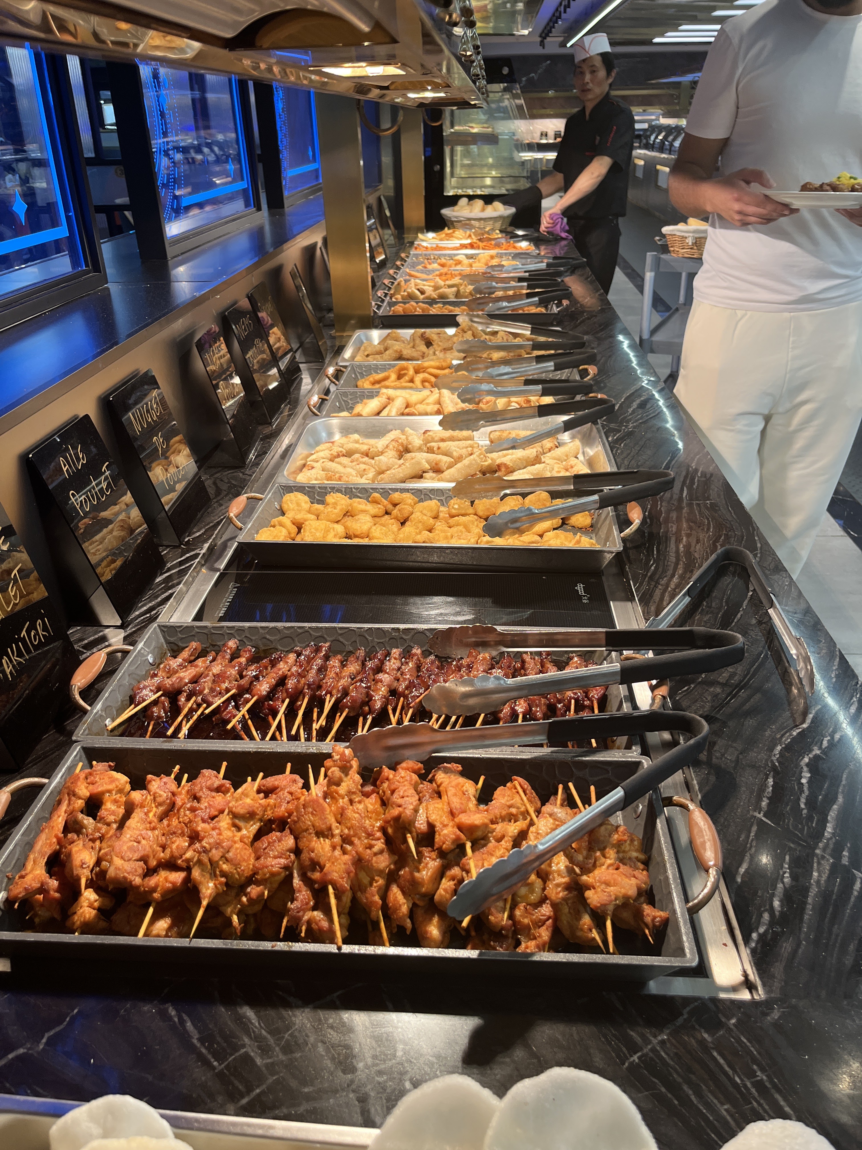 Ambiance incroyable le thème es très bien choisi et la déco est magnifique. Il y a beaucoup de choix mais les viandes prêtes sont mal cuites,il manque aussi d'instruction et la qualité de la viande n'est pas folle mais le reste que se soit sushi,nems... sont excellents je vous le conseille si vous cherchez un bon buffet a volonté ici vous conviendra parfaitement.