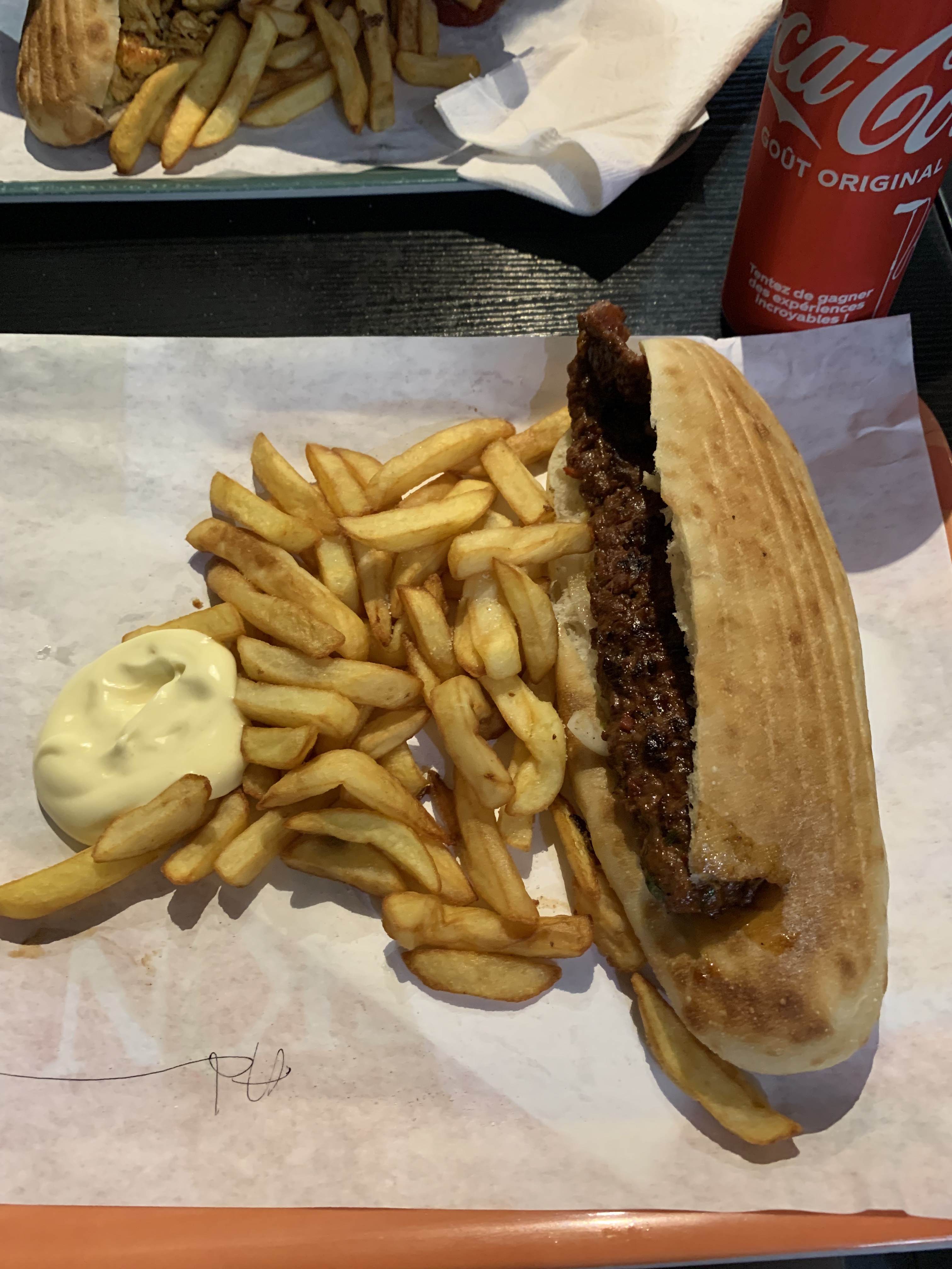 Personnel pas du tout aimable nous force à nous assoir à côté des toilettes ouverte, frite congelé dans mon plat et un cheveux dans celui de mon copain. Pas de choix de sauce et la viande est sec et dure. 9,50€ pour ça c’est inacceptable, Je ne recommande pas du tout !