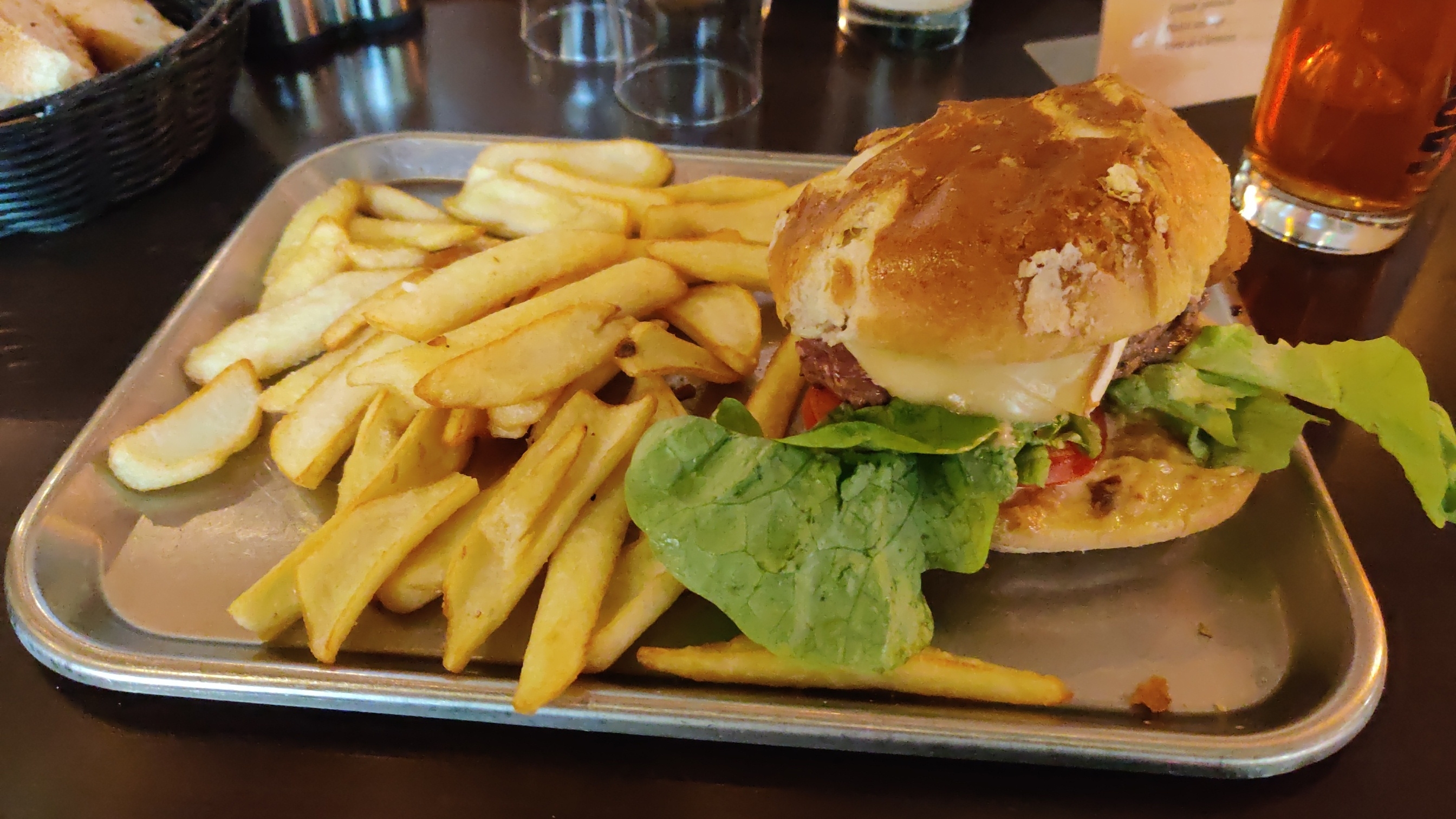 Nous étions en road trip et c'était l'heure du déjeuner. C'est l'endroit que nous avons choisi. J'ai commandé un verre de vin rouge et le burger au chèvre. C'était plutôt bien. Mon mari était ravi de voir qu'il y avait un hamburger au canard au menu, mais il en a été un peu déçu. La viande était savoureuse mais très grasse. Il a eu mieux ailleurs. Les frites et le service étaient bons.
