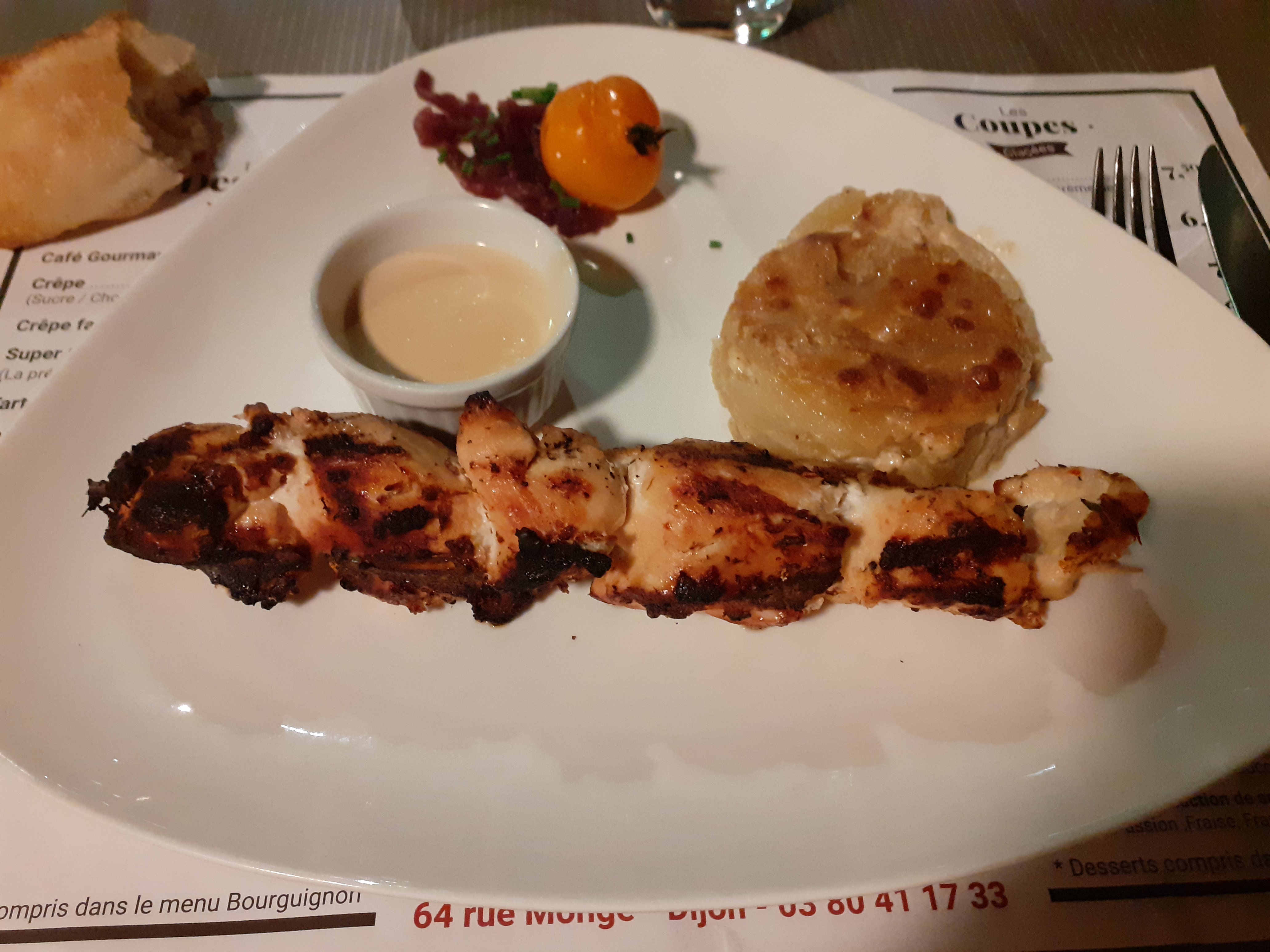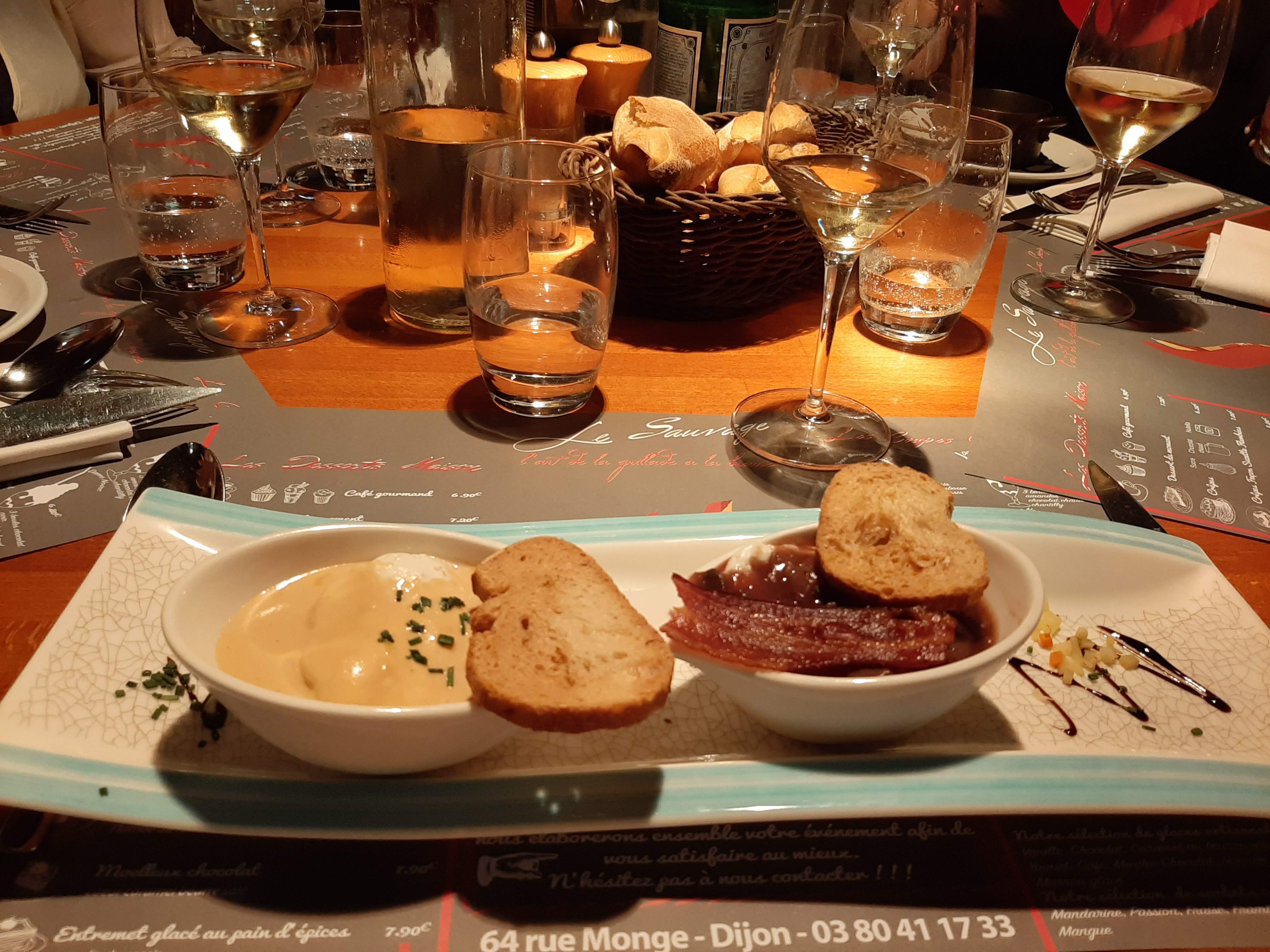 Dimanche soir, si j’ai bien compris, le Sauvage est un des rares restaurants sur Dijon ouvert le dimanche soir. Os à moelle très copieux la salade d’accompagnement est parfumé à l’huile de noix Les écrevisses et les cuisses de grenouilles à la crème à l’ail doux : vraiment bien .. bonne chaleur et saveur ( j’ai oublié de faire des photos) Ensuite jarret de porc et risotto aux pleurotes : bien, un plus pour le risotto Et duo de brochettes au bœuf et coquilles St Jacques avec gratin dauphinois et petits légumes du jour qui sont des carottes et céleris confis à l’ail et au persil : bien bonne cuisson jolie présentation J’ai demandé un doggy bag parce que je n’ai pas pu finir... Toilettes corrects mais peut mieux faire : le panier avec les serviettes usagées c’est rédhibitoire ! Pour la deco, je suis un peu dubitative : entre David Linch et un autre tableau avec un masque à gaz ... c’est surprenant et dissonant avec les autres tableaux Enfin la musique rap , la aussi je m’interroge Ce sont des points de détails car la cuisine est sans contexte de bonne qualité