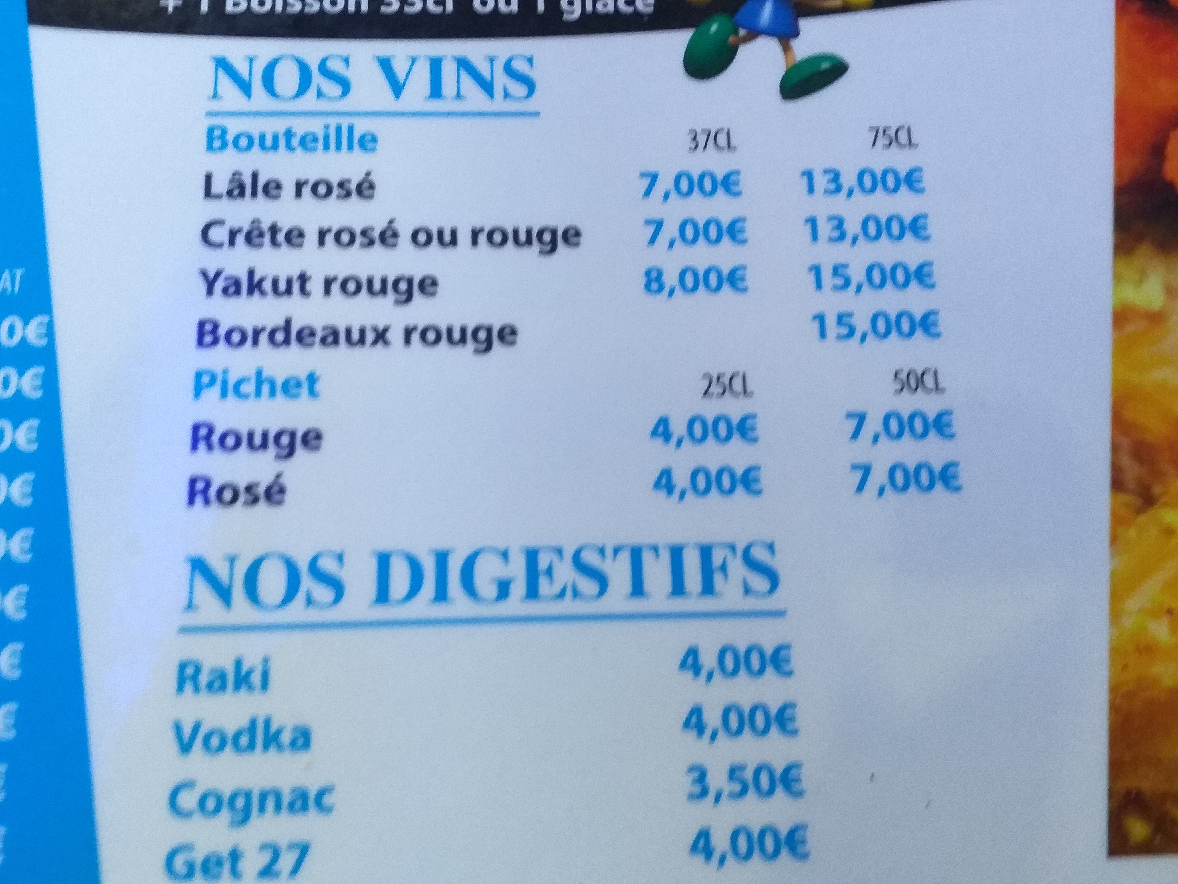 Les prix sont extrêmement chers limite du vol une bouteille de vin rosé 37 mL acheté à 1 € à Métro facturer 13 € 3 kebab et deux entrées avec une bouteille de rosé et trois bières 64 €