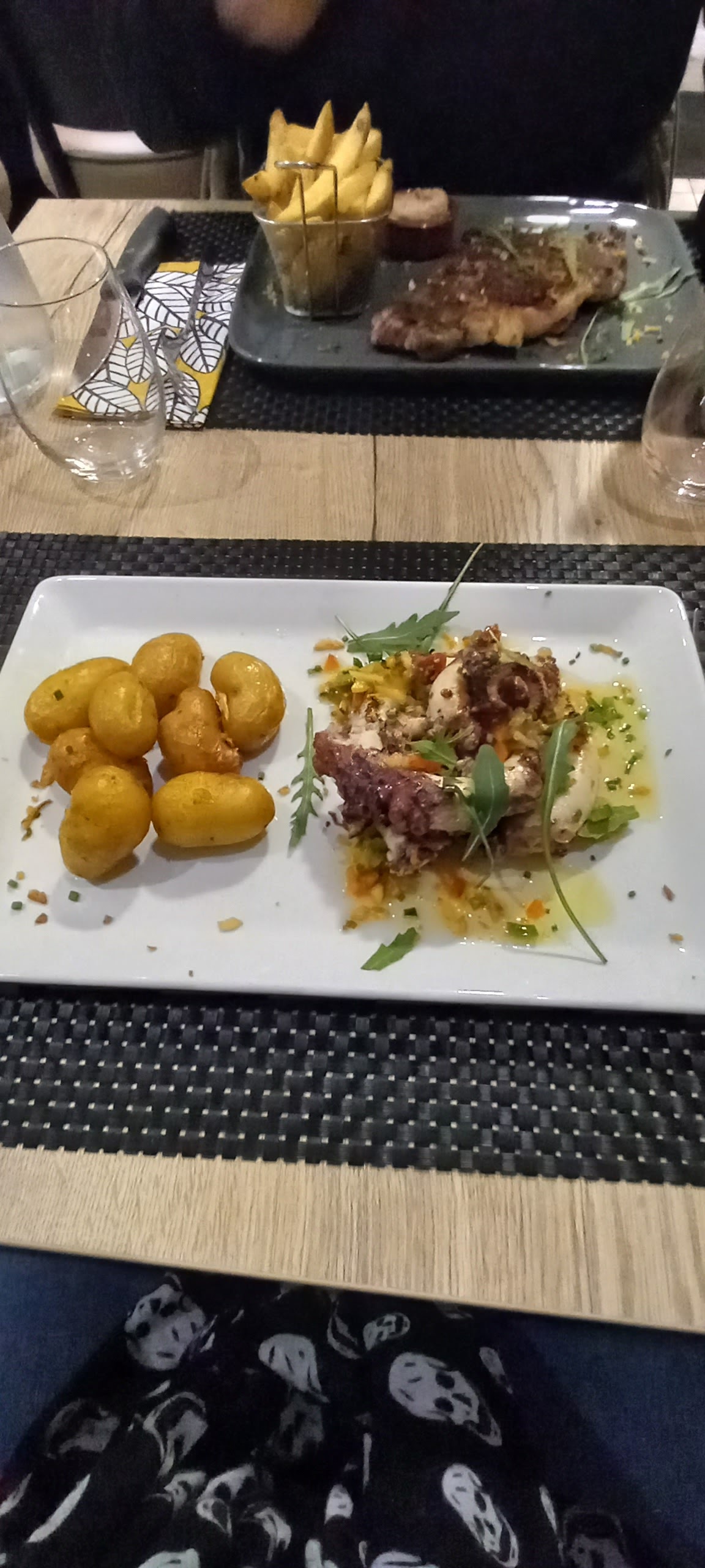 Une belle découverte, petit restro découvert par hasard, je me suis arrêtée pour lire la carte et elle m a tapé dans l oeil. Un climat sobre et chaleureux. Decoré avec goût. Une serveuse au top ! Joli découverte autant pour sa décoration que pour ce qu il y a dans l assiette. Un tartare au 2 saumons assaisonné à la perfection, un vrai régal. Une cote de boeuf maturée excellente avec une cuisson au top, et pour ceux qui aiment le poulpe, lancez vous, poulpe à la plancha une vraie tuerie, je n ai jamais mangé ce plat aussi bien cuisiné, cuit à la perfection ! Je reviendrais avec plaisir !