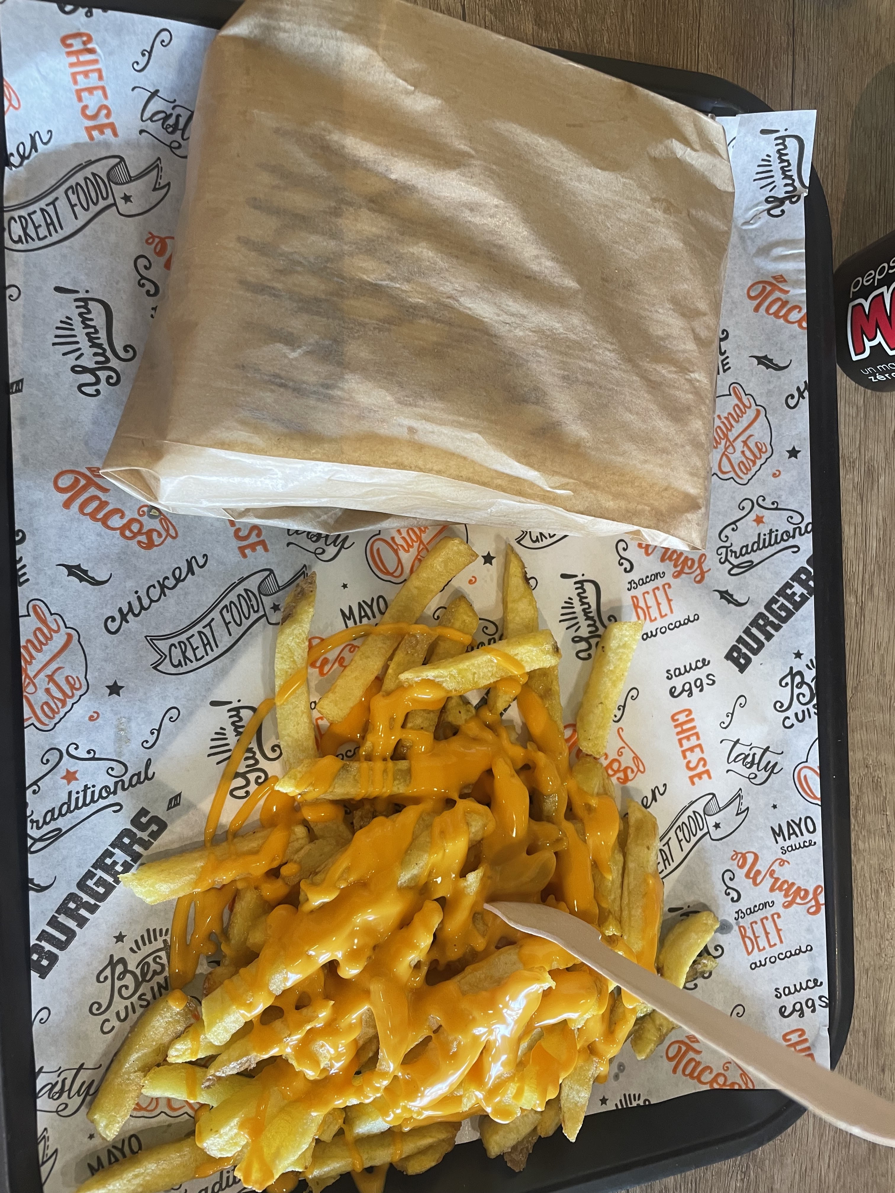 Très peux de viande dissimulée entre les frites et un montagne de sauce fromage qui gâche le goût.tres très gras et format petit pour le prix contrairement aux concurrents .