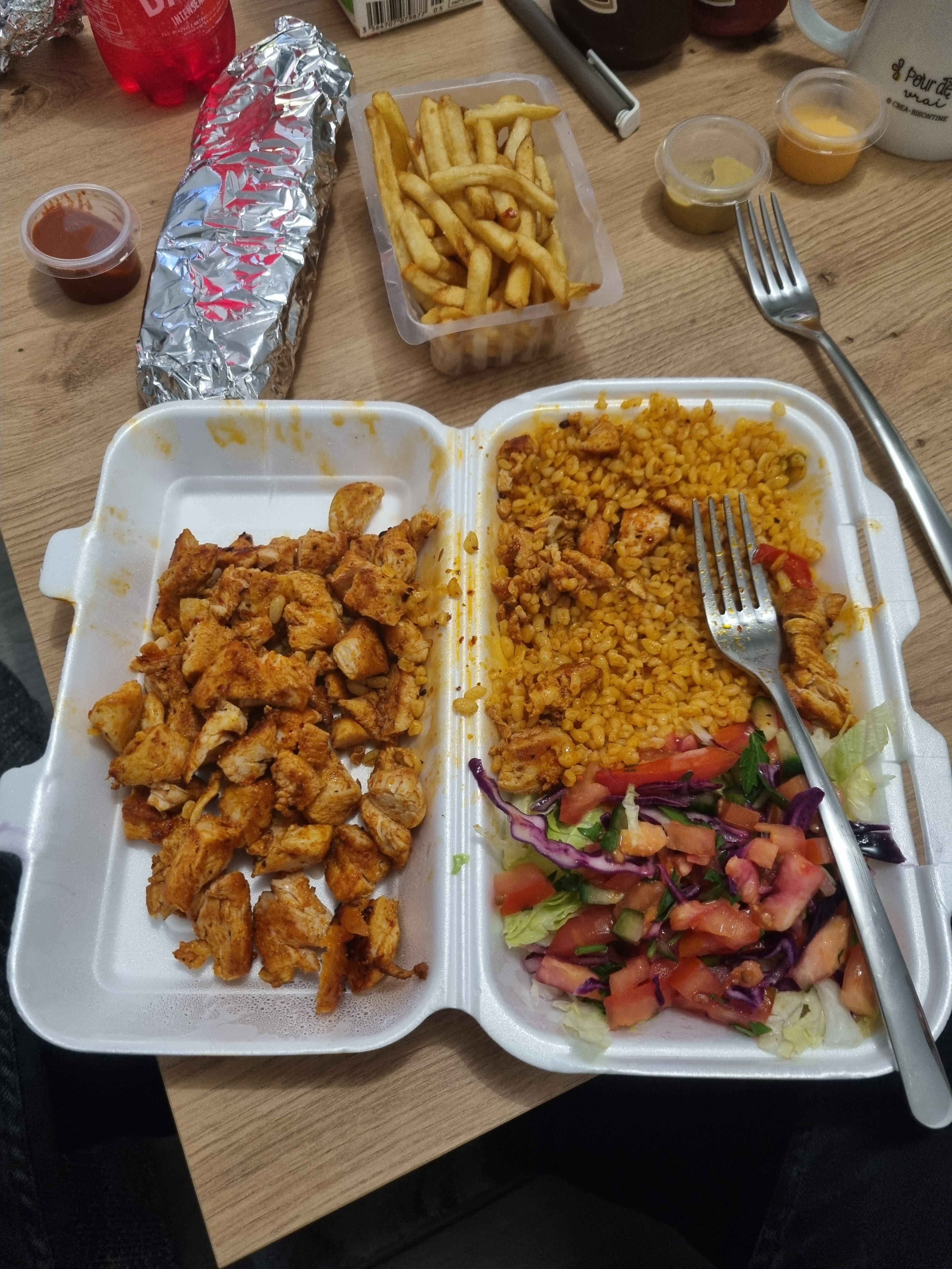 Beaucoup de attentes moin de 100g de viande pour une assiette a emporter moin de 100g de frite pour assiette a emporter quantité trop réduite pour une assiette. Et Pour le menu grec le pain trop sec et dur dommage.