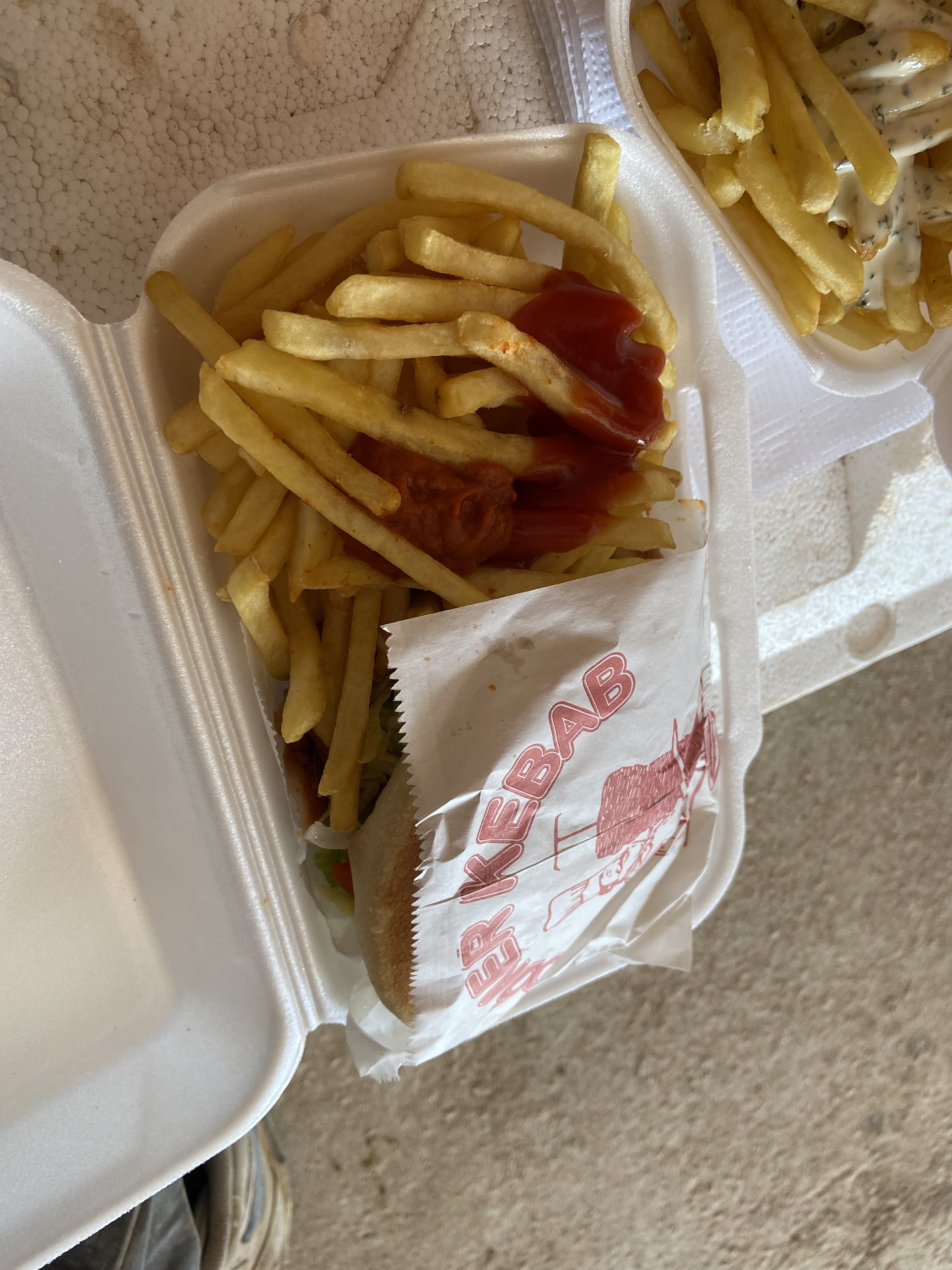 J'ai commandé un kebab frites arrive au domicile, dans ma barquette nommée KF pour kebab frites suprise pas de frites Sinon c'était bon