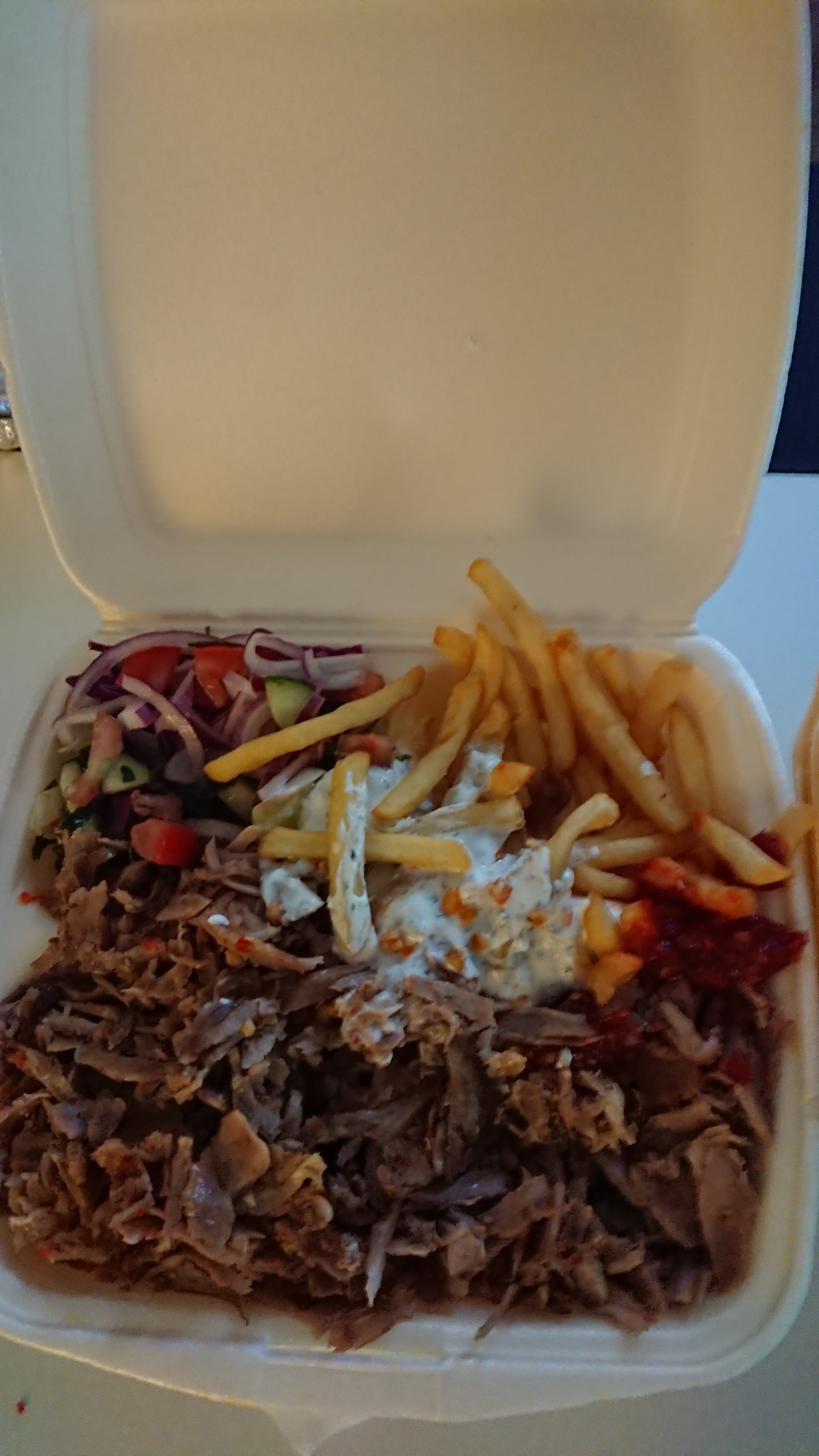 Une première et pas de regrets au contraire Très bonne viande et surtout la sauce blanche faite maison un régale! (Comcombre, ail, menthe et sauce blanche) miam miam. Je recommande