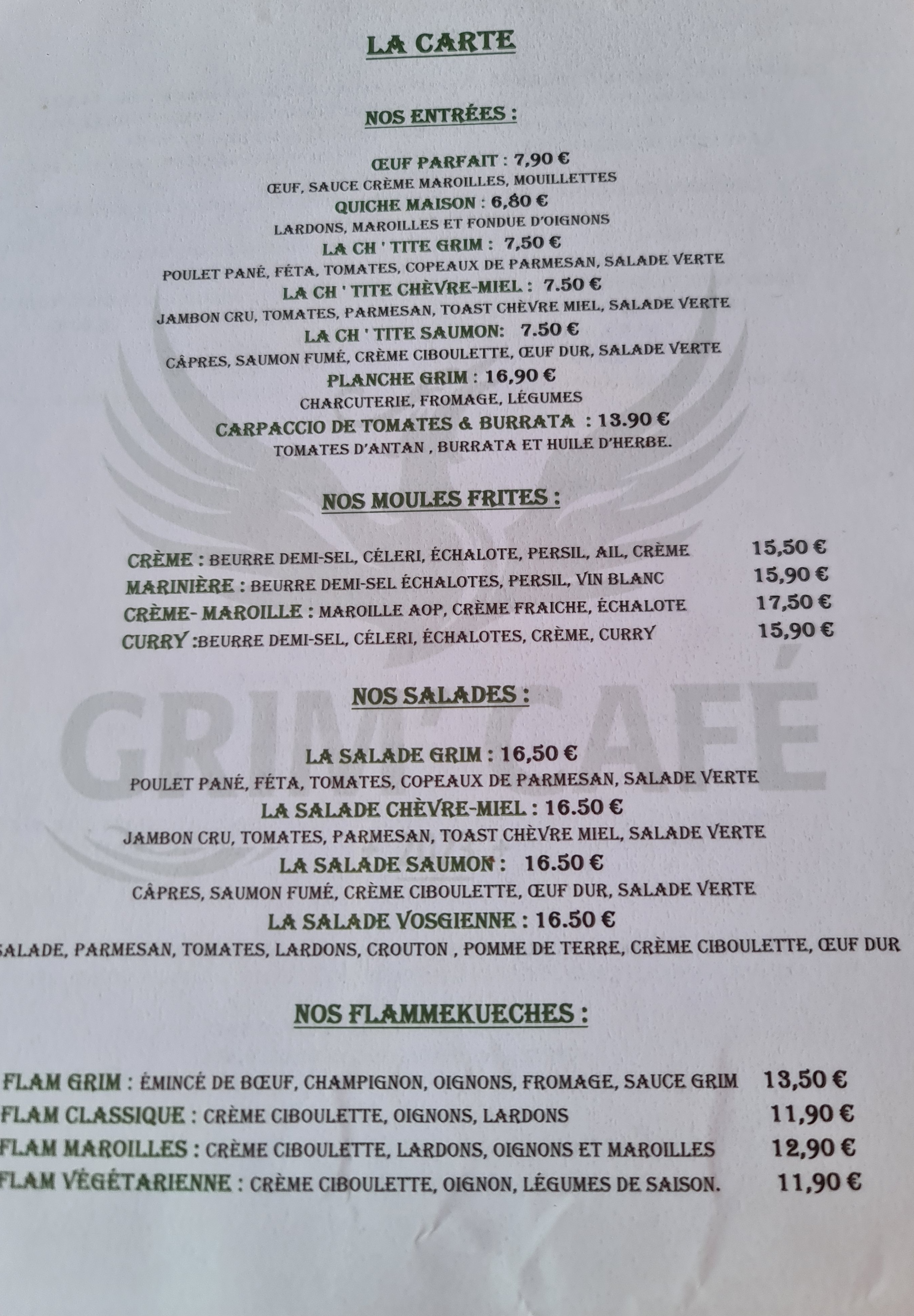 Très bonne soirée au Grim malgré une très forte affluence l équipe est restée souriante et très sympa (ça fait du bien) , les plats sont très bons et abordables, belles de cartes vins et bières.