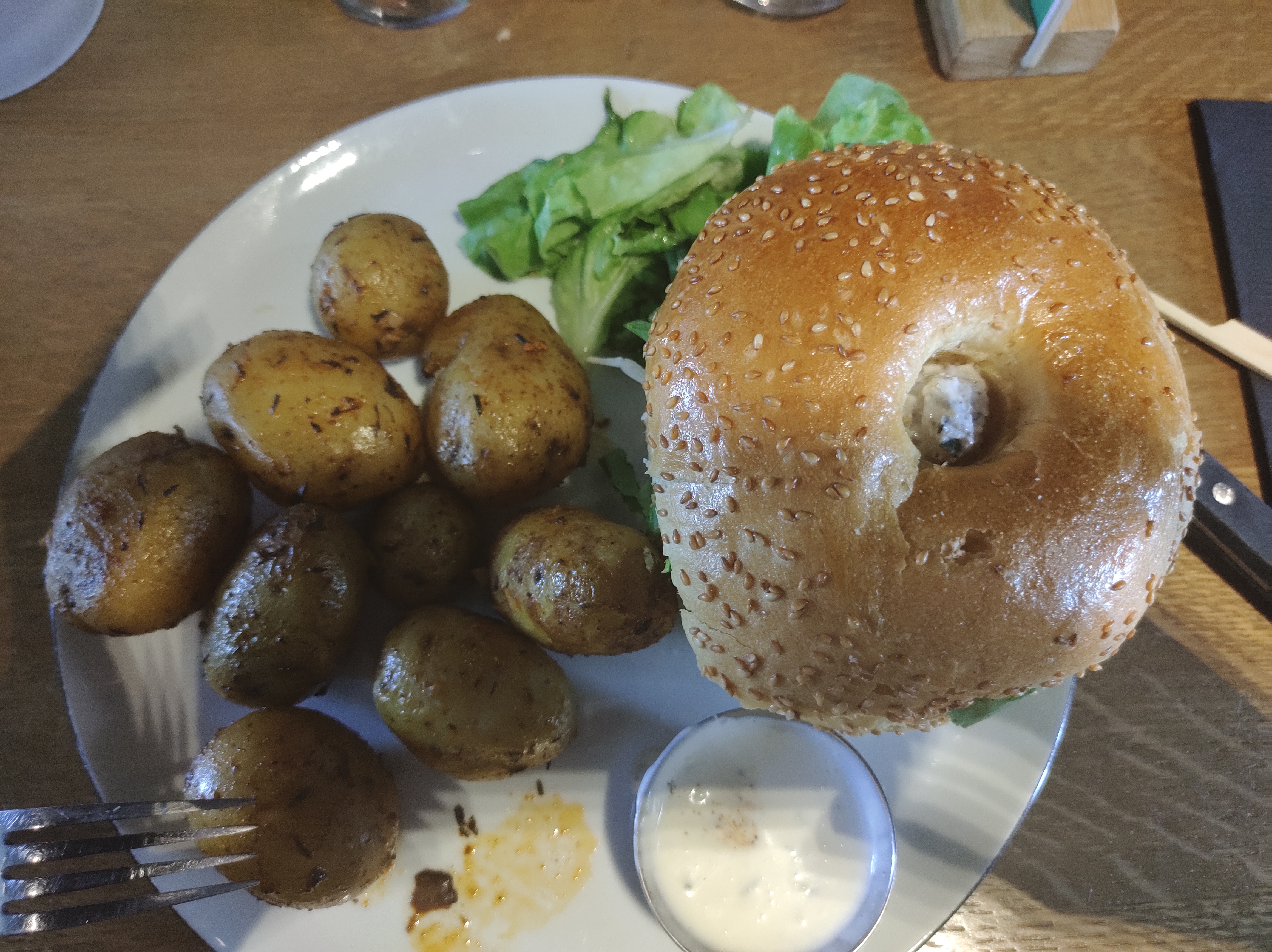 Déjeuner bien agréable en terrasse. Belle découverte du bagel poulet-poulette servie au choix avec des pommes de terre grenailles succulentes ou avec une salade qui était minimaliste. Dommage. Super rapport qualité-prix. Serveuse souriante et efficace.