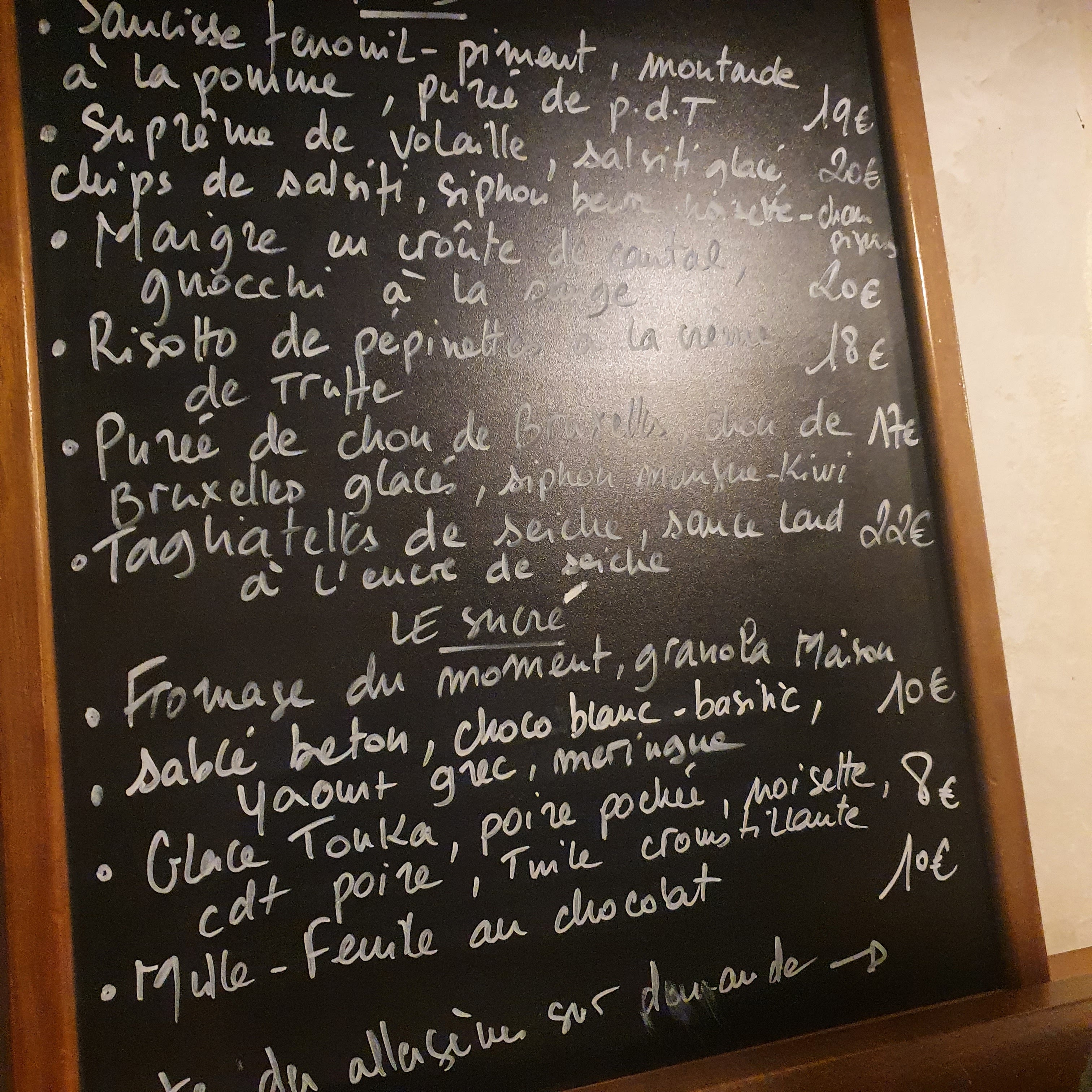 Un 4 d encouragement encore une fois ces temps ci. Le prix du menu à 17€ pour une entrée et un plat et 22€ pour les trois qui reste contenu. Surtout que la qualité des entrées étaient là pour nous amener vers des plats réussies sur une carte restreinte mais ce n'est pas plus mal ainsi. Par contre je n'ai pas du tout adhéré à la déco et rien de spécial sur l'accueil qui dans mon cas fut assez impersonnel.