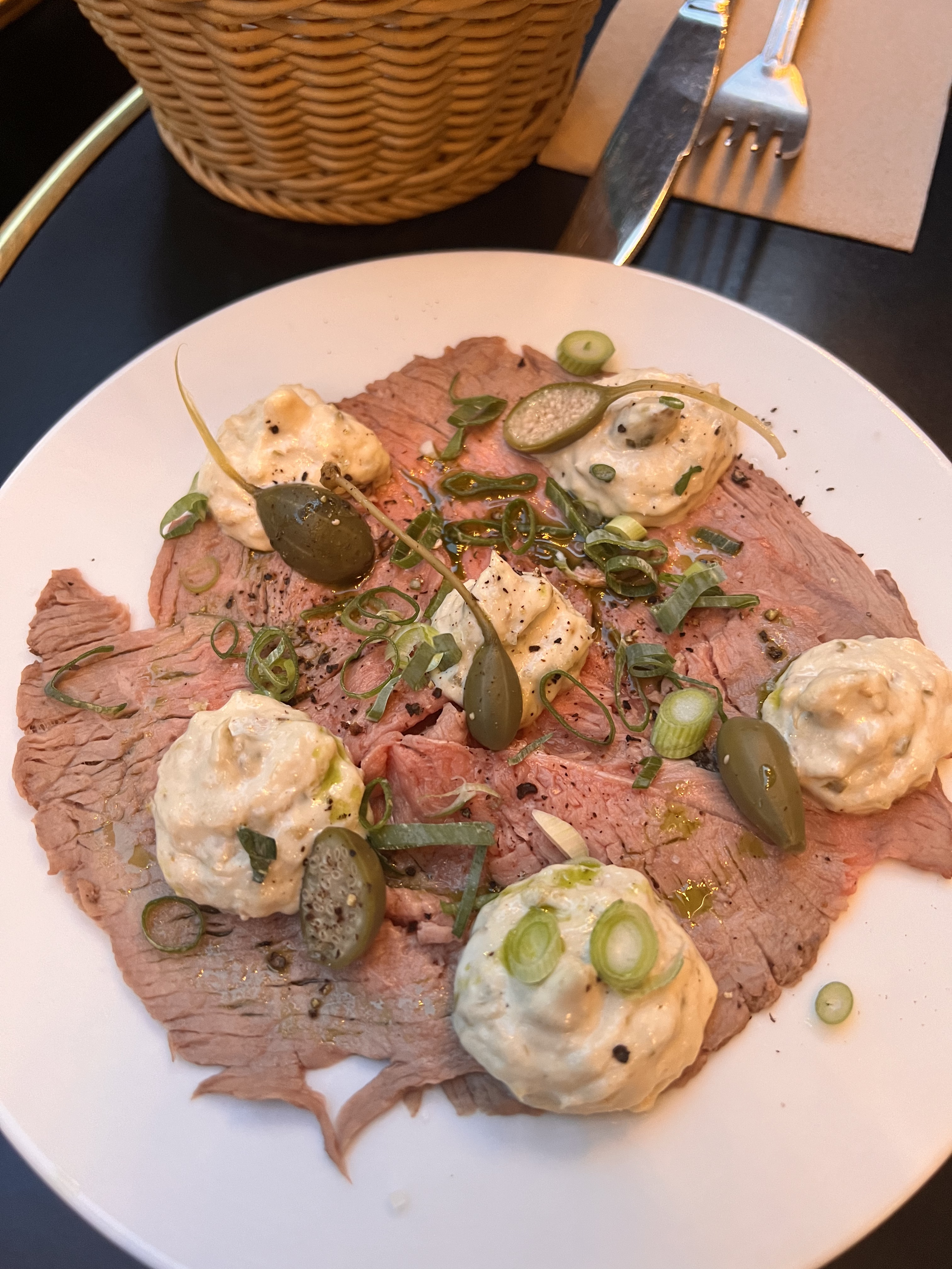 Dans une cour piétonne remplie de restaurants avec terrasse, on y trouve un restaurant parisien comme on l’imagine l’été, on y a dîné sur le pouce en commandant 3 entrées : une burrata, un tartare de bar et un vitello tonnato. Tout était frais. Service OK. Un bon! on reviendra