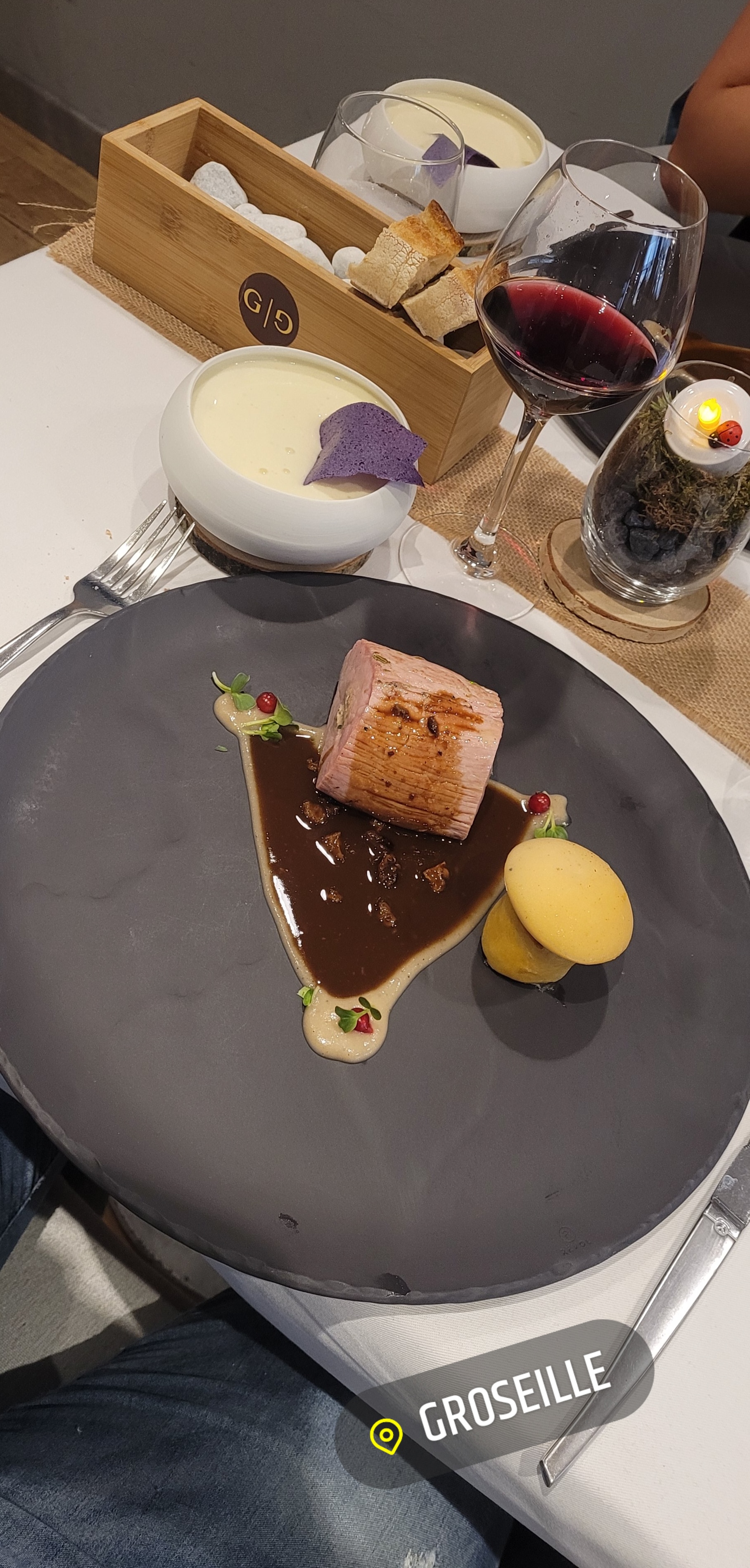 Tout d'abord il y a le cadre , chaleureux, raffiné, confortable,puis arrive les plats ,succulents de l entrée au dessert ,très joliment dressés dans de la très belle vaisselle,et enfin le service souriant et a l écoute des clients ! Nous avons passé un très bon moment chez Groseille.