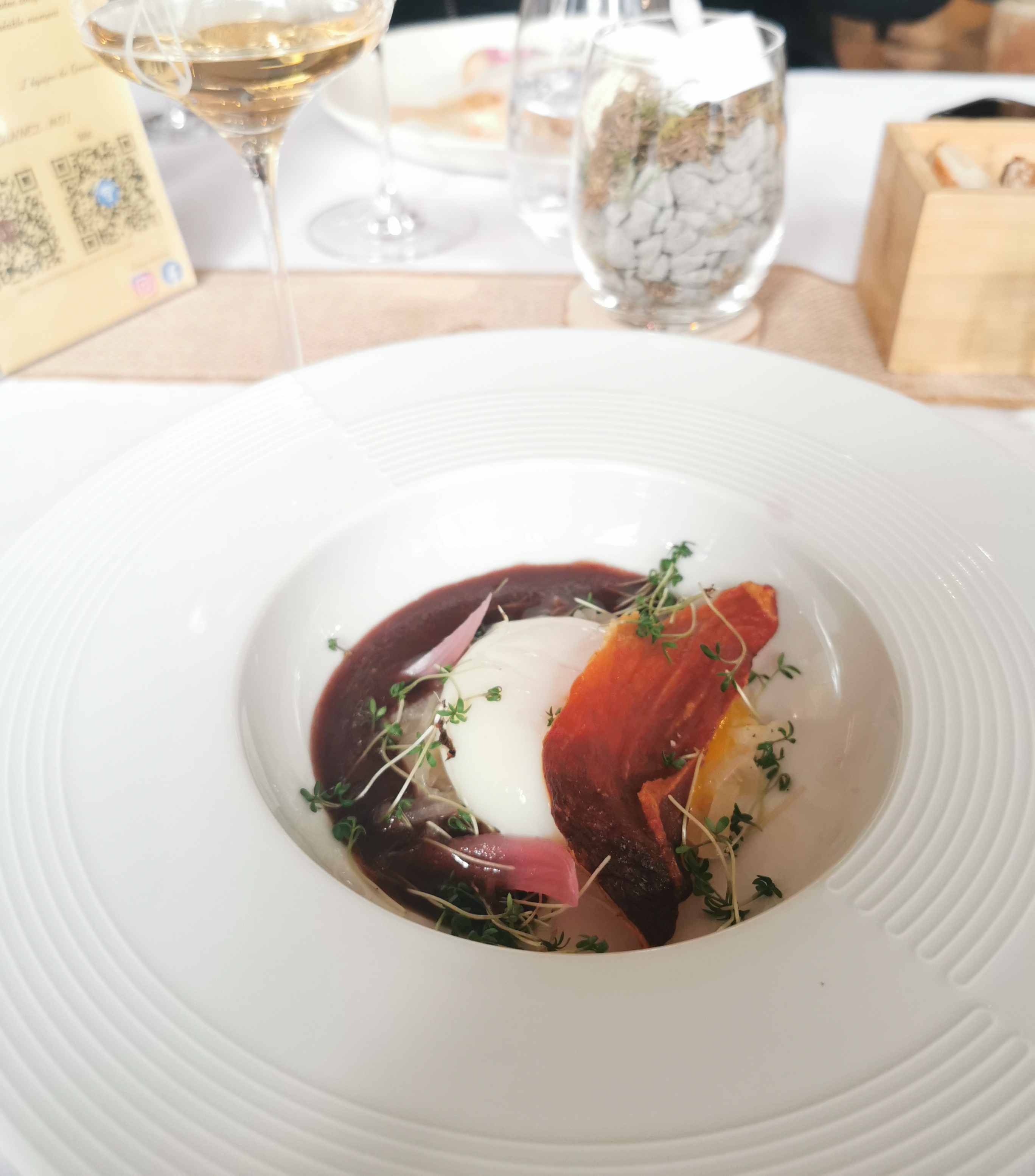 Très belle découverte 🙂. Personnel adorable. La décoration est simple, petite ambiance musicale très agréable et lumière pas trop vives,jolies tables, belles chaises confortables: on se sent bien. Cocktail du moment original (à la courge). Ne partez pas sans avoir goûté le vin de groseille ! C'est un délice. Plats vraiment beaux visuellement et très bons. Seul petite critique les assiettes ne sont pas chaudes donc le plat refroidit vite dommage quand on veut prendre le temps de déguster et vraiment pour chipoter, il faudrait mettre des patins sous les chaises car elles sont lourdes et donc bruyantes lorsque les clients les déplacent. Mais c'est vraiment un super restaurant où je reviendrai avec plaisir. Pensez à réserver c'était complet.