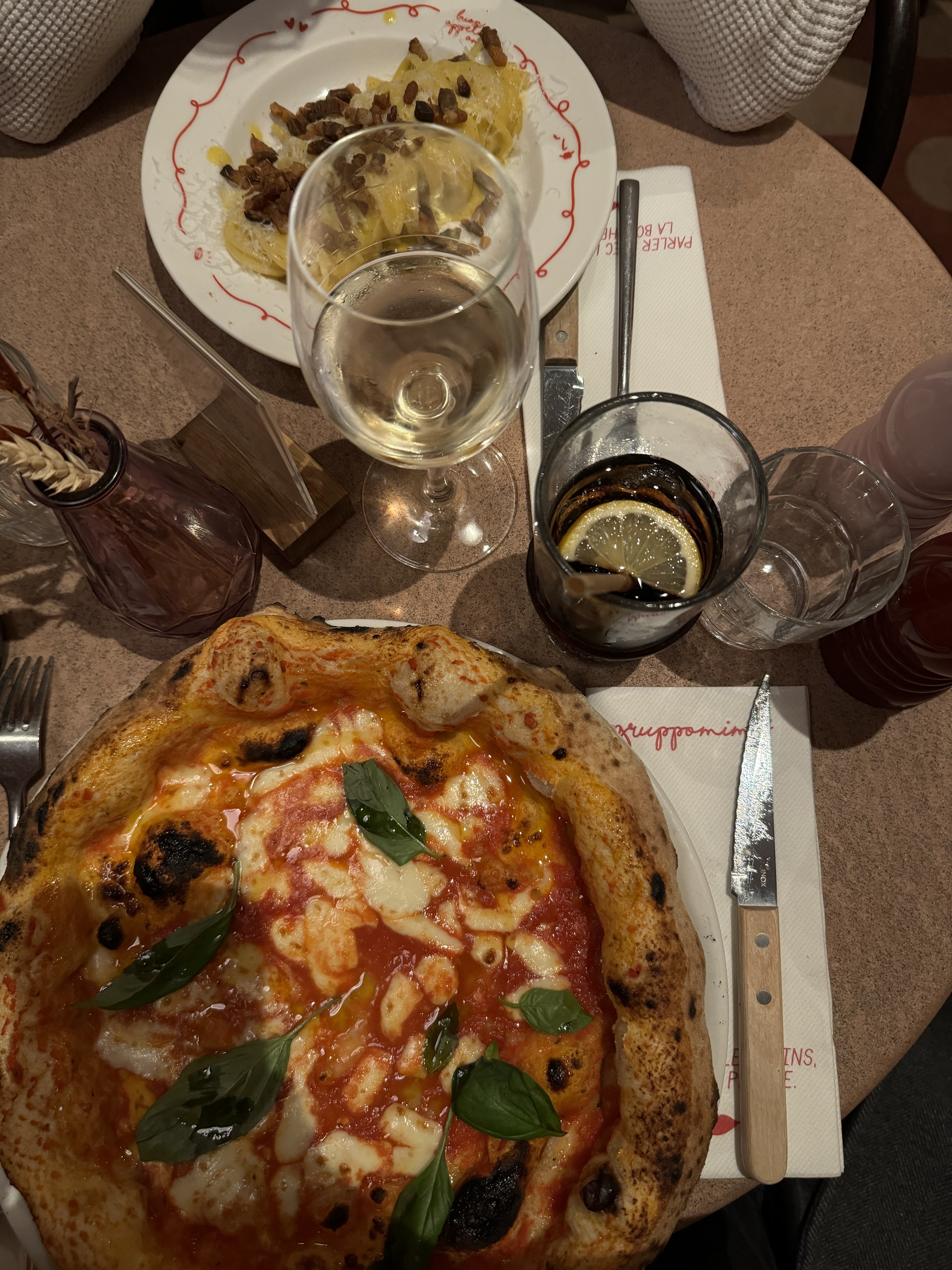 Restaurant au top ! Les pizzas, pâtes et cocktails délicieux. Je recommande . Je laisse les 5 étoiles et je donne aussi de la force à l’équipe car il bosse hyper dur pour le service à temps . L’équipe court partout en ce moment. ✨