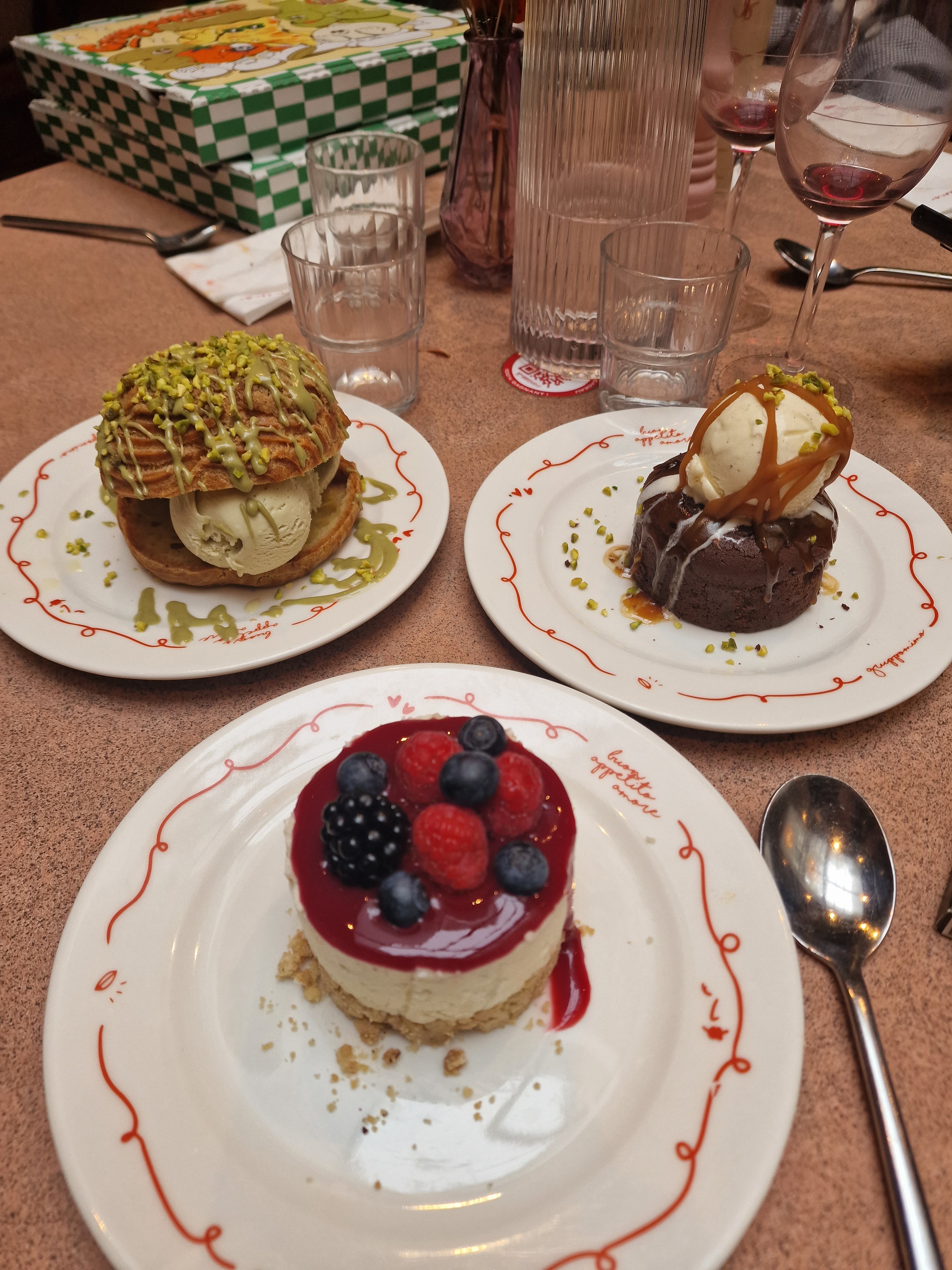 Très bonnes les pizzas ! Les fondants cœurs coulants pistache n’étaient pas très coulants mais c’était quand même bon 😁
