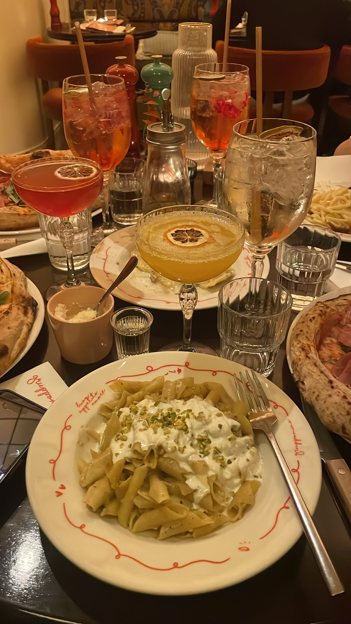 Dîner entre copines sur une belle table ronde ! Choix de cartes divers et variés entre pizza pasta et cocktails ! Je recommande sans hésiter la pizza Queen valeur sûre, possibilité d’ajouter des ingrédients en supplément type artichaut, burrata… Prix raisonnable et bonne quantité. Plusieurs choix de cocktail et de vin, j’ai adoré le spritz au citron. Service rapide