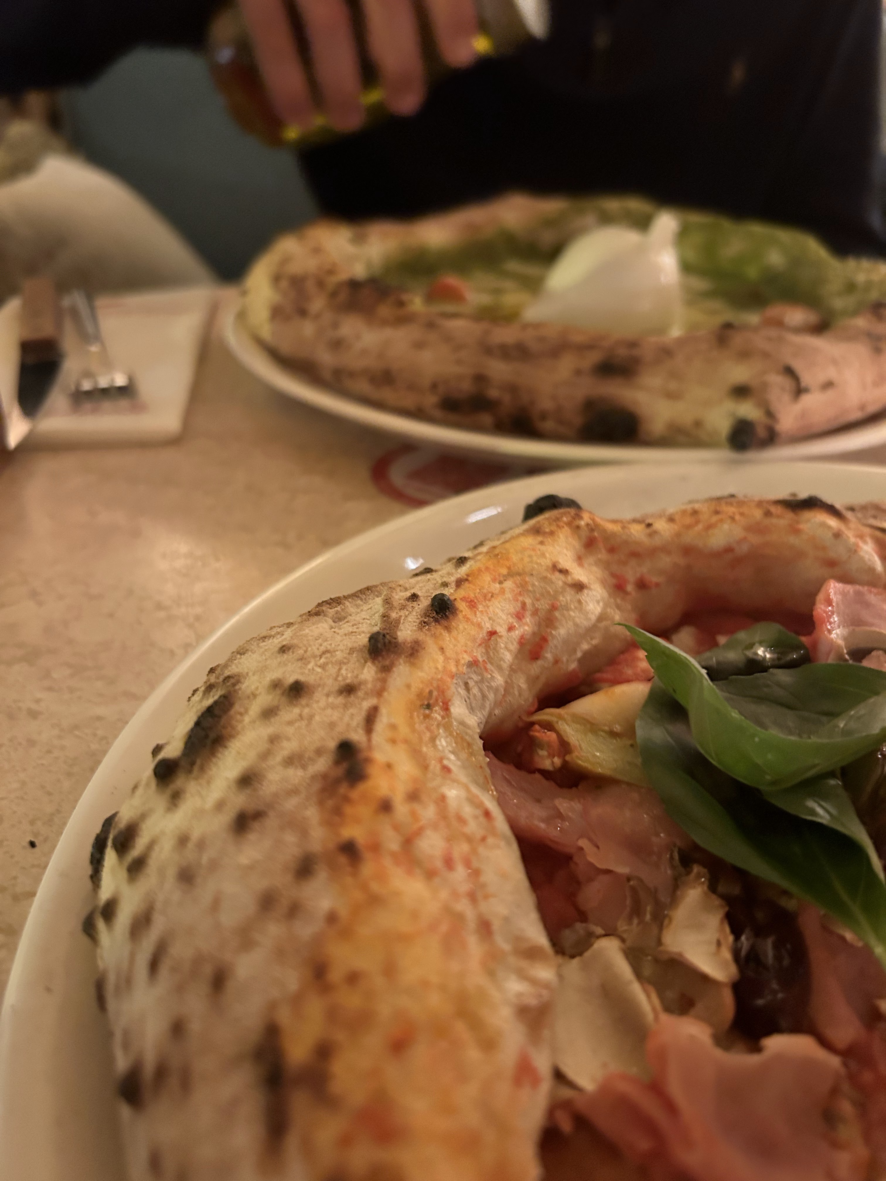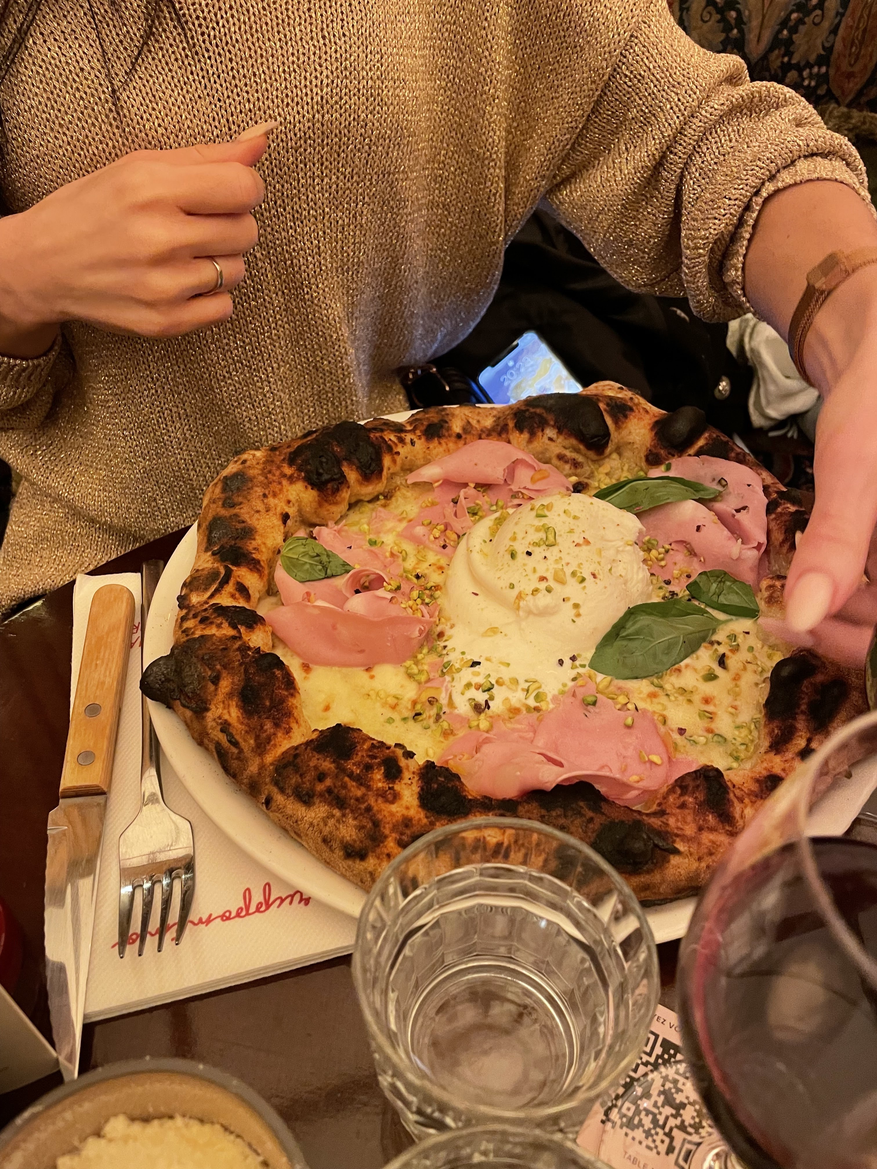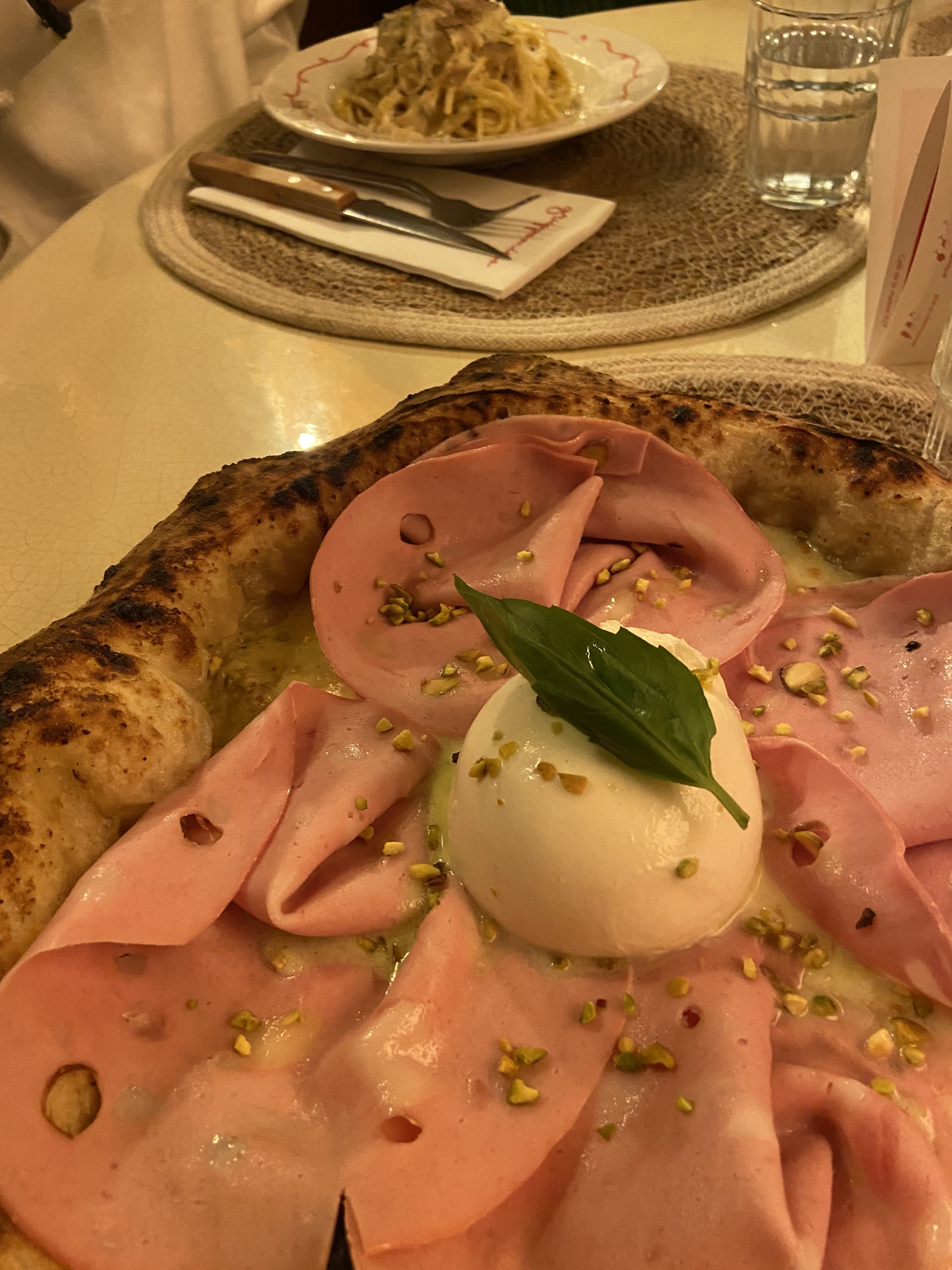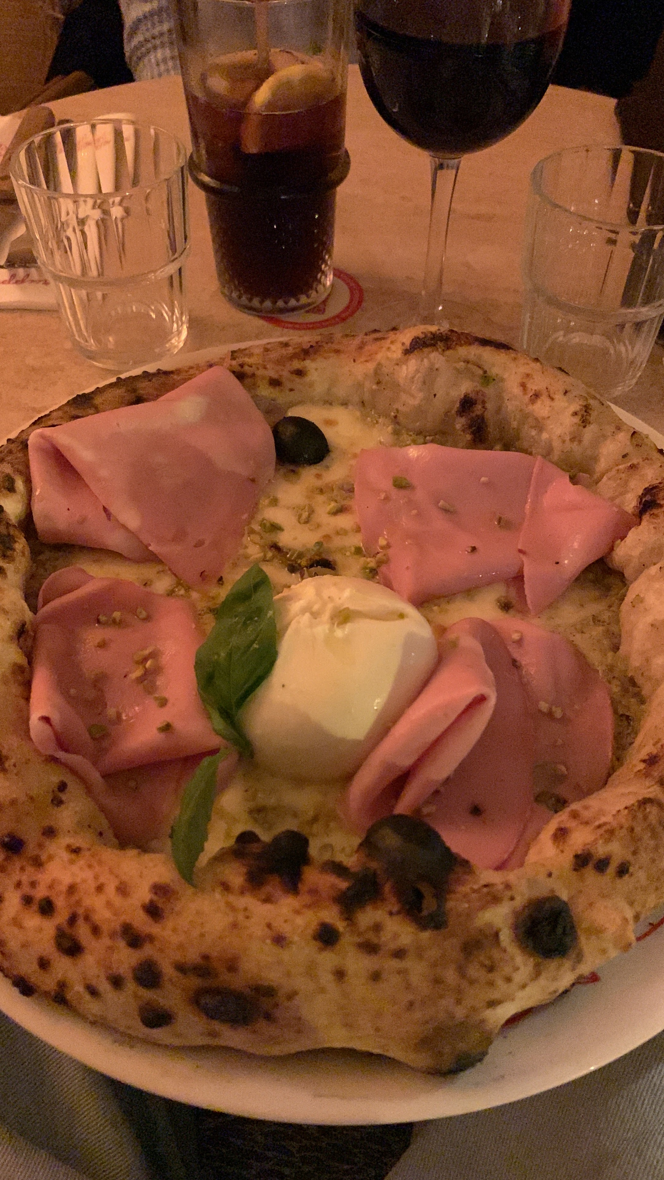 Restaurant italien très sympathique, l’atmosphère et la décoration vous plonge directement dans l’univers du lieu ! J’ai beaucoup aimé le dressage de la table, très intimiste avec la petite bougie faisant écho à l’ambiance tamisée de la salle. Nous avons opté pour la Mortadelle Kombat (pizza à la pistache) ainsi que la pizza à la truffe. Les portions sont généreuses, dans l’ensemble les pizzas étaient bonnes et bien parfumées. 🍕 Nous avons passé une bonne soirée, l’ambiance sonore est cependant assez forte, ce qui peut être un peu oppressant. L’accueil était chaleureux et souriant, cependant notre serveur beaucoup moins, on a bien senti qu’il ne fallait pas qu’on s’éternise ! Ce qui peut se comprendre vu le monde mais il y a des manières plus agréable de faire passer le message. Une bonne adresse dans l’ensemble mais peut être à tester en semaine quand il y a moins de monde. Pensez aussi à réserver à l’avance !