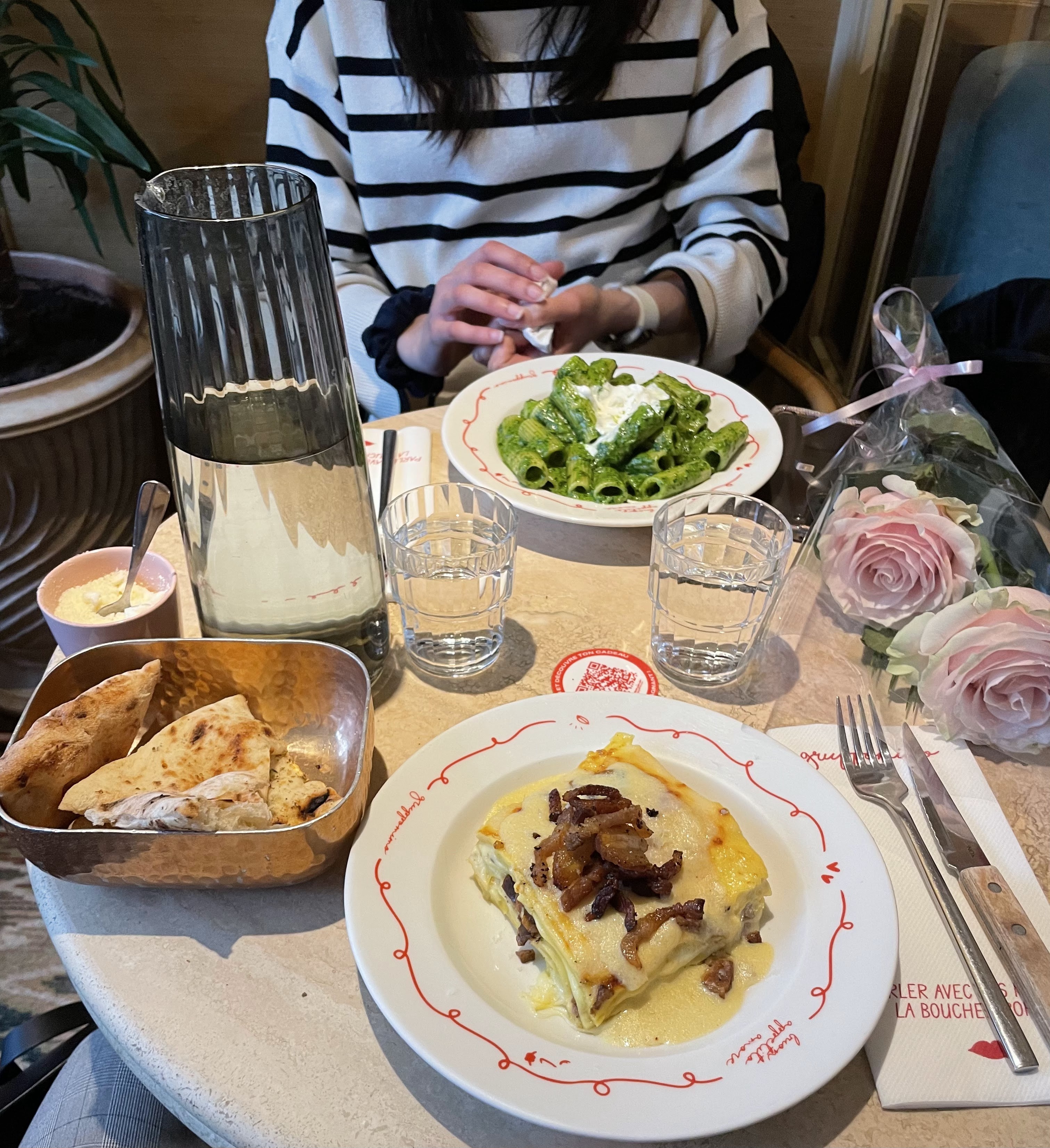 Nous sommes arrivés un lundi après-midi donc pas de queue et quasiment personne dans le restaurant, on a donc pu avoir une table directement. Les serveurs et serveuses étaient tous très souriants et chaleureux (en plus d’être très réactifs) ! Très bonne ambiance et j’ai adoré leur t-shirt :). Le restaurant est également très joli ! Dommage qu’il n’y avait plus de ravioli truffe à notre arrivée, j’ai pu goûter leur pâtes au pesto/pistache et c’était quand même très goûteux ! Niveau quantité j’ai trouvé ça assez généreux - mais à noter que je mange habituellement assez peu - ! Bref j’y retournerai c’est certain !