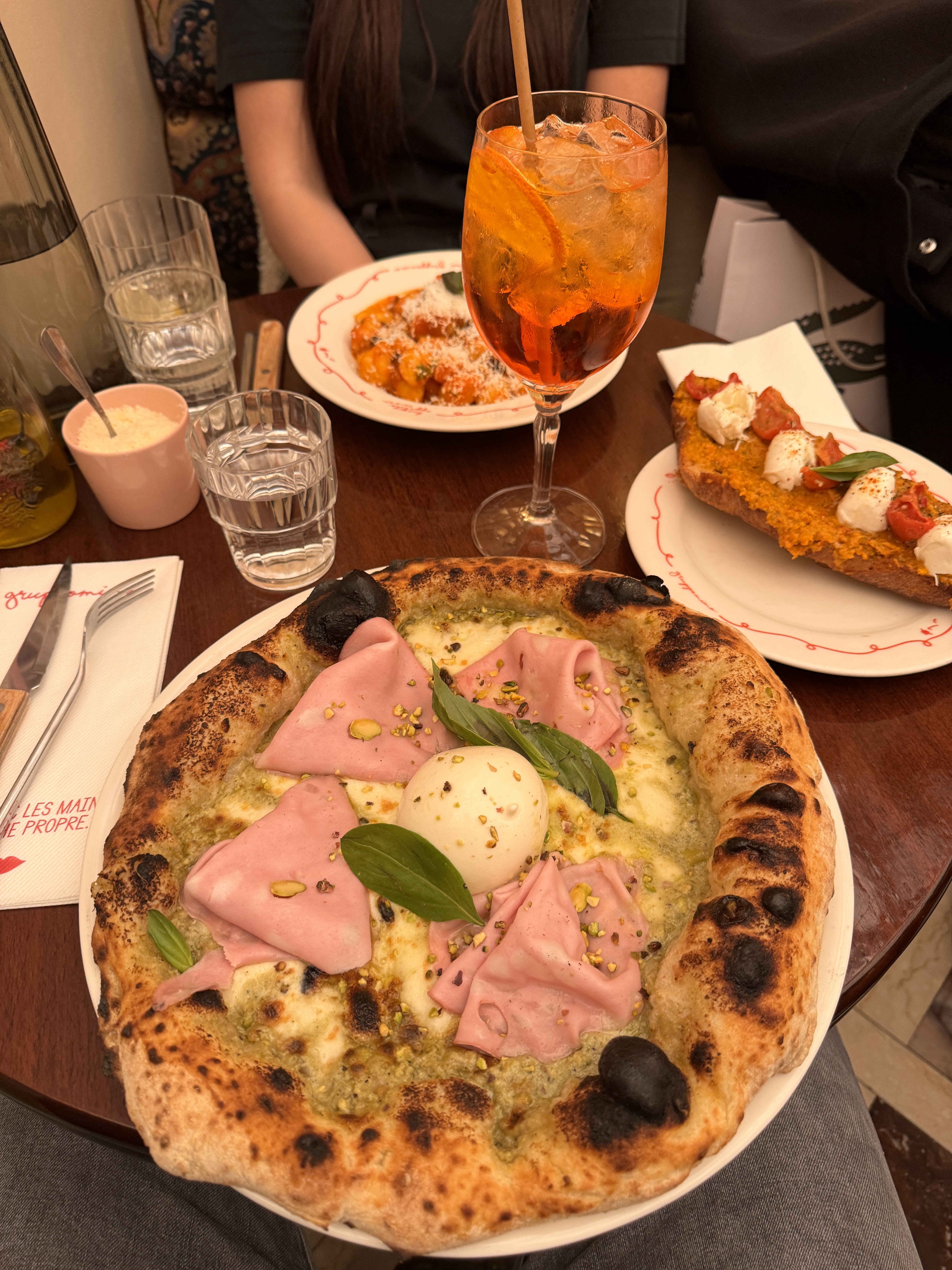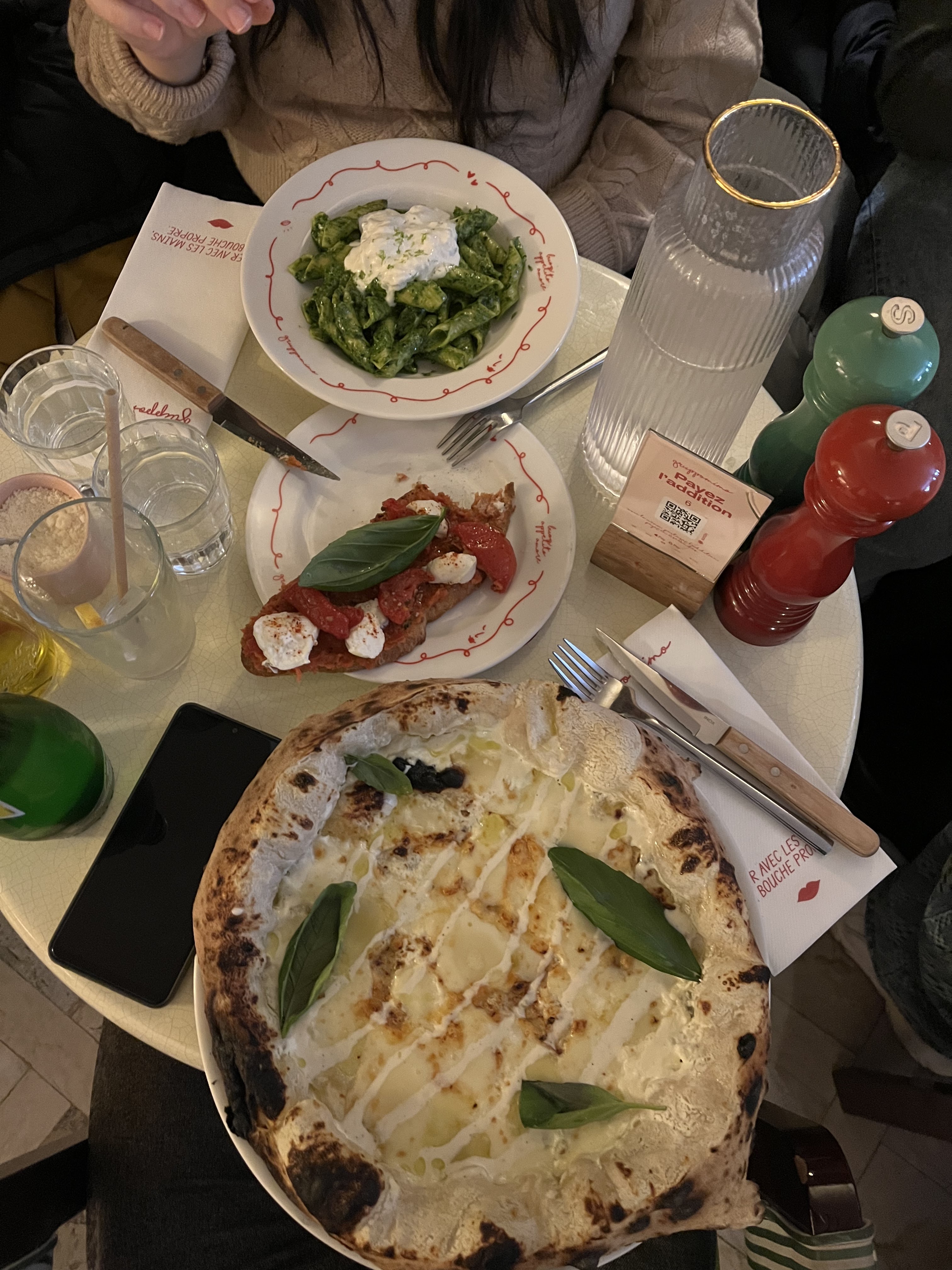 C'était probablement le meilleur repas que nous ayons eu lors d'un récent voyage à Paris ! Nous sommes venus un vendredi soir sans réservation et avons été agréablement surpris de trouver une table ouverte (même si je recommande fortement de réserver - nous avons eu de la chance !) Le personnel était attentif, rapide et serviable avec notre français limité. Ils avaient un menu en ligne en anglais avec des photos, ce qui était super. L'ambiance du restaurant était chaleureuse mais aussi branchée. La nourriture était fantastique ! Nous avons commandé la fondue et le pain, le trio d'arrancini? et 2 pizzas - Margherita et Diablo Diavola et elles étaient TELLEMENT bonnes. La sauce était douce et piquante, les garnitures étaient abondantes et la croûte avait l'épaisseur parfaite. Nous sommes repartis rassasiés et heureux, et la possibilité de payer sur votre téléphone était un changement agréable par rapport aux épreuves et tribulations parisiennes consistant à attendre 45 minutes pour obtenir un chèque et payer dans la plupart des autres restaurants. (Je sais, je suis américaine.) 10/10 je le recommande et j'y retournerais sans hésiter la prochaine fois que nous serons à Paris !