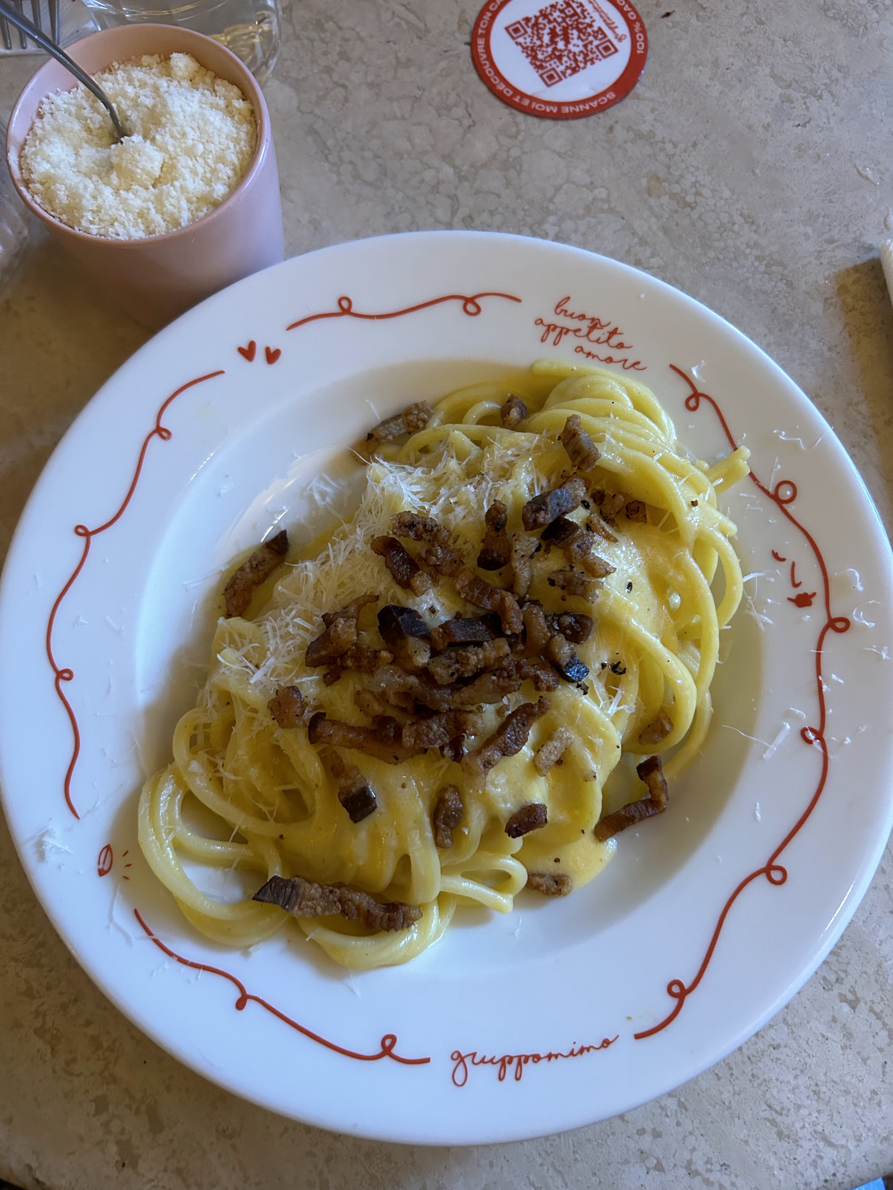 Nous avons passé un excellent moment dans ce restaurant. L'accueil était au rendez-vous, les serveurs et serveuses très souriants et avec pas mal d'humour Bonne ambiance avec de bonnes musiques pendant le repas, cela rend le déjeuner agréable. Côté cuisine les carbonara étaient bonnes mais manquaient quand même un petit peu de quantité à mon goût. Sinon le dessert était un pur délice et j'étais à deux doigts d'en reprendre un second ! Je recommande fortement ce lieu !