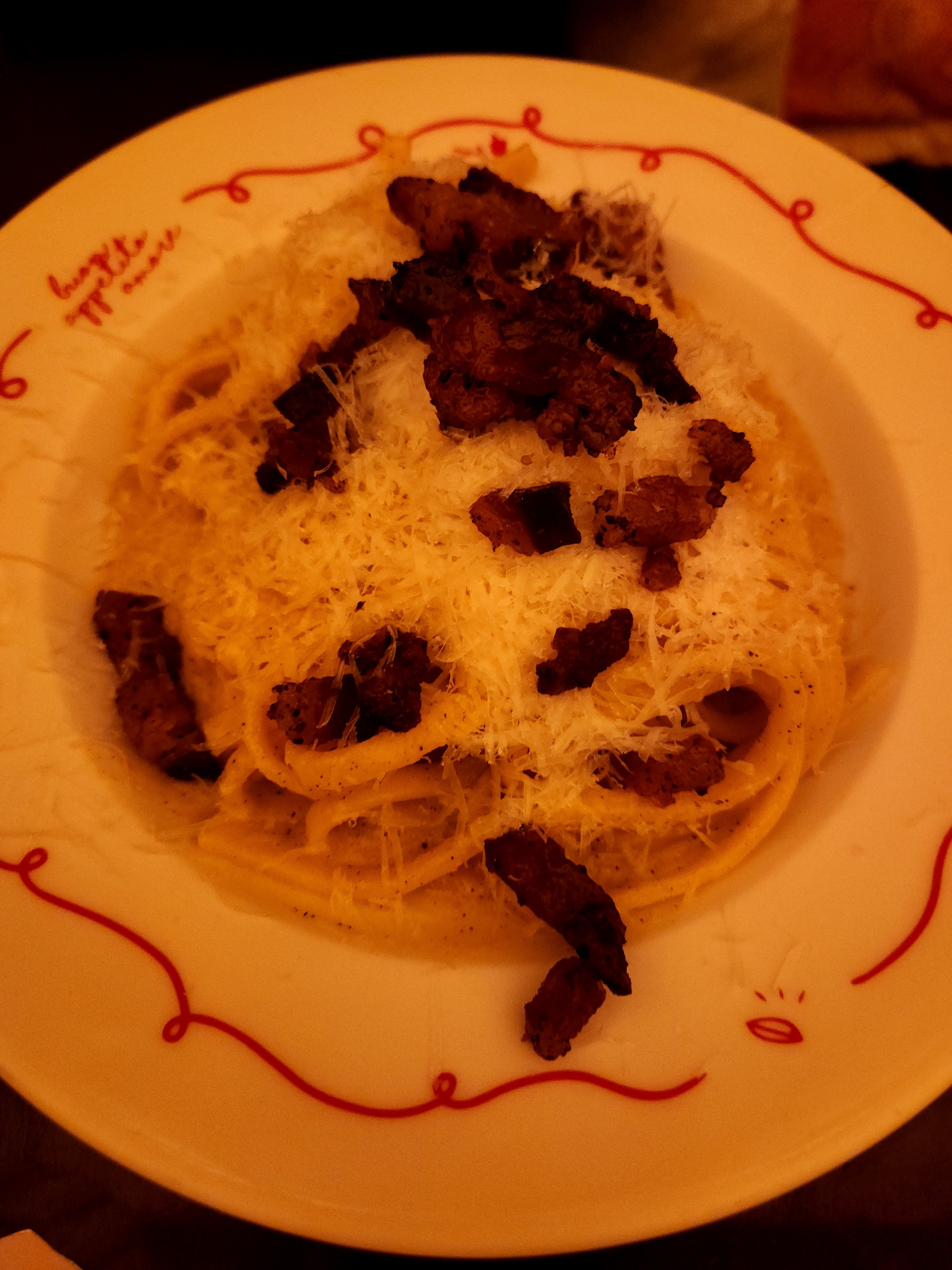 Nous avons commandé des pâtes carbonara avec du fromage à la truffe. Les pâtes étaient bonnes mais pas très chaudes. Même si le personnel était étrange, ils étaient sympathiques.