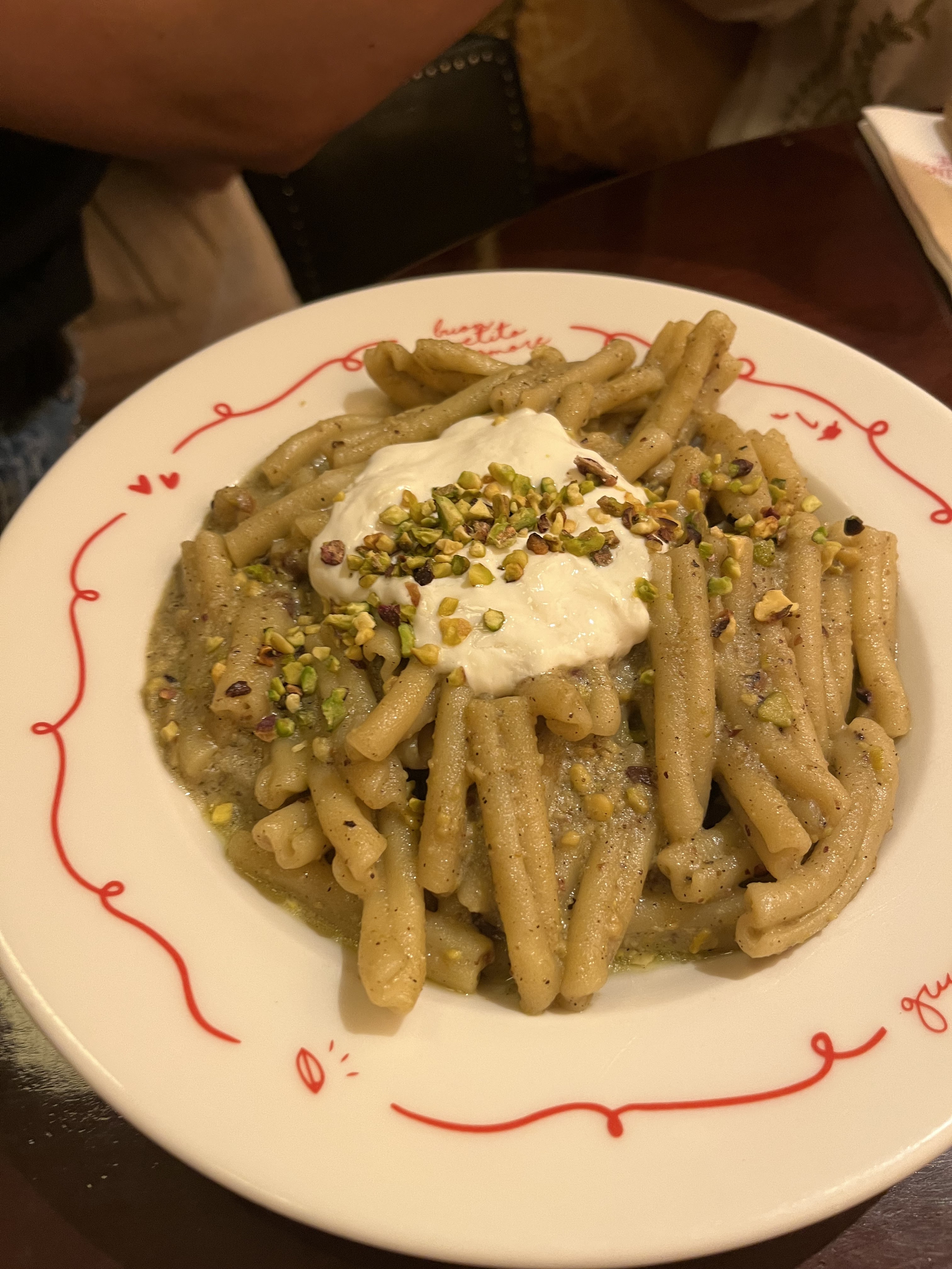 Le service était super, on avait une table proche de la porte qui ne nous convenait pas et ils ont trouvé une solution pour nous déplacer à l’intérieur. La déco et l’ambiance sont superbes. On a pris des pâtes à la pistache : délicieuses ! Et le profiterole… une dinguerie ! On reviendra c’est sur. Surtout pour tester les pizzas qui ont l’air incroyables !