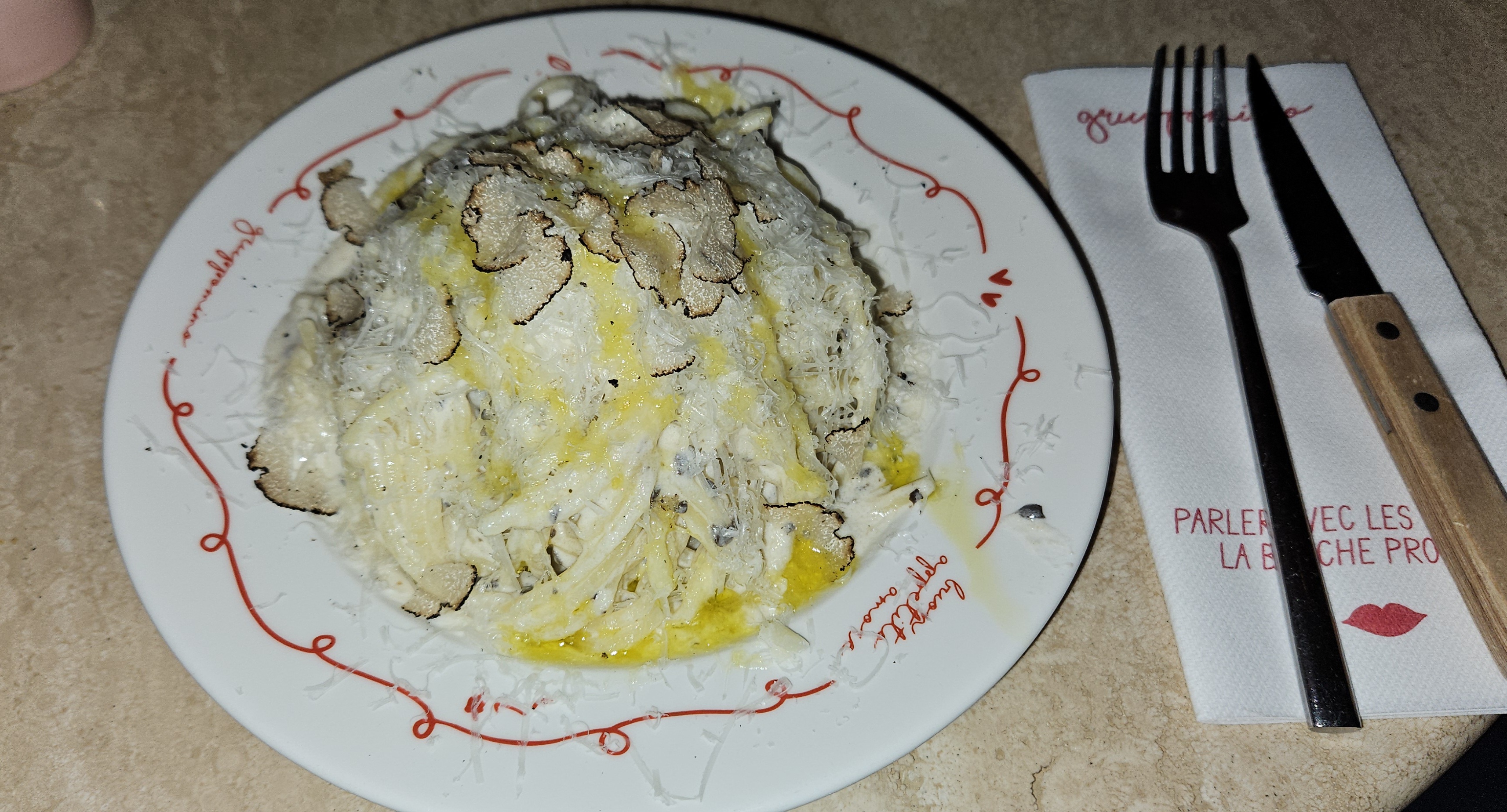 Étant une adepte des pâtes à la truffe , j’étais vraiment déçue par la qualité des pâtes et le dosage de la truffe. Des pâtes écœurantes et sans goût se rajoute à ça un service très très bas le serveur qui prends ton assiette même avant de terminer et ne surtout pas oublier l’incitation à commander en permanence .la cerise sur le gâteau on nous demande de payer l’addition avant meme d’avoir fini notre dessert. On n’a pas pu profiter pleinement de notre repas. Je ne suis pas habituée à ce type de service à Paris peut être d’autres personnes trouveront cela normal Contrairement à votre deuxième adresse au 17ème que je recommande vivement on y mange bien et le service et à la hauteur