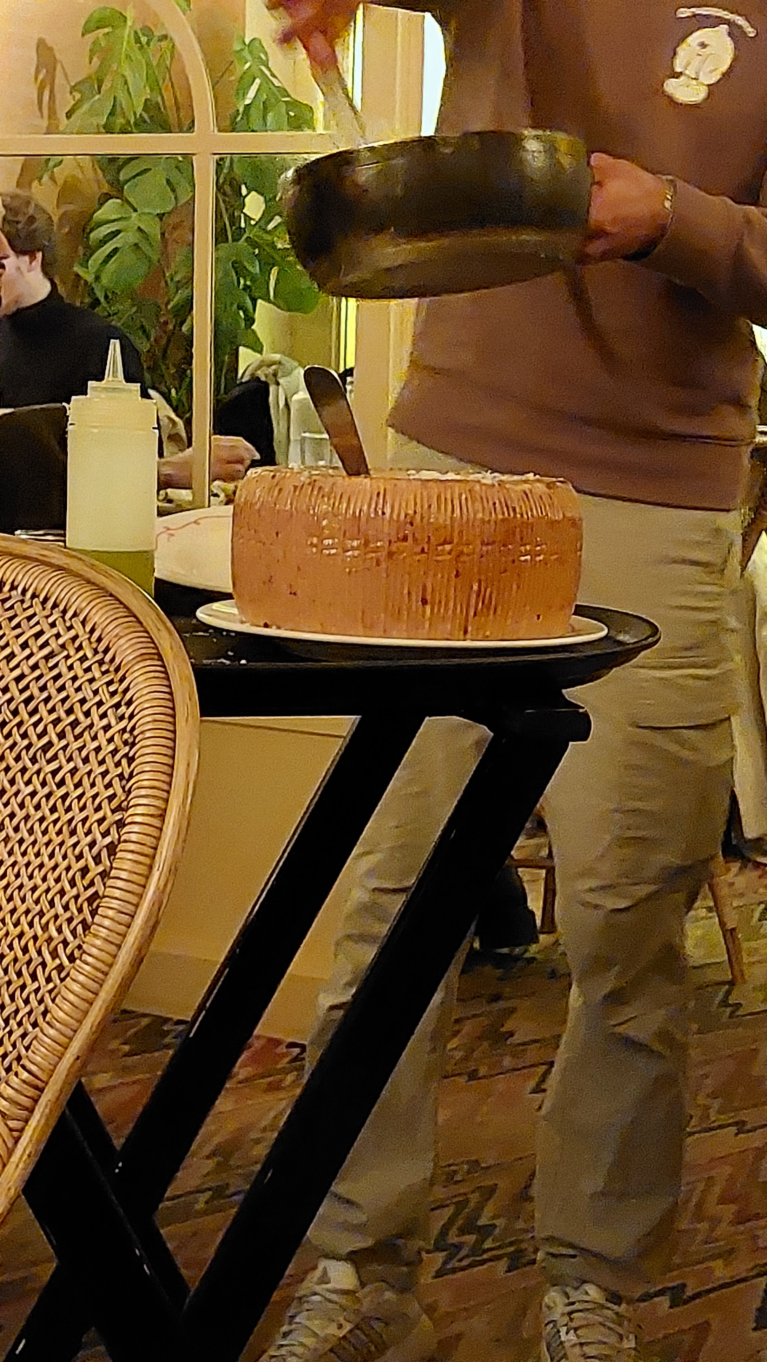 Qu'est ce qu'on a bien mangé ! On commence avec des petits spritz, la base. Comme entrée, trio de arancini et une fondue de fromage avec pain de campagne. On a ensuite tous les deux pris, le palt signature alla valentina. Les pâtes préparées dans la meule de pecorino. Une dinguerie