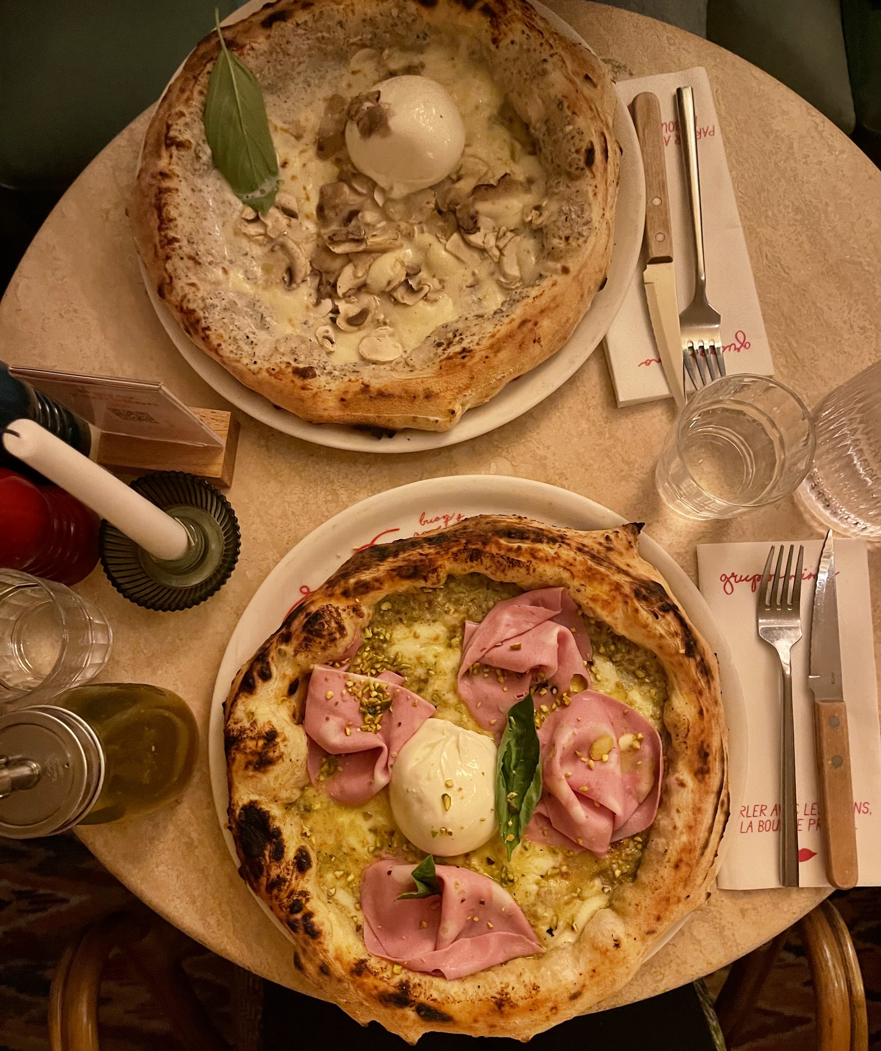 J’avais auparavant testé l’adresse dans le 17ème et j’en avais eu une très bonne expérience. Ce Gruppomimo a une décoration très intimiste, avec des tables en rond entouré de rideau, des lumières tamisés et un décor dans le thème. J’ai prit la Margherita qui était très grande et bonne, très généreuse en fromage. (Ils ont de jolis boite à emporter si vous ne terminez pas votre plat) Le tiramisu à la pistache était bonne mais je l’ai trouvé moins onctueuse et crémeuse que la classique. Le service en général est sympathique et assez rapide pour le plat mais les serveurs s’éparpillent par moment entre toutes les tables. Quand j’ai terminé mon plat le serveur m’avait demandé si je souhaitai l’addition sans savoir que j’avais commandé un dessert. Après cela j’ai attendu 30min pour mon dessert, ce qui est compréhensible puisque la salle était remplie.