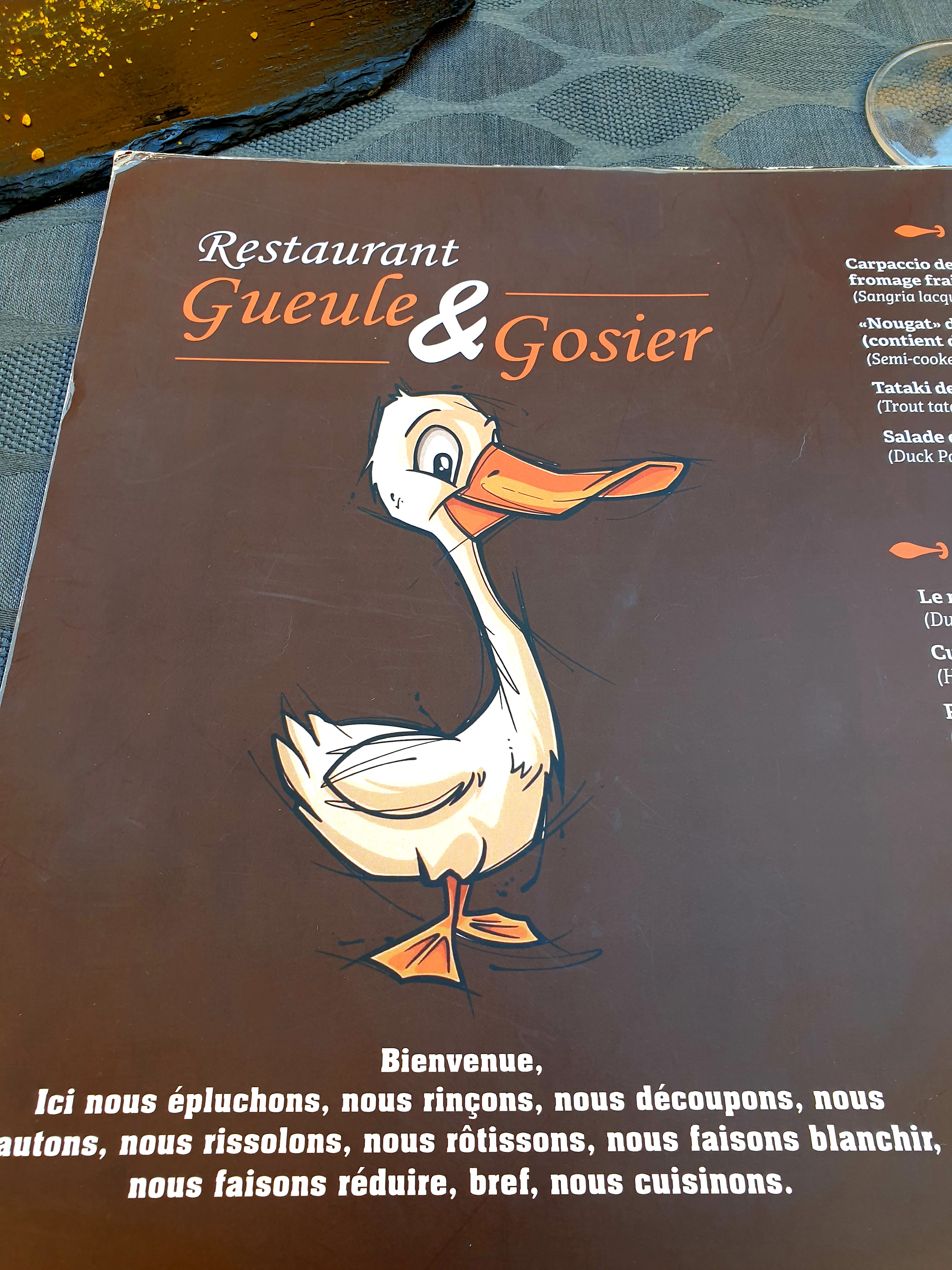 Gueule et Gosier: un nom qui respire le terroir. Voici mon premier avis culinaire, et j'ose espérer, amis épicuriens, qu'il vous éclairera. Nous y avons partagé un repas ce midi avec ma compagne et nous avons été tous deux pleinement conquis. Les assiettes proposées sont parfaitement élaborées, et ce avec des produits frais et locaux. Un délice. Le cadre est tout à fait charmant, bien aidé par la splendeur de Sarlat. Le serveur s'est montré très professionnel. Le tout pour un prix extrêmement raisonnable au vu de la qualité gastronomique des plats. Seuls petit hics: l'entrée apportée en même temps que l'apéritif et la fraîcheur du vin rouge. En dépit de cela, Gueule & Gosier obtiendra tout de même la note de cinq. Merci.