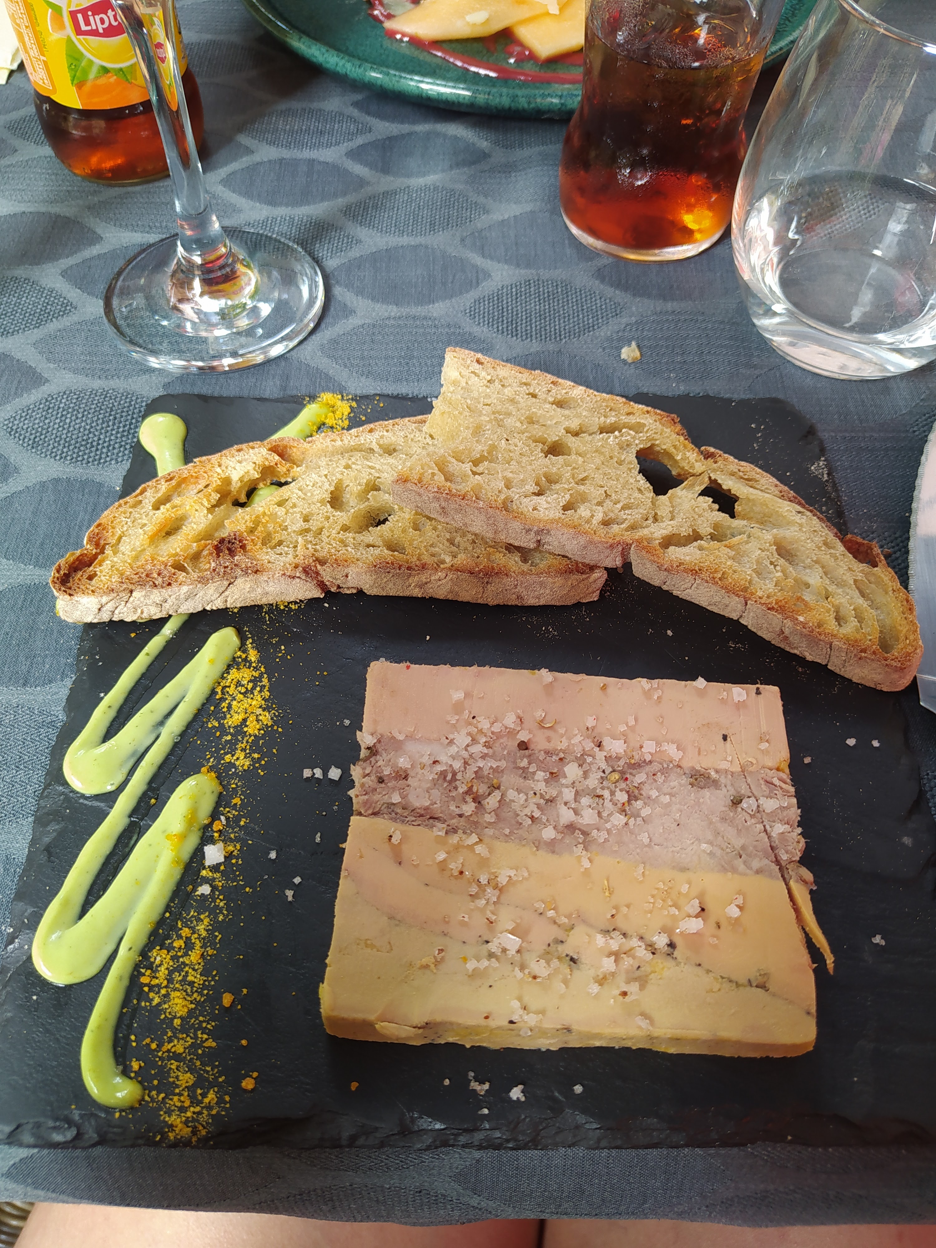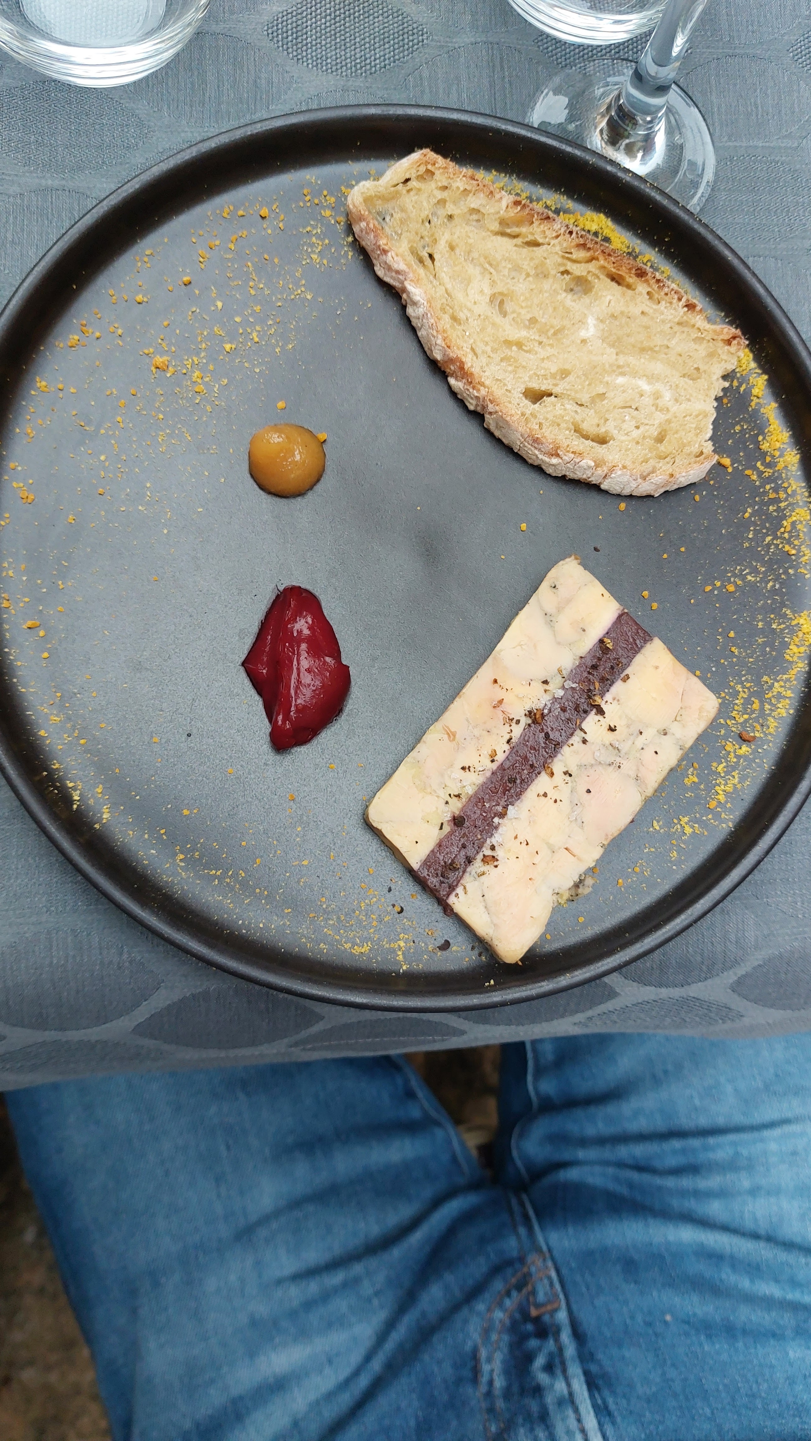 On m'avait beaucoup vanté le lieu, j'en attendais beaucoup. C'est un endroit qui ne tente pas l'arnaque à l'authenticité et c'est plaisant à sarlat malgré un certain laxisme dans les appellations de la carte. La fondue au brie en entrée à été une très bonne surprise. Le quasi de veau m'a laissé plus partagé, une sauce à la truffe, une autre au citron, un beurre truffé, des légumes lactofermentés, des patates sarladaises ( il va vraiment falloir se mettre d'accord sur cette appellation) et beaucoup d'aneth frais qui a tendance à noyer le reste, bref un plat très compliqué dont je n'ai sans doute pas été capable de saisir l'opportunité de toutes les nuances. Indubitablement un restaurant à faire ne serait ce que parcequ'il change des micro ondes à ouvre boîte trop présents dans sarlat. Il gagnerait à comprendre que la fusion est un but et pas une doxa.