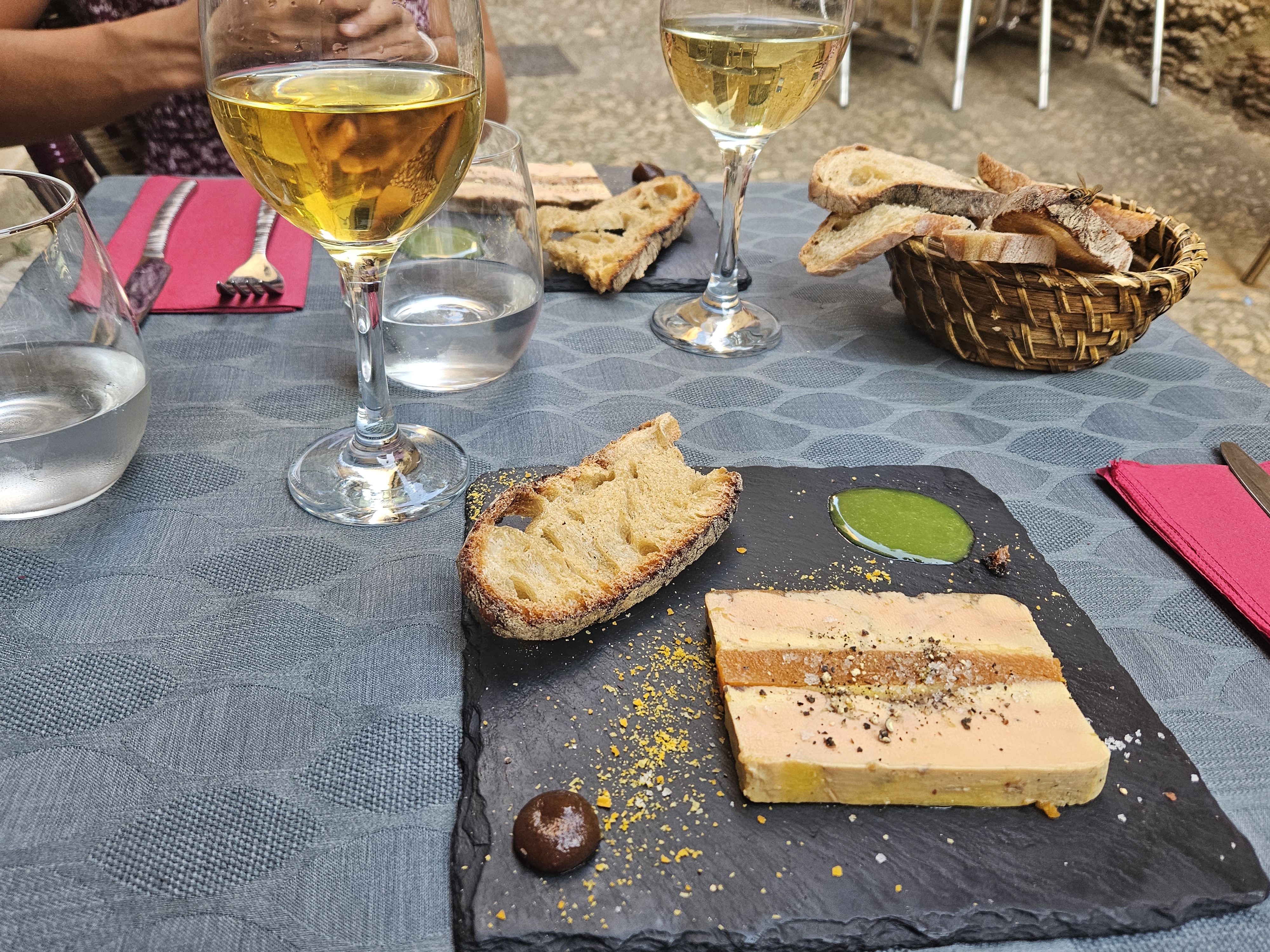 Très belle découverte que ce restaurant bistronomique dans le vieux Sarlat.A l écart,donc terrasse plutôt tranquille.Nous vous conseillons le menu,sin foie gras et surtout son houmous de petits pois,oeuf et gaufre au sarrasin.une turie😊