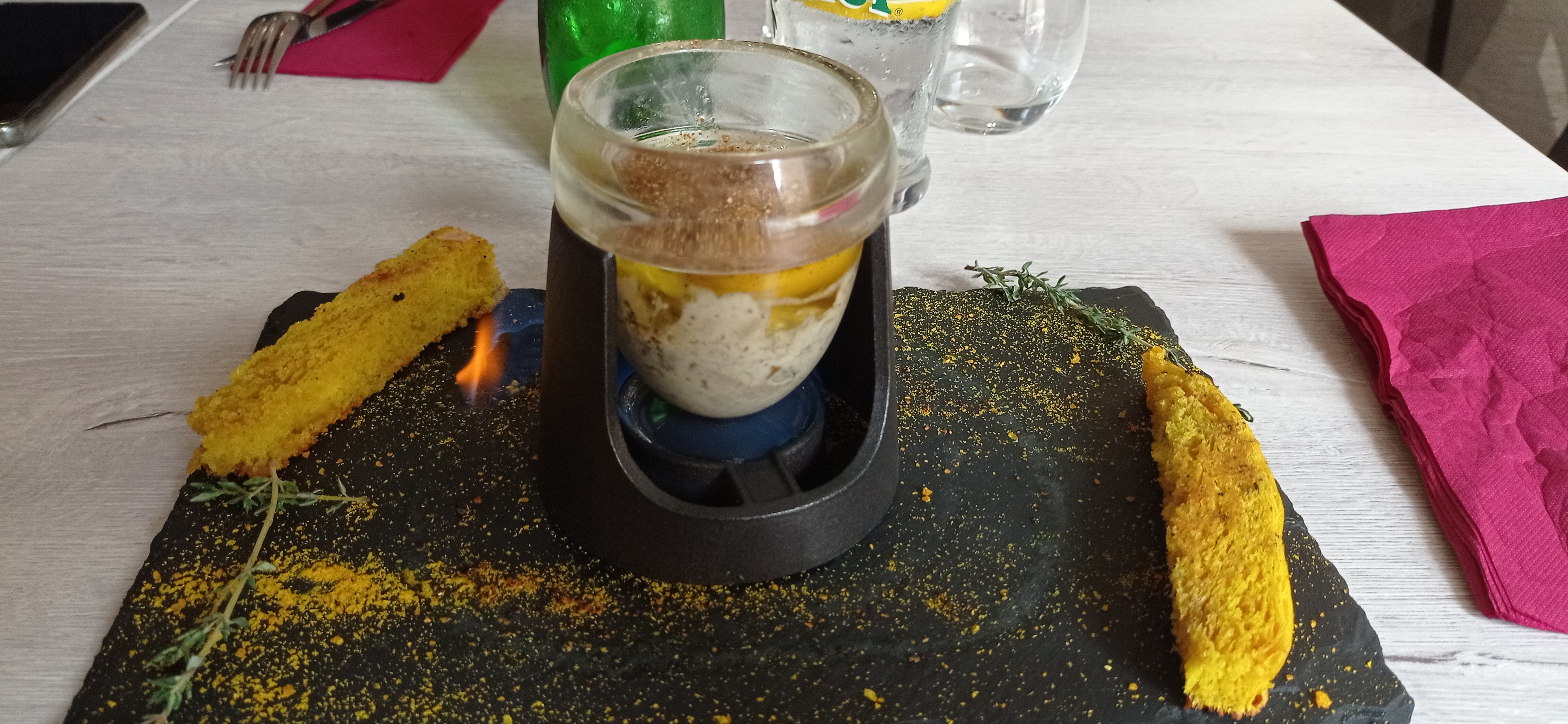 A NE PAS MANQUER !! Nous avons adoré! Repas entre amis. Une explosion de saveurs. Nous avons été accueillis avec une mise en bouche (un velouté de panais). Le serveur et la serveuse étaient très sympathiques. Les plats étaient tous annoncés et expliqués. Nous avons pu goûter des produits du coin mais cuisinés avec beaucoup d'originalité ! Si vous voulez manger quelque chose que vous ne goûteriez pas chez vous c'est le lieu parfait ! Un magret en croûte/crumble de cacao, gel framboise saké.... Le clou du spectacle : l'oeuf cocotte Aix escargots cuit à table. On a ADORÉ !!!!