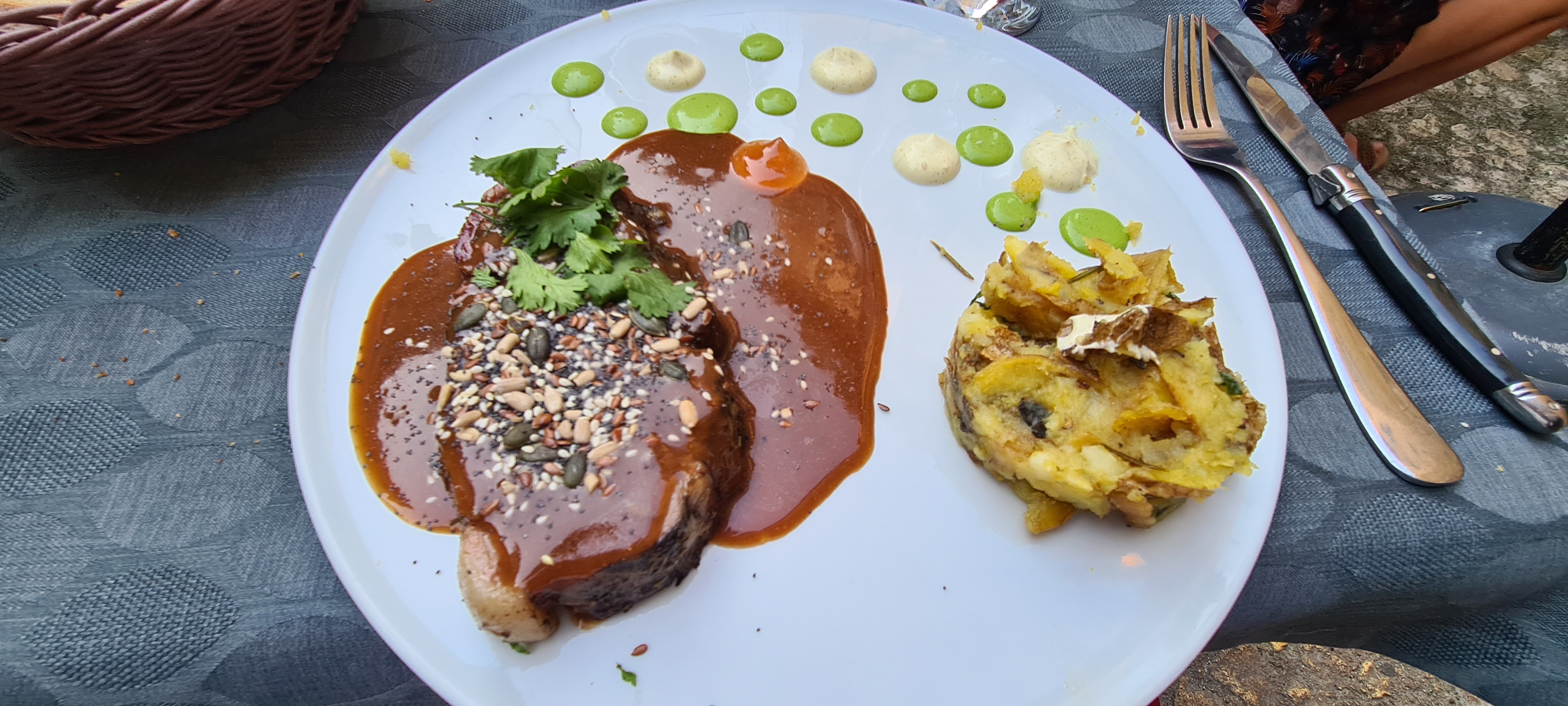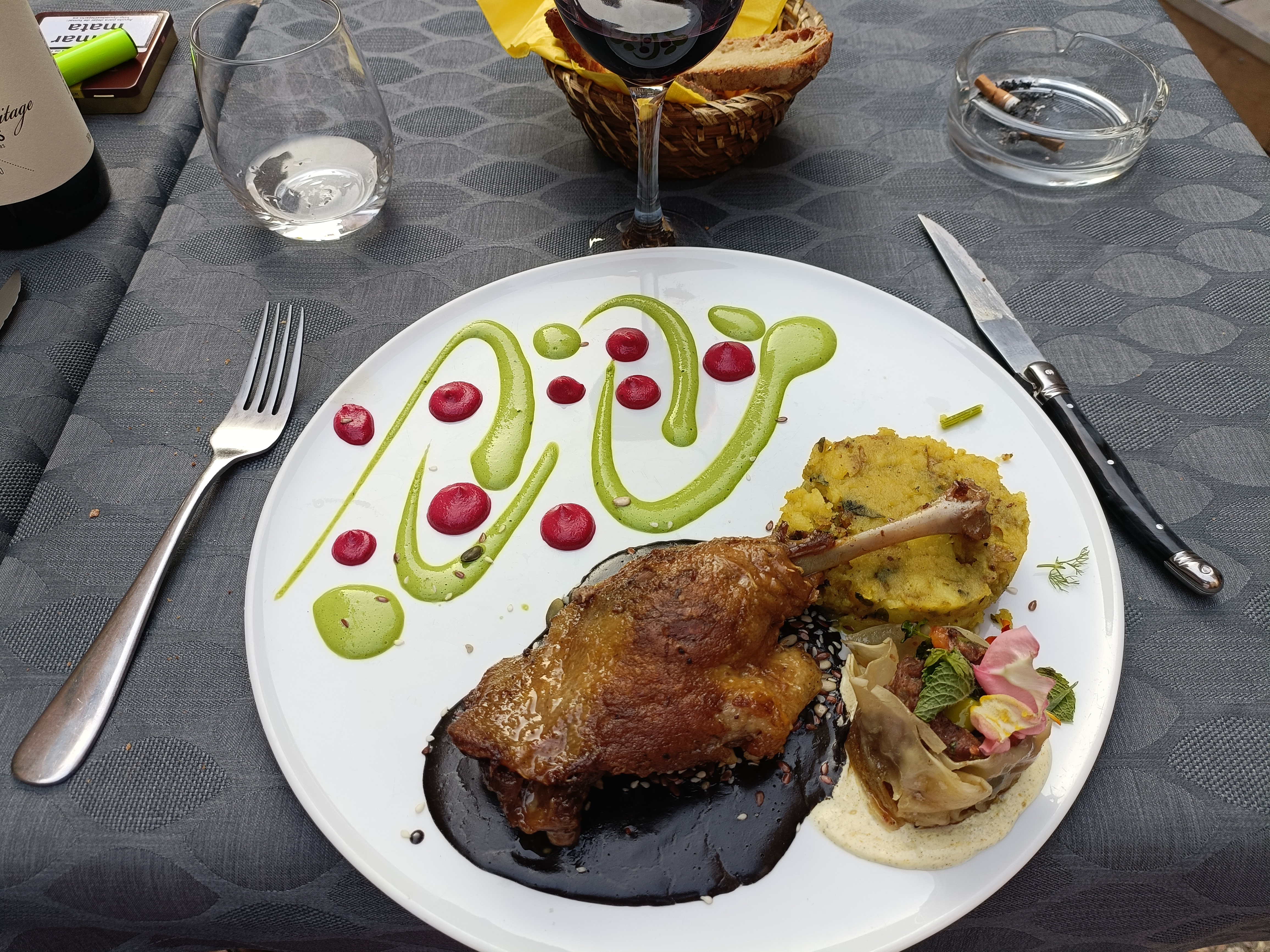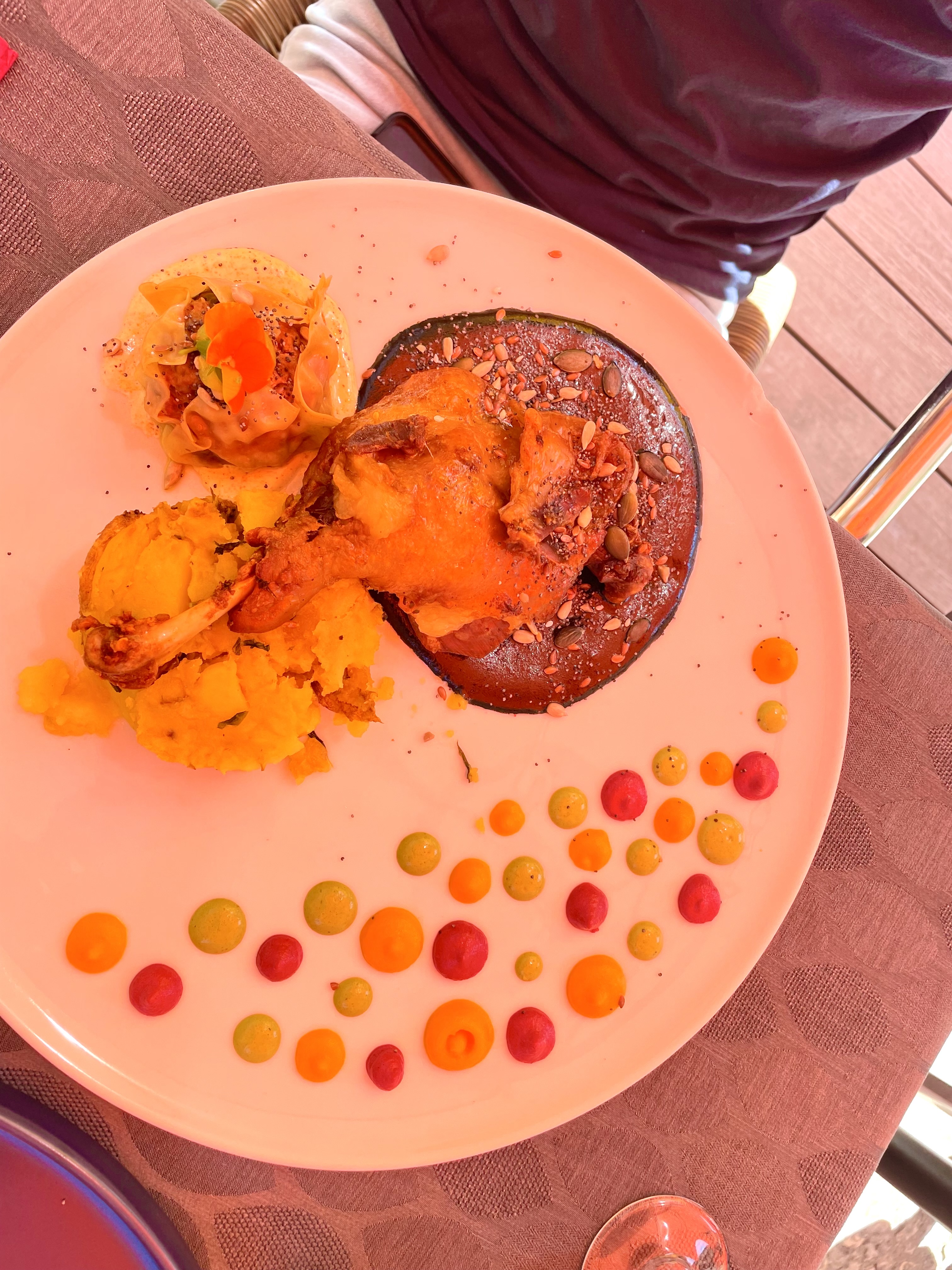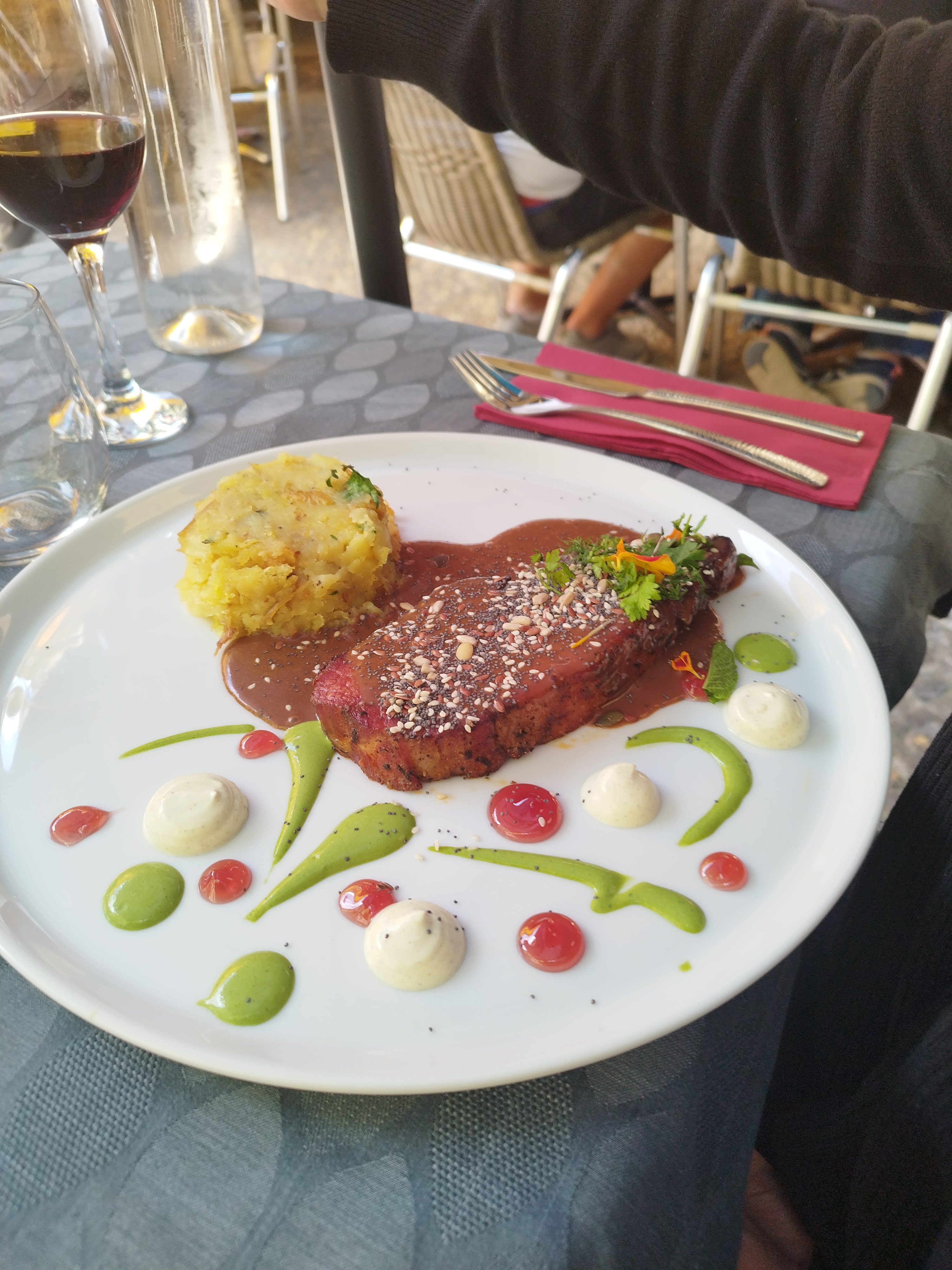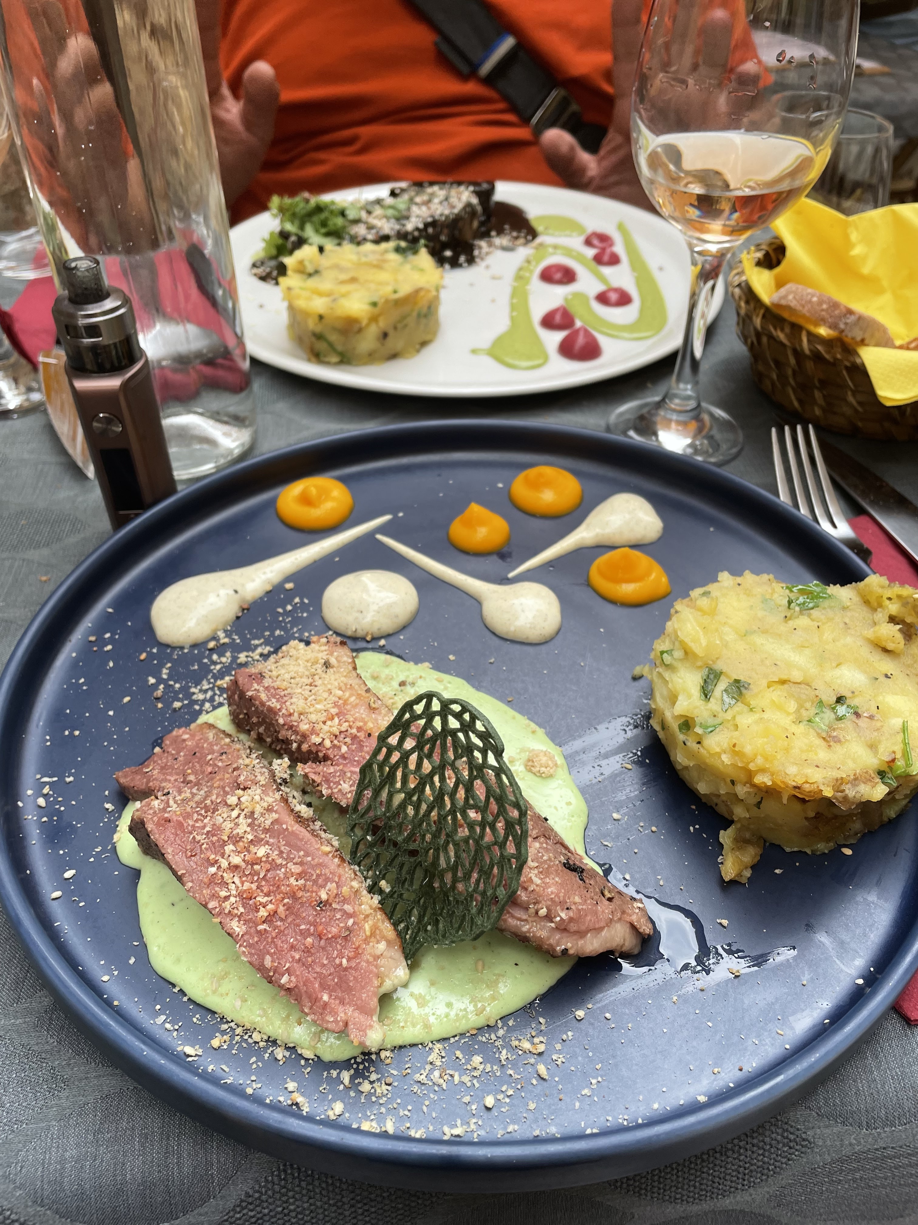 J'ai vraiment adoré ce restaurant. Nous avons mangé en extérieur, terrasse très bien faite. Les petits amuse bouche offert à l'ail noir délicieux. Je vous recommande les yeux fermés le magret de canard avec sa sauce de patate douce, une merveille. Nous reviendrons pour le plus grand plaisir de nos papilles.