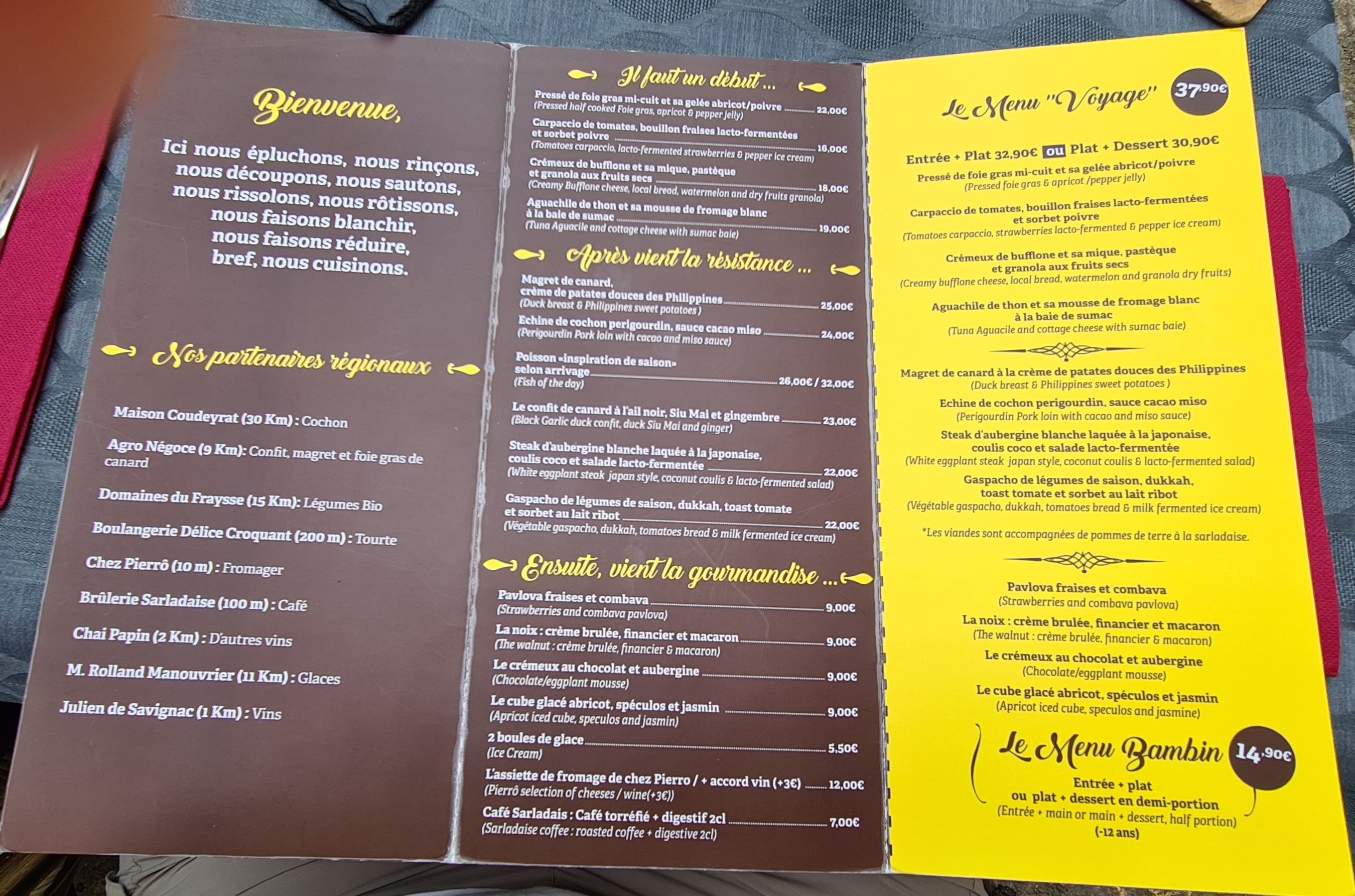 Mon mari et moi nous sommes régalés. Très bonne cuisine , découverte de nouvelles saveurs et de mélanges de saveurs ..excellent.. dommage que nous étions de passage .. on serait revenu souvent .