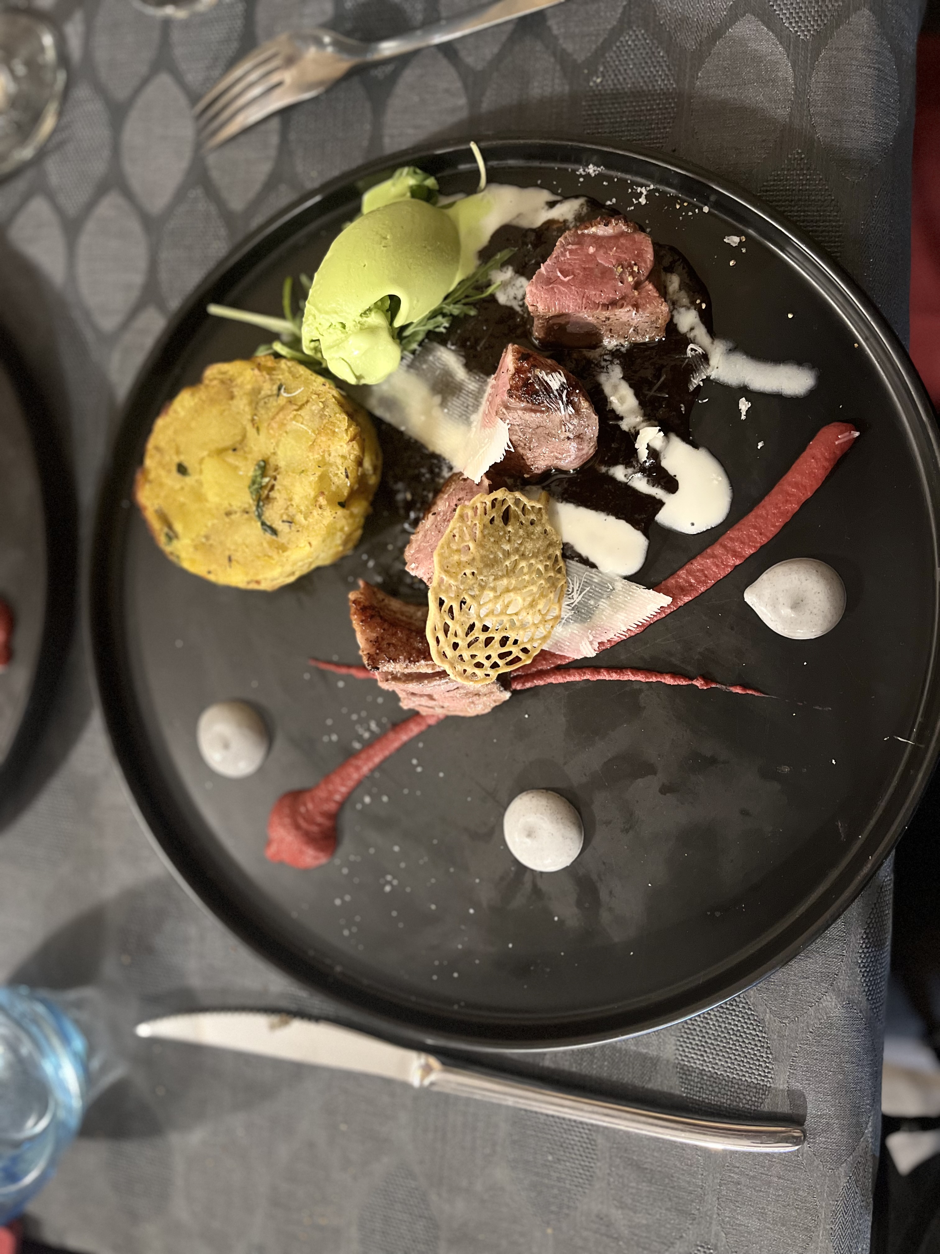 Très beaux et bons plats, beaucoup de goûts complexes, tout est travaillé, les viandes très bonnes, les assiettes ressemblent à des tableaux avec des combinaisons de goûts très variés dispersés aux 4 coins de l'assiette